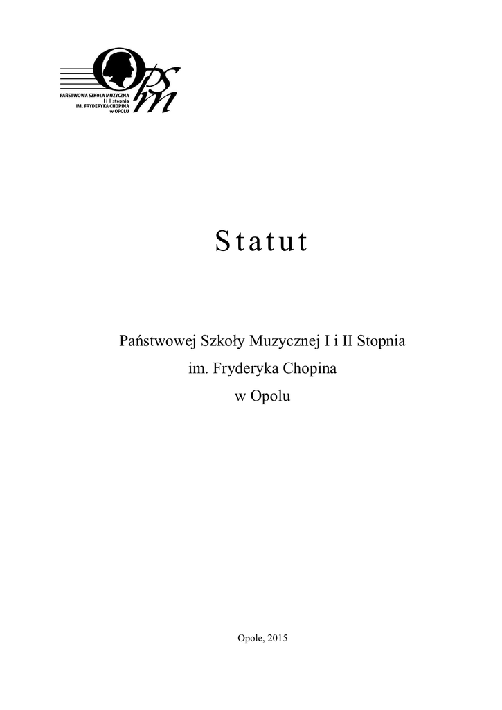Statut Państwowej Szkoły Muzycznej I i II Stopnia im. Fryderyka Chopina w Opolu Opole, 2015 Statut Państwowej Szkoły Muzycznej I i II Stopnia im. Fryderyka Chopina w Opolu Spis treści I. POSTANOWIENIA OGÓLNE ....................................................................................................................................... 5 II. CELE I ZADANIA SZKOŁY ........................................................................................................................................ 6 III. WEWNĄTRZSZKOLNY SYSTEM OCENIANIA ..................................................................................................... 7 Organizacja, forma i skala ocen ...................................................................................................................................... 7 Kryteria ocen ................................................................................................................................................................... 9 Sposoby sprawdzania osiągnięć edukacyjnych ucznia .................................................................................................. 10 ocenianie z przedmiotów ogólnomuzycznych .......................................................................................................... 10 ocenianie bieżące ...................................................................................................................................................... 11 zadania domowe ........................................................................................................................................................ 12 zasady przeprowadzania sprawdzianów pisemnych ................................................................................................. 13 ocenianie z przedmiotów edukacyjnych artystycznych ............................................................................................ 13 ocenianie bieżące z przedmiotu (instrumentu) głównego ......................................................................................... 14 Klasyfikacja śródroczna ................................................................................................................................................ 15 Klasyfikacja końcoworoczna ........................................................................................................................................ 15 Egzaminy promocyjne .................................................................................................................................................. 17 Egzaminy klasyfikacyjne .............................................................................................................................................. 19 Egzamin poprawkowy ................................................................................................................................................... 20 Promowanie uczniów i ukończenie szkoły ................................................................................................................... 22 Zwolnienia z zajęć artystycznych ................................................................................................................................. 22 Egzamin dyplomowy .................................................................................................................................................... 23 Egzamin dyplomowy eksternistyczny ........................................................................................................................... 27 Zasady wystawiania świadectw z wyróżnieniem .......................................................................................................... 27 Skreślenia z listy uczniów z powodu nieuzyskania promocji ....................................................................................... 27 IV. DZIAŁALNOŚĆ INNOWACYJNA I EKSPERYMENTALNA ............................................................................... 28 V. FORMY OPIEKI I POMOCY UCZNIOM .................................................................................................................. 28 VI. WSPÓŁPRACA SZKOŁY Z RODZICAMI (PRAWNYMI OPIEKUNAMI) .......................................................... 29 VII ZADANIA SEKCJI .................................................................................................................................................... 29 VIII. WSPÓŁPRACA SZKOŁY Z JEDNOSTKAMI SAMORZĄDU TERYTORIALNEGO ....................................... 30 IX. ZAJĘCIA NADOBOWIĄZKOWE DLA UCZNIÓW ............................................................................................... 31 X. WSPÓŁDZIAŁANIE SZKOŁY Z PORADNIAMI PSYCHOLOGICZNO-PEDAGOGICZNYMI .......................... 31 XI. ORGANY SZKOŁY I ICH KOMPETENCJE ........................................................................................................... 31 XIII. ORGANIZACJA SZKOŁY ..................................................................................................................................... 36 XII. BIBLIOTEKA ........................................................................................................................................................... 37 XIII. ORGANIZACJA NAUCZANIA ............................................................................................................................. 38 Zasady kwalifikowania uczniów do odpowiedniego działu .......................................................................................... 39 Sposoby kwalifikowania uczniów do zespołów, zespołów instrumentalnych i na zajęcia indywidualne ..................... 39 Zasady zwiększania i zmniejszania uczniom wymiaru zajęć z przedmiotu głównego, instrumentu głównego, zespołu instrumentalnego i zajęć indywidualnych ...............................................................