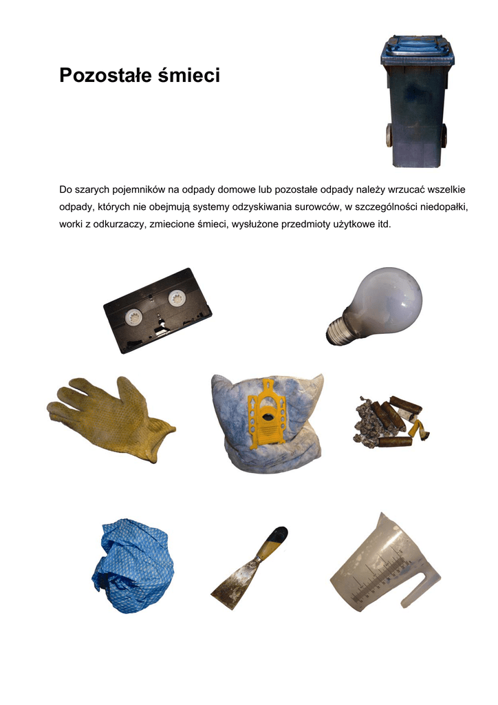 Pozostałe śmieci Do szarych pojemników na odpady domowe lub pozostałe odpady należy wrzucać wszelkie odpady, których nie obejmują systemy odzyskiwania surowców, w szczególności niedopałki, worki z odkurzaczy, zmiecione śmieci, wysłużone przedmioty użytkowe itd.