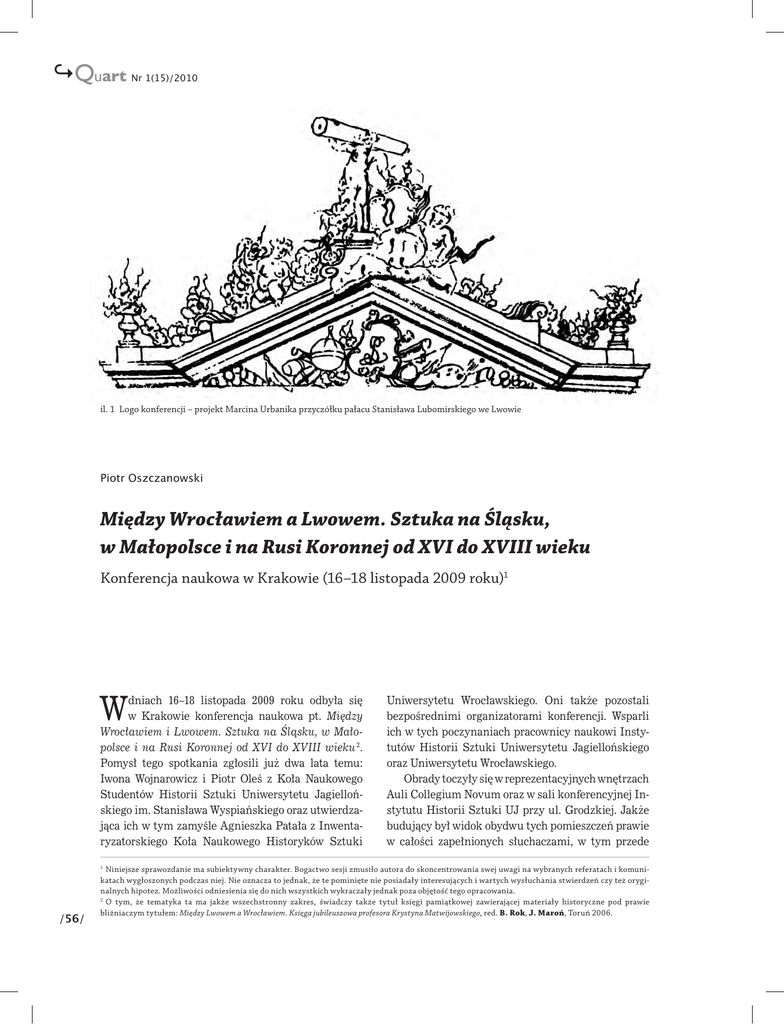 ↪Quart Nr 1(15)/2010 il. 1 Logo konferencji – projekt Marcina Urbanika przyczółku pałacu Stanisława Lubomirskiego we Lwowie Piotr Oszczanowski Między Wrocławiem a Lwowem. Sztuka na Śląsku, w Małopolsce i na Rusi Koronnej od XVI do XVIII wieku Konferencja naukowa w Krakowie (16–18 listopada 2009 roku)1 W dniach 16–18 listopada 2009 roku odbyła się w Krakowie konferencja naukowa pt. Między Wrocławiem i Lwowem. Sztuka na Śląsku, w Małopolsce i na Rusi Koronnej od XVI do XVIII wieku 2. Pomysł tego spotkania zgłosili już dwa lata temu: Iwona Wojnarowicz i Piotr Oleś z Koła Naukowego Studentów Historii Sztuki Uniwersytetu Jagiellońskiego im. Stanisława Wyspiańskiego oraz utwierdzająca ich w tym zamyśle Agnieszka Patała z Inwentaryzatorskiego Koła Naukowego Historyków Sztuki Niniejsze sprawozdanie ma subiektywny charakter. Bogactwo sesji zmusiło autora do skoncentrowania swej uwagi na wybranych referatach i komunikatach wygłoszonych podczas niej. Nie oznacza to jednak, że te pominięte nie posiadały interesujących i wartych wysłuchania stwierdzeń czy też oryginalnych hipotez. Możliwości odniesienia się do nich wszystkich wykraczały jednak poza objętość tego opracowania. 2 O tym, że tematyka ta ma jakże wszechstronny zakres, świadczy także tytuł księgi pamiątkowej zawierającej materiały historyczne pod prawie bliźniaczym tytułem: Między Lwowem a Wrocławiem. Księga jubileuszowa profesora Krystyna Matwijowskiego, red. B. Rok, J. Maroń, Toruń 2006. 1 /56/ Uniwersytetu Wrocławskiego. Oni także pozostali bezpośrednimi organizatorami konferencji. Wsparli ich w tych poczynaniach pracownicy naukowi Instytutów Historii Sztuki Uniwersytetu Jagiellońskiego oraz Uniwersytetu Wrocławskiego. Obrady toczyły się w reprezentacyjnych wnętrzach Auli Collegium Novum oraz w sali konferencyjnej Instytutu Historii Sztuki UJ przy ul. Grodzkiej. Jakże budujący był widok obydwu tych pomieszczeń prawie w całości zapełnionych słuchaczami, w tym przede Piotr Oszczanowski / Konferencja naukowa Między Wrocławiem a Lwowem wszystkim obecnością ogromnej liczby młodych ludzi, studentów, magistrantów i doktorantów. W tym należy dopatrywać się sukcesu całego przedsięwzięcia – nie tylko ze strony studentów wyszedł pomysł takiego spotkania, także i oni okazali się nie tylko głównymi jego organizatorami, ale także adresatami. Pozbawioną precedensu – jak się okazuje – była sama idea tak ścisłej współpracy pomiędzy Instytutami Historii Sztuki Uniwersytetu Jagiellońskiego oraz Uniwersytetu Wrocławskiego. Konferencja była pierwszą tego rodzaju kooperacją oraz przedsięwzięciem, które „wzbudziło” kolejne wspólne inicjatywy (m.in. wydawniczą). To napawa optymizmem, zwłaszcza jeżeli uświadomimy sobie, że w dzisiejszych czasach bez porównania łatwiej podejmować się ambitnych wyzwań w ramach działań konsorcyjnych. Obecnie jesteśmy wręcz skazani na budowanie wokół nowych inicjatyw badawczych organizacyjnych „platform”, które wywołują synergię działania i pożądanych efektów. Atrakcyjność zaproponowanej przez organizatorów tematyki potwierdziło nadzwyczajne zainteresowanie tym przedsięwzięciem naukowym. Szeroko „otworzone” spektrum tematyczne zaowocowało zgłoszeniem chęci udziału w konferencji przeszło 50 referentów, głównie z ośrodków akademickich, tj. Instytutów i Katedr Historii Sztuki (Uniwersytetu Jagiellońskiego, Uniwersytetu Wrocławskiego, Uniwersytetu Warszawskiego, Katolickiego Uniwersytetu Lubelskiego Jana Pawła II, Uniwersytetu Łódzkiego) oraz warszawskich i krakowskich oddziałów Instytutu Sztuki Polskiej Akademii Nauk czy też placówek muzealnych (Muzeum Narodowego w Warszawie, Zamku Królewskiego na Wawelu oraz Muzeum Diecezjalnego w Sandomierzu). Udział w tym przedsięwzięciu, jako słuchaczy i dyskutantów, licznych gości z Lwowa, a wśród referentów prof. dra arch. Petro Rychkova z Wydziału Architektury Ukraińskiego Państwowego Uniwersytetu Gospodarki Wodnej i Zasobów Przyrody w Równem, „awansowało” konferencję nawet do rangi wydarzenia międzynarodowego. Sesja z założenia była poświęcona sztuce trzech regionów artystycznych – Śląska, Małopolski i Kresów Południowo-Wschodnich w czasach nowożytnych. Jej celem było m.in. ukazanie podobieństw i różnic oraz wzajemnych związków i kontaktów artystycznych wspomnianych terenów, w tym funkcjonowania tych samych schematów kompozycyjnych, wzorów, wpro3 il. 2 Plakat konferencji Między Wrocławiem a Lwowem wadzania nowych rozwiązań, migracji artystów i dzieł sztuki. Referaty prezentowały zagadnienia dotyczące szeroko pojętych związków artystycznych pomiędzy rzeczonymi regionami artystycznymi, choć większość z wypowiedzi dotyczyło tylko jednego z nich. Ponadto na sztukę Śląska i Kresów spojrzano jako na tereny pogranicza kulturowego, a w niektórych przypadkach jako swoistego pomostu łączącego przede wszystkim Małopolskę z odleglejszymi obszarami Europy. Jednym z zadań sesji było umożliwienie wspólnego prezentowania wyników badań prowadzonych w różnych ośrodkach, zarówno przez naukowców, jak i studentów studiów doktoranckich i magisterskich, wymiany doświadczeń i twórczej dyskusji 3. Otwierająca konferencję wypowiedź prof. dra hab. Jana K. Ostrowskiego, dyrektora Zamku Królewskiego na Wawelu oraz kierownika i redaktora Akapit ten i powyższe stwierdzenia zawarte były w zaproszeniu skierowanym do uczestników konferencji autorstwa organizatorów konferencji. /57/ ↪Quart Nr 1(15)/2010 Inwentaryzacji zabytków sztuki sakralnej na ziemiach wschodnich dawnej Rzeczypospolitej, mimo kurtuazyjnej próby odżegnywania się przez autora od chęci wygłaszania „słowa wstępnego”, stanowiła znakomite wprowadzenie w tematykę obrad. Utwierdziła uczestników i słuchaczy w głębokim sensie organizacji tego rodzaju wymiany my