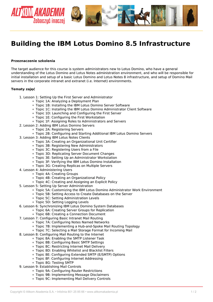 Building the IBM Lotus Domino 8.5 Infrastructure Przeznaczenie szkolenia The target audience for this course is system administrators new to Lotus Domino, who have a general understanding of the Lotus Domino and Lotus Notes administration environment, and who will be responsible for initial installation and setup of a basic Lotus Domino and Lotus Notes 8 infrastructure, and setup of Domino Mail servers in the corporate intranet and extranet (i.e. Internet) environments. Tematy zajęć 1. Lesson 1: Setting Up the First Server and Administrator Topic 1A: Analyzing a Deployment Plan Topic 1B: Installing the IBM Lotus Domino Server Software Topic 1C: Installing the IBM Lotus Domino Administrator Client Software Topic 1D: Launching and Configuring the First Server Topic 1E: Configuring the First Workstation Topic 1F: Assigning Roles to Administrators and Servers 2. Lesson 2: Adding IBM Lotus Domino Servers Topic 2A: Registering Servers Topic 2B: Configuring and Starting Additional IBM Lotus Domino Servers 3. Lesson 3: Adding IBM Lotus Notes Clients Topic 3A: Creating an Organizational Unit Certifier Topic 3B: Registering New Administrators Topic 3C: Registering Users from a File Topic 3D: Replicating Server Document Changes Topic 3E: Setting Up an Administrator Workstation Topic 3F: Verifying the IBM Lotus Domino Installation Topic 3G: Creating Replicas on Multiple Servers 4. Lesson 4: Administering Users Topic 4A: Creating Groups Topic 4B: Creating an Organizational Policy Topic 4C: Creating and Assigning an Explicit Policy 5. Lesson 5: Setting Up Server Administration Topic 5A: Customizing the IBM Lotus Domino Administrator Work Environment Topic 5B: Setting Access to Create Databases on the Server Topic 5C: Setting Administration Levels Topic 5D: Setting Logging Levels 6. Lesson 6: Synchronizing IBM Lotus Domino System Databases Topic 6A: Creating Server Groups for Replication Topic 6B: Creating a Connection Document 7. Lesson 7: Configuring Basic Intranet Mail Routing Topic 7A: Configuring Notes Named Networks Topic 7B: Implementing a Hub-and-Spoke Mail Routing Topology Topic 7C: Selecting a Mail Storage Format for Incoming Mail 8. Lesson 8: Configuring Mail Routing to the Internet Topic 8A: Enabling the SMTP Listener Task Topic 8B: Configuring Basic SMTP Settings Topic 8C: Restricting Internet Mail Delivery Topic 8D: Enabling Whitelist and Blacklist Filters Topic 8E: Configuring Extended SMTP (E/SMTP) Options Topic 8F: Configuring Internet Addressing Topic 8G: Testing SMTP 9. Lesson 9: Establishing Mail Controls Topic 9A: Configuring Router Restrictions Topic 9B: Implementing Message Disclaimers Topic 9C: Implementing Mail Delivery Controls Copyright © Altkom Akademia S.A. • Infolinia 801 25 85 66 • www.altkomakademia.pl 1/2 Topic 9D: Implementing Mail Transfer Controls Topic 9E: Configuring Multiple Server Mailboxes 10. Lesson 10: Implementing Mail Rules and Storage Limits Topic 10A: Creating and Activating a Server Mail Rule Topic 10B: Enabling Mail Journaling Topic 10C: Implementing Blacklist Tag and Whitelist Tag Mail Rule Conditions Topic 10D: Establishing Mail Quotas Topic 10E: Controlling Inbox Size with Inbox Maintenance Topic 10F: Archiving Mail 11. Lesson 11: Monitoring Mail Topic 11A: Verifying Routing and Checking Mail Delivery Topic 11B: Enabling Mail Statistics Topic 11C: Enabling Message Tracking Topic 11D: Configuring Message Recall 12. Lesson 12: Resolving Common Mail Routing Problems Topic 12A: Sending a Mail Trace Topic 12B: Restarting the Router Topic 12C: Forcing Mail Routing Topic 12D: Resolving Undelivered and Dead Mail Oczekiwane przygotowanie słuchaczy The prerequisites for this course include completion of the IBM Lotus Domino 8 System Administration Operating Fundamentals course (D8L75) or equivalent knowledge, skills, and experience. Metoda szkolenia Warsztaty Wykład Kod szkolenia D8L76G Czas trwania 2 dni / 14 h Poziom szkolenia Średniozaawansowany Autoryzacja Copyright © Altkom Akademia S.A. • Infolinia 801 25 85 66 • www.altkomakademia.pl 2/2