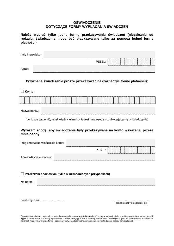 OŚWIADCZENIE DOTYCZĄCE FORMY WYPŁACANIA ŚWIADCZEŃ Należy wybrać tylko jedną formę przekazywania świadczeń (niezależnie od rodzaju, świadczenia mogą być przekazywane tylko za pomocą jednej formy płatności) Imię i nazwisko: PESEL: Adres: Przyznane świadczenie proszę przekazywać na (zaznaczyć formę płatności): Konto Nazwa banku: (poniższe wypełnić, jeżeli właścicielem konta jest inna osoba niż ubiegająca się o świadczenia) Wyrażam zgodę, aby świadczenia były przekazywane na konto wskazanej przeze mnie osoby: Imię i nazwisko właściciela konta: PESEL: Adres właściciela konta: Przekazem pocztowym (tylko w uzasadnionych przypadkach) Na adres: Kołobrzeg, dnia ………………………. …………………………………… (podpis osoby ubiegającej się) Oświadczenie stanowi załącznik do wniosków o ustalenie uprawnień do świadczeń pomocy materialnej dla uczniów, określające formę i sposób wypłaty świadczenia dla osoby uprawnionej. Osoba ubiegająca się o wypłatę świadczenia zobowiązana jest do informowania o wszelkich zmianach mających wpływ na formę i sposób wypłaty świadczenia (np. zmiana numeru konta, banku, adresu zamieszkania).