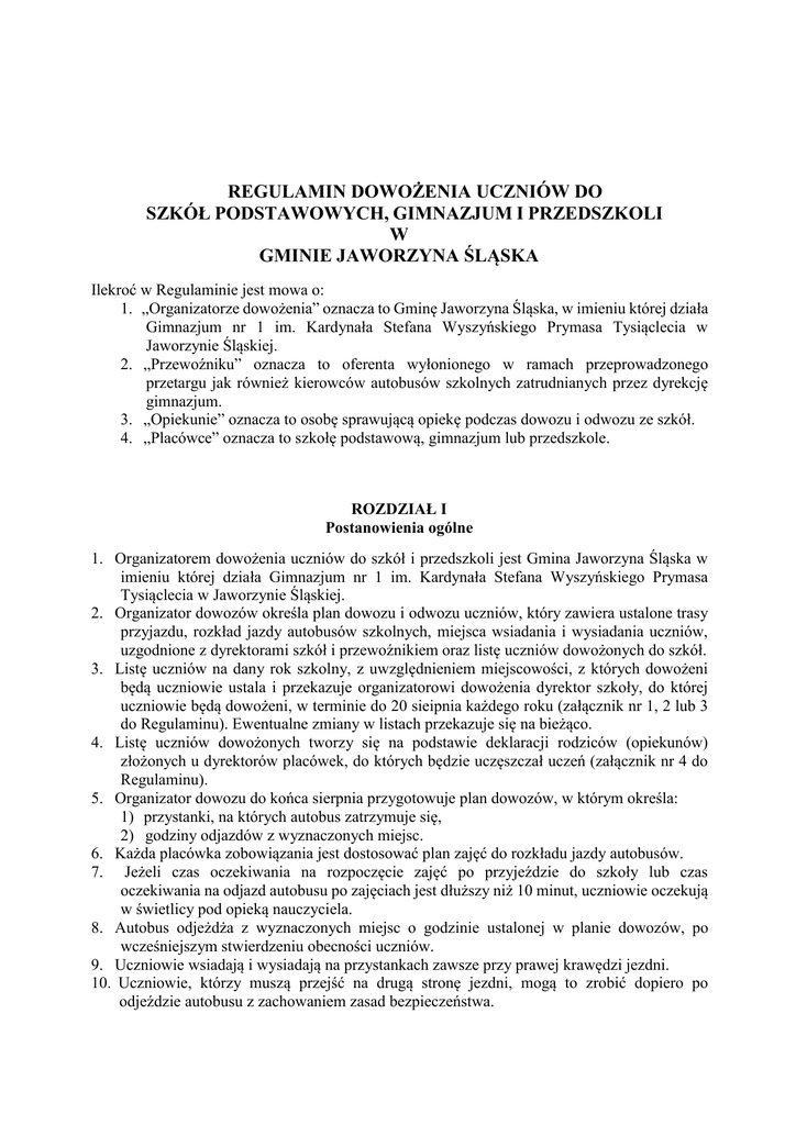 Załącznik nr 1 do Zarządzenia nr 112/B/2013 Burmistrza Jaworzyny Śląskiej z dnia 2 września 2013 r. REGULAMIN DOWOŻENIA UCZNIÓW DO SZKÓŁ PODSTAWOWYCH, GIMNAZJUM I PRZEDSZKOLI W GMINIE JAWORZYNA ŚLĄSKA Ilekroć w Regulaminie jest mowa o: 1. „Organizatorze dowożenia” oznacza to Gminę Jaworzyna Śląska, w imieniu której działa Gimnazjum nr 1 im. Kardynała Stefana Wyszyńskiego Prymasa Tysiąclecia w Jaworzynie Śląskiej. 2. „Przewoźniku” oznacza to oferenta wyłonionego w ramach przeprowadzonego przetargu jak również kierowców autobusów szkolnych zatrudnianych przez dyrekcję gimnazjum. 3. „Opiekunie” oznacza to osobę sprawującą opiekę podczas dowozu i odwozu ze szkół. 4. „Placówce” oznacza to szkołę podstawową, gimnazjum lub przedszkole. ROZDZIAŁ I Postanowienia ogólne 1. Organizatorem dowożenia uczniów do szkół i przedszkoli jest Gmina Jaworzyna Śląska w imieniu której działa Gimnazjum nr 1 im. Kardynała Stefana Wyszyńskiego Prymasa Tysiąclecia w Jaworzynie Śląskiej. 2. Organizator dowozów określa plan dowozu i odwozu uczniów, który zawiera ustalone trasy przyjazdu, rozkład jazdy autobusów szkolnych, miejsca wsiadania i wysiadania uczniów, uzgodnione z dyrektorami szkół i przewoźnikiem oraz listę uczniów dowożonych do szkół. 3. Listę uczniów na dany rok szkolny, z uwzględnieniem miejscowości, z których dowożeni będą uczniowie ustala i przekazuje organizatorowi dowożenia dyrektor szkoły, do której uczniowie będą dowożeni, w terminie do 20 sieipnia każdego roku (załącznik nr 1, 2 lub 3 do Regulaminu). Ewentualne zmiany w listach przekazuje się na bieżąco. 4. Listę uczniów dowożonych tworzy się na podstawie deklaracji rodziców (opiekunów) złożonych u dyrektorów placówek, do których będzie uczęszczał uczeń (załącznik nr 4 do Regulaminu). 5. Organizator dowozu do końca sierpnia przygotowuje plan dowozów, w którym określa: 1) przystanki, na których autobus zatrzymuje się, 2) godziny odjazdów z wyznaczonych miejsc. 6. Każda placówka zobowiązania jest dostosować plan zajęć do rozkładu jazdy autobusów. 7. Jeżeli czas oczekiwania na rozpoczęcie zajęć po przyjeździe do szkoły lub czas oczekiwania na odjazd autobusu po zajęciach jest dłuższy niż 10 minut, uczniowie oczekują w świetlicy pod opieką nauczyciela. 8. Autobus odjeżdża z wyznaczonych miejsc o godzinie ustalonej w planie dowozów, po wcześniejszym stwierdzeniu obecności uczniów. 9. Uczniowie wsiadają i wysiadają na przystankach zawsze przy prawej krawędzi jezdni. 10. Uczniowie, którzy muszą przejść na drugą stronę jezdni, mogą to zrobić dopiero po odjeździe autobusu z zachowaniem zasad bezpieczeństwa. 11. Za bezpieczeństwo uczniów w drodze z domu na przystanek oraz z przystanku do domu odpowiedzialność ponoszą ich rodzice (opiekunowie). Rodzice (opiekunowie) osobiście przyprowadzają i odbierają z przystanku dzieci z klas zerowych (lub młodsze uczęszczające do grup przedszkolnych przy Szkołach Podstawowych). W przypadku nieodebrania dziecka przez rodziców lub opiekunów dziecko będzie przebywało pod opieką dyrektora placówki do której uczęszcza. 12. Dzieci z klas zerowych (i młodsze) mają umieszczone w widocznym miejscu identyfikatory z imieniem i nazwiskiem, nazwą szkoły i adresem zamieszkania. 13. W autobusie opiekę nad uczniami dowożonymi sprawuje opiekun autobusu szkolnego, który jest odpowiedzialny za przestrzeganie zasad zawartych w niniejszym Regulaminie. 14. Opiekunowie współpracują z dyrektorami szkół w zakresie prawidłowej organizacji dowozów, zapewnienia uczniom bezpieczeństwa. 15. Szkoła ma obowiązek reagowania na zgłoszenia opiekunów lub przewoźników dotyczące negatywnych zachowań uczniów. Jeżeli podjęte działania szkoły nie przyniosą oczekiwanych rezultatów, dyrektor szkoły niezwłocznie powiadamia o tym fakcie rodziców ucznia i organizatora dowozu. 16. Dyrektorzy placówek z co najmniej 3 dniowym wyprzedzeniem informują organizatora o planowanych zmianach w organizacji dowozu związanych ze zmianą organizacji zajęć w szkole. Planowane zmiany przed zgłoszeniem powinny być uzgadniane z dyrektorami innych placówek, których uczniowie dowożeni są tym samym autobusem. 17. Za uszkodzenia wyposażenia w autobusie odpowiedzialność ponoszą rodzice (opiekunowie) dzieci i zobowiązani są do pokrycia kosztów naprawy. ROZDZIAŁ II Obowiązki opiekuna 1. Opiekun autobusu szkolnego jest odpowiedzialny za dowożonych uczniów: 1) od chwili ich wejścia do autobusu na wyznaczonym przystanku do chwili ich przekazania szkole, 2) od chwili odebrania ich ze szkoły do chwili opuszczenia przez ucznia autobusu na przystanku w miejscu jego zamieszkania. 2. Opiekun szkolnego autobusu przekazuje uczniów dowożonych z klas zerowych wyznaczonemu przez dyrektora szkoły nauczycielowi dyżurnemu. 3. Opiekun szkolnego autobusu informuje ustnie dyrektora szkoły o zachowaniu uczniów w autobusie. 4. Opiekun szkolnego autobusu odbiera uczniów od nauczyciela dyżurnego, wyznaczonego przez dyrektora szkoły i wpuszcza ich do autobusu zgodnie z ustalonym porządkiem. 5. Opiekun w trakcie wykonywania czynności związanych z opieką ściśle współpracuje z kierowcą pojazdu w zakresie bezpieczeństwa przewozu, a mianowicie: 1) w trakcie realizacji przewozu przebywa wewnątrz pojazdu, 2) w trakcie wsiadania uczniów, po zatrzymaniu pojazdu, wychodzi na zewnątrz, 3) sprawdza, czy w miejscu wsiadania nie występują jakiekolwiek zagrożenia dla wsiadających, 4) nadzoruje wsiadanie, służąc w razie potrzeby pomocą, przestrzegając zasady, że w pierwszej kolejności wsiadają uczniowie młodsi, 5) po wejściu uczniów do pojazdu opiekun sprawdza, czy uczniowie zajęli miejsca wg wskazania, 6) po zamknięciu drzwi pojazdu oraz sprawdzeniu, czy zamknięte są wszystkie drzwi, opiekun przekazuje sygnał kierowcy do kontynuowania jazdy, 7)