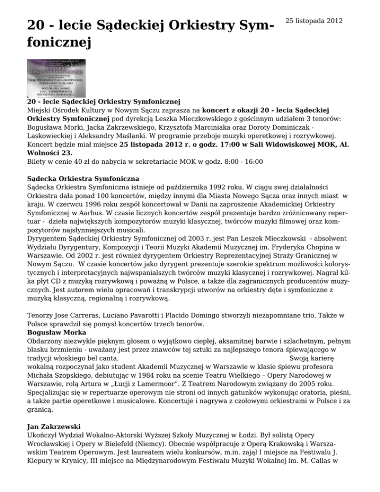 20 - lecie Sądeckiej Orkiestry Symfonicznej 25 listopada 2012 20 - lecie Sądeckiej Orkiestry Symfonicznej Miejski Ośrodek Kultury w Nowym Sączu zaprasza na koncert z okazji 20 - lecia Sądeckiej Orkiestry Symfonicznej pod dyrekcją Leszka Mieczkowskiego z gościnnym udziałem 3 tenorów: Bogusława Morki, Jacka Zakrzewskiego, Krzysztofa Marciniaka oraz Doroty Dominiczak Laskowieckiej i Aleksandry Maślanki. W programie przeboje muzyki operetkowej i rozrywkowej. Koncert będzie miał miejsce 25 listopada 2012 r. o godz. 17:00 w Sali Widowiskowej MOK, Al. Wolności 23. Bilety w cenie 40 zł do nabycia w sekretariacie MOK w godz. 8:00 - 16:00 Sądecka Orkiestra Symfoniczna Sądecka Orkiestra Symfoniczna istnieje od października 1992 roku. W ciągu swej działalności Orkiestra dała ponad 100 koncertów, między innymi dla Miasta Nowego Sącza oraz innych miast w kraju. W czerwcu 1996 roku zespół koncertował w Danii na zaproszenie Akademickiej Orkiestry Symfonicznej w Aarhus. W czasie licznych koncertów zespół prezentuje bardzo zróżnicowany repertuar - dzieła największych kompozytorów muzyki klasycznej, twórców muzyki filmowej oraz kompozytorów najsłynniejszych musicali. Dyrygentem Sądeckiej Orkiestry Symfonicznej od 2003 r. jest Pan Leszek Mieczkowski - absolwent Wydziału Dyrygentury, Kompozycji i Teorii Muzyki Akademii Muzycznej im. Fryderyka Chopina w Warszawie. Od 2002 r. jest również dyrygentem Orkiestry Reprezentacyjnej Straży Granicznej w Nowym Sączu. W czasie koncertów jako dyrygent prezentuje szerokie spektrum możliwości kolorystycznych i interpretacyjnych najwspanialszych twórców muzyki klasycznej i rozrywkowej. Nagrał kilka płyt CD z muzyką rozrywkową i poważną w Polsce, a także dla zagranicznych producentów muzycznych. Jest autorem wielu opracowań i transkrypcji utworów na orkiestry dęte i symfoniczne z muzyką klasyczną, regionalną i rozrywkową. Tenorzy Jose Carreras, Luciano Pavarotti i Placido Domingo stworzyli niezapomniane trio. Także w Polsce sprawdził się pomysł koncertów trzech tenorów. Bogusław Morka Obdarzony niezwykle pięknym głosem o wyjątkowo ciepłej, aksamitnej barwie i szlachetnym, pełnym blasku brzmieniu - uważany jest przez znawców tej sztuki za najlepszego tenora śpiewającego w tradycji włoskiego bel canta. Swoją karierę wokalną rozpoczynał jako student Akademii Muzycznej w Warszawie w klasie śpiewu profesora Michała Szopskiego, debiutując w 1984 roku na scenie Teatru Wielkiego – Opery Narodowej w Warszawie, rolą Artura w „Łucji z Lamermoor”. Z Teatrem Narodowym związany do 2005 roku. Specjalizując się w repertuarze operowym nie stroni od innych gatunków wykonując oratoria, pieśni, a także partie operetkowe i musicalowe. Koncertuje i nagrywa z czołowymi orkiestrami w Polsce i za granicą. Jan Zakrzewski Ukończył Wydział Wokalno-Aktorski Wyższej Szkoły Muzycznej w Łodzi. Był solistą Opery Wrocławskiej i Opery w Bielefeld (Niemcy). Obecnie współpracuje z Operą Krakowską i Warszawskim Teatrem Operowym. Jest laureatem wielu konkursów, m.in. zajął I miejsce na Festiwalu J. Kiepury w Krynicy, III miejsce na Międzynarodowym Festiwalu Muzyki Wokalnej im. M. Callas w Atenach, jest finalistą konkursu w Tuluzie. Występował na scenach operowych w Niemczech, Holandii, Szwajcarii, Włoszech i Stanach Zjednoczonych. W swoim bogatym repertuarze posiada partie operowe i operetkowe m.in.: Nemorino w Napoju miłosnym G. Donizettiego, Alfred w Traviacie i Książę w Rigoletto G. Verdiego, Leński w Eugeniuszu Onieginie P. Czajkowskiego, Stefan w Strasznym Dworze S. Moniuszki, Caramello w Nocy z Wenecji J. Straussa, Su-Czong w Krainie uśmiechu i Carewicza w Carewiczu F.Lehára, Szymon w Studencie żebraku C. Millöckera, Tasillo w Hrabinie Maricy E.Kálmána. Jan Zakrzewski potrafi prowadzić frazę tak jak nikt inny – od silnego forte do najsubtelniejszego pianissima, nie traci przy tym nigdy szlachetności i aksamitności barwy swojego głosu. Tadeusz.Szlenkier Ukończył filozofię na Uniwersytecie Warszawskim, oraz studia wokalno-aktorskie na Yale University w Stanach Zjednoczonych. W maju 2005 roku Tadeusz Szlenkier zajął pierwsze miejsce na Międzynarodowym Konkursie Wokalnym Klassik-Mania w Wiedniu. Od tego czasu Tadeusz Szlenkier występuje na wielu ważnych scenach muzycznych w Polsce i za granicą. Od 2010 roku jest na stałe związany z bydgoską Operą Nova, gdzie występuje w najważniejszych rolach tenora lirycznego - jako Alfred w Traviacie, Rodolfo w Cyganerii, Princ w Rusałce, Enzo w Giocondzie, Tamino w Czarodziejskim Flecie, Barinkay w Baronie Cygańskim, oraz Alfreda w Zemście nietoperza. Poza tym Tadeusz Szlenkier ma w swoim repertuarze również między innymi rolę Gustawa w Balu Maskowym, Leicestera w Marii Stuard Donizettiego, Jontka w Halce Moniuszki, oraz Pinkertona w Madamie Butterfly. W repertuarze tenora znajdują się również dzieła oratoryjne - m. in. Messa da Requiem G. Verdiego, IX Symfonia Beethovena, oraz Requiem Mozarta. Dorota Dominiczak – Laskowiecka Ukończyła Wydział Wokalny Akademii Muzycznej im. F.Chopina w Warszawie w klasie śpiewu solowego prof. Zdzisławy Donat oraz Szkołę Muzyczną II stopnia w Warszawie w klasie prof. Hanny Rejmer. Swój warsztat wokalny doskonaliła na wielu kursach mistrzowskich m.in. u Gerhard’a Kahry’ego, Alicon Pearce, Sylvii Geshty, Ryszrda Karczykowskiego. Jest laureatką i zdobywczynią nagród na konkursach krajowych i zagranicznych m.in.: IX Międzynarodowy Konkurs Wokalny im. Ady Sari w Nowym Sączu (I wyróżnienie, nagroda Instytucji Promocji i Upowszechniania Muzyki „ Silesia” oraz osobista nagroda od Haliny Mickiewiczówny), Konkurs Interpretacji i Techniki Wokalnej w Krakowie (III nagroda), Konkurs im. F. Platówny we Wrocławiu (II nagroda), I Międzynarodowy Konkurs Operowy im. A. Didura w Bytomiu (finalistka) oraz Międzynarodowy Konkurs Operowy Belvedere w Wiedniu (wyr