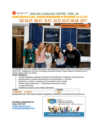 ENGLISH LANGUAGE CENTRE, YORK, UK MINIMUM POBYTU 2 TYGODNIE W skład BSC w roku 2017 wchodzą także dawne szkoły Experience English. Jedną z nich jest English Language Centre York, działające już od 20 lat i posiadająca akredytacje Eaquals. Szkoła zapewnia zakwaterowanie w rodzinie. Bardzo niska cena pakietu. PAKIET OBEJMUJE. 15 lekcji angielskiego, Materiały edukacyjne Test kwalifikacyjny i świadectwo ukończenia kursu Zakwaterowanie w pokojach dwuosobowych lub trzyosobowych w rodzinach Wyżywienie w rodzinie, w weekendy i dni powszednie lunche w szkole Program zajęć pozalekcyjnych – 5 półdniowych wycieczek po okolicy 3 x zajęcia wieczorne Całodzienne wycieczki: Leeds, Whitby, Manchester KURS TYDZIEŃ REJESTRACJA: £50 / PRZYJAZDY/WYJAZDY W NIEDZIELĘ /TRANSFERY Z LOTNISK PŁATNE DODATKOWO INFORMACJE/REZERWACJE: tel/fax 22 8471487 [email protected] [email protected]