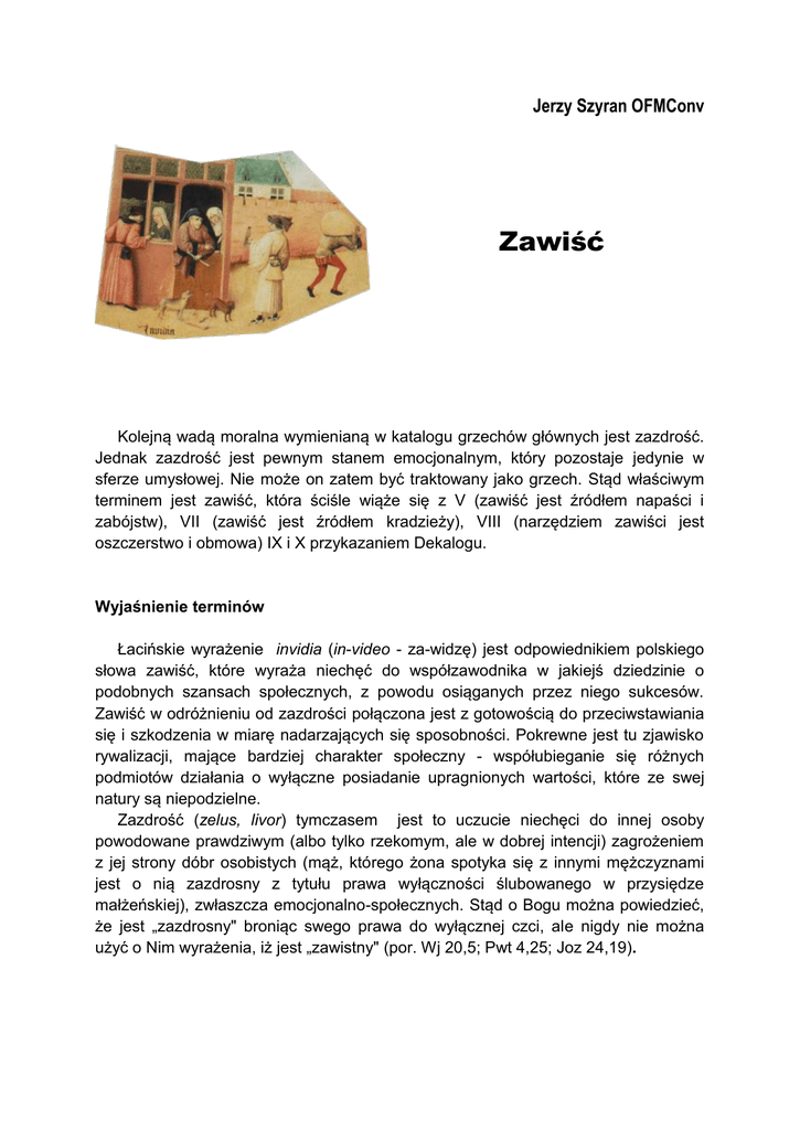 Jerzy Szyran OFMConv Zawiść Kolejną wadą moralna wymienianą w katalogu grzechów głównych jest zazdrość. Jednak zazdrość jest pewnym stanem emocjonalnym, który pozostaje jedynie w sferze umysłowej. Nie może on zatem być traktowany jako grzech. Stąd właściwym terminem jest zawiść, która ściśle wiąże się z V (zawiść jest źródłem napaści i zabójstw), VII (zawiść jest źródłem kradzieży), VIII (narzędziem zawiści jest oszczerstwo i obmowa) IX i X przykazaniem Dekalogu. Wyjaśnienie terminów Łacińskie wyrażenie invidia (in-video - za-widzę) jest odpowiednikiem polskiego słowa zawiść, które wyraża niechęć do współzawodnika w jakiejś dziedzinie o podobnych szansach społecznych, z powodu osiąganych przez niego sukcesów. Zawiść w odróżnieniu od zazdrości połączona jest z gotowością do przeciwstawiania się i szkodzenia w miarę nadarzających się sposobności. Pokrewne jest tu zjawisko rywalizacji, mające bardziej charakter społeczny - współubieganie się różnych podmiotów działania o wyłączne posiadanie upragnionych wartości, które ze swej natury są niepodzielne. Zazdrość (zelus, livor) tymczasem jest to uczucie niechęci do innej osoby powodowane prawdziwym (albo tylko rzekomym, ale w dobrej intencji) zagrożeniem z jej strony dóbr osobistych (mąż, którego żona spotyka się z innymi mężczyznami jest o nią zazdrosny z tytułu prawa wyłączności ślubowanego w przysiędze małżeńskiej), zwłaszcza emocjonalno-społecznych. Stąd o Bogu można powiedzieć, że jest „zazdrosny" broniąc swego prawa do wyłącznej czci, ale nigdy nie można użyć o Nim wyrażenia, iż jest „zawistny" (por. Wj 20,5; Pwt 4,25; Joz 24,19). Skutki moralne zawiści Zawiść jest moralnie zawsze zła, bo ingeruje w cudze dobra nie mając po temu prawa. Przejawami zawiści są: deprecjacja osiągnięć bliźniego; niszczenie dzieł bliźniego; obmowa i oszczerstwo, mające na celu podważenie autorytetu bliźniego; podkreślanie własnych osiągnięć i wartości swojej osoby w obliczu chwalenia osiągnięć bliźniego; pozbawianie bliźniego słusznie nleżących się mu tytułów, awansów czy nagród za osiągnięcia; nienawiść do bliźnich ze względu na ich wyższość i wartość; radość z niepowodzeń bliźniego; kpina i szyderstwo w nieszczęściu bliźniego; jątrzenie i „kopanie dołków” pod bliźnimi; w skrajnych przypadkach zawiść może być powodem zabójstwa czy kradzieży; Zawiść zatem może przybierać różne formy. Zawsze jednak uderza w drugiego człowieka, wyrządzając mu wielką krzywdę. Z mądrości Ojców i Doktorów Kościoła Zawiść to książę złych czynów, macierz śmierci, pierwsze drzwi grzechu, korzeń wad, początek boleści, rodzicielka, klęski, przyczyna nieposłuszeństwa. zasada niesławy" (Grzegorz z Nyssy, De vita Moysis, PG, 44, 410). „Z zawiści rodzi się nienawiść, szemranie, oczernianie, uciecha w przeciwnościach bliźniego, a utrapienie w jego pomyślności" (Grzegorz Wielki, Moralia, XXXI, 45, 88, PL 76, 621). „Zawiść jest gorsza od wszelkich rodzajów zła. Ludzie przez nią objęci nie mogą się wyswobodzić. Zranieni przez nią nie dochodzą do leczenia, nie powracają do zdrowia. Zawiść to trucizna występków, jad zbrodni, matka grzechów, początek wad. Dobre rzeczy ogląda ten, kto jej nie zobaczy. Nie zna rzeczy złych, kto jej nie pozna. Żyje ten, kto od niej ucieknie. Zawiści uniknąć można ucieczką, nie da się jej przezwyciężyć walką" (Piotr Chryzolog, Sermo 4& PL 52, 336). „Również co do innych jeszcze [dwóch] wad głównych, tj. zazdrości [zawiści] i lenistwa duchowego popełniają początkujący wiele niedoskonałości. W materii zazdrości [zawiści] wielu z nich doznaje udręczenia, widząc dobro duchowe innych. Jest to dla nich bolesne, że inni wyprzedzają ich na drodze doskonałości. Nie chcą, by tamtych chwalono, gdyż smucą się widząc cnoty innych. Niejednokrotnie, nie mogąc znieść tych pochwał, zaprzeczają im ile mogą i umniejszają ich znaczenie. Solą, jak się to mówi, w oku jest im i dręczy ich to, że nie ich chwali się, lecz innych. Chcieliby bowiem znaleźć uznanie we wszystkim. Usposobienie takie nie jest zgodne z miłością, która, jak mówi św. Paweł, «weseli się z prawdy» (2Kor 13,6). Jeśli człowiek, zachowujący miłość, ulega jakiejś zazdrości [zawiści], to jedynie zazdrości świętej. Niemiło mu, że nie ma tych cnót, jakie posiadają inni, lecz cieszy się, że je inni posiadają. Raduje się, że inni są lepsi i lepiej Bogu służą od niego” (Jan od Krzyża Noc ciemna I, 7, 1). Przestrogi i obietnice „Gdy po niejakim czasie Kain składał dla Pana w ofierze płody roli, zaś Abel składał również pierwociny ze swej trzody i z ich tłuszczu, Pan wejrzał na Abla i na jego ofiarę; na Kaina zaś i na jego ofiarę nie chciał patrzeć. Smuciło to Kaina bardzo i chodził z ponurą twarzą. Pan zapytał Kaina: Dlaczego jesteś smutny i dlaczego twarz twoja jest ponura? Przecież gdybyś postępował dobrze, miałbyś twarz pogodną; jeżeli zaś nie będziesz dobrze postępował, grzech leży u wrót i czyha na ciebie, a przecież ty masz nad nim panować. Rzekł Kain do Abla, brata swego: Chodźmy na pole. A gdy byli na polu, Kain rzucił się na swego brata Abla i zabił go. Wtedy Bóg zapytał Kaina: Gdzie jest brat twój, Abel? On odpowiedział: Nie wiem. Czyż jestem stróżem brata mego? Rzekł Bóg: Cóżeś uczynił? Krew brata twego głośno woła ku mnie z ziemi! Bądź więc teraz przeklęty na tej roli, która rozwarła swą paszczę, aby wchłonąć krew brata twego, przelaną przez ciebie” (Rdz 4,3-11). „Po tych wydarzeniach stało się, co następuje. Nabot z Jizreel miał winnicę <w Jizreel> obok pałacu Achaba, króla Samarii. Achab zatem zwrócił się do Nabota mówiąc: Oddaj mi na własność twoją winnicę, aby została przerobion