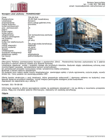 Bożena Jaszczyńska tel.: (+48) 501 780 808 email: [email protected] Wynajem Lokal użytkowy - PIONIER024687 Cena: Powierzchnia: Lokalizacja: przeznaczenie: rodzaj budynku: liczba pomieszczeń: pow. pomieszczeń: piętro: liczba pięter: liczba witryn: udogodnienia: miejsca parkingowe: rok budowy: wejście: liczba linii telefonicznych: media: rodzaj własności: termin wydania: dojazd: umeblowanie: wysokość kondygnacji: dodatkowe opłaty: typ kaucji: Opis 750,00 PLN 25,00 Metr kwadratowy Szczecin biuro;usługi;gabinet;inne; biurowiec 1 25 2 3 0 sieć komputerowa;wentylacja;ogrzewanie;winda osobowa;rampa;ochrona;instalacja na ulicy 1994 od ulicy 1 siła;prąd;woda;kanalizacja;gaz; własność od zaraz asfaltowy brak 400 eksploatacja jednomiesięczna Oferujemy Państwu pomieszczenia biurowe o powierzchni 25m2 . Powierzchnia biurowa usytuowana na 2 piętrze biurowca w samym centrum miasta przy Bramie Portowej. Lokalizacja zapewnia szybki i wygodny dostęp dla przyszłych klientów. Budynek objęty całodobową ochroną oraz monitoringiem (posiada zainstalowane kamery przemysłowe). Do pomieszczeń prowadzi nowoczesna winda i przestronna klatka schodowa. Budynek o bardzo dobrym standardzie. Do podanej ceny należy dodać koszty eksploatacyjne zawierające opłaty z tytułu ogrzewania, zużycia prądu, wywóz śmieci itd.. Ceny podane nie zawierają podatku VAT. Oferta bardzo atrakcyjna z racji lokalizacji, która gwarantuje widoczność ( darmowa reklama na budynku) oraz łatwość dotarcia przyszłych klientów. Liczne miejsca parkingowe dostępne przed budynkiem. Zapraszam do zapoznania się z ofertą !!! Kontakt: 501-78-08-08 Informacje zawarte w ofercie sporządzone zostały na podstawie oświadczeń i nie są ofertą w rozumieniu przepisów prawa. Mają one charakter jedynie informacyjny. Zalecamy ich osobistą weryfikację. Zdjęcia Dokument wygenerowany przez eKomako Makler Nieruchomości Data wydruku: 2017-03-04 00:42