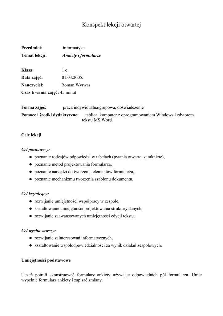 Konspekt lekcji otwartej Przedmiot: informatyka Temat lekcji: Ankiety i formularze Klasa: 1c Data zajęć: 01.03.2005. Nauczyciel: Roman Wyrwas Czas trwania zajęć: 45 minut Forma zajęć: praca indywidualna/grupowa, doświadczenie Pomoce i środki dydaktyczne: tablica, komputer z oprogramowaniem Windows i edytorem tekstu MS Word. Cele lekcji Cel poznawczy: poznanie rodzajów odpowiedzi w tabelach (pytania otwarte, zamknięte), poznanie metod projektowania formularza, poznanie narzędzi do tworzenia elementów formularza, poznanie mechanizmu tworzenia szablonu dokumentu. Cel kształcący: rozwijanie umiejętności współpracy w zespole, kształtowanie umiejętności projektowania struktury danych, rozwijanie zaawansowanych umiejętności edycji tekstu. Cel wychowawczy: rozwijanie zainteresowań informatycznych, kształtowanie współodpowiedzialności za wynik działań zespołowych. Umiejętności podstawowe Uczeń potrafi skonstruować formularz ankiety używając odpowiednich pól formularza. Umie wypełnić formularz ankiety i zapisać zmiany. Umiejętności ponadpodstawowe Uczeń potrafi stworzyć szablon dokumentu. Przebieg zajęć: Część wstępna – 5 minut Kontrola obecności na lekcji. Zapoznanie z tematem zajęć. Przypomnienie treści zajęć poprzednich i kontrola wykonania pracy domowej. (Uczniowie mieli przygotować projekty ankiety.) Przygotowanie stanowisk do pracy (włączenie komputerów, zalogowanie). Część główna – 35 minut I. Projektowanie ankiety Czynności nauczyciela: Nauczyciel przypomina, co miała badać ankieta i które elementy w ankiecie powinny się znaleźć (które elementy są obowiązkowe). Omawia wybrany egzemplarz projektu. Prosi uczniów o wyrażenie swojej opinii o projekcie i o uzupełnienie. Czynności uczniów: Uczniowie odpowiadają na pytania nauczyciela. II. Wykonanie formularza - instrukcje Czynności nauczyciela Nauczyciel, na prostych przykładach pokazuje: jak uruchamia się pasek narzędzi Formularze, jak wstawia się komponenty formularza, jak określa się właściwości list i pól, jak chroni się (blokuje) formularz, jak uzupełnia się pola formularza, jak tworzy się szablon dokumentu. Omawia rolę szablonu dokumentu i jego właściwości. Pokazuje, w jaki sposób otwiera się szablon i jak zapisuje się dokument utworzony na podstawie szablonu. Czynności uczniów: Uczniowie wysłuchują instrukcji. Wykonują polecenia nauczyciela. III. Stworzenie własnej ankiety (samodzielna praca uczniów) Czynności nauczyciela: Nauczyciel poleca uczniom wykonanie ankiety wg własnego projektu w nowym dokumencie. Po zgłoszeniu gotowości do oceny, nauczyciel sprawdza prace, komentuje je i wystawia odpowiednią ocenę. Czynności uczniów: Uczniowie wykonują własne ankiety i po ukończeniu zadania proszą nauczyciela o ocenę. Część końcowa zajęć – 5 minut Nagrodzenie aktywnych uczniów ocenami lub „plusami”. Uporządkowanie stanowisk pracy. Wyłączenie komputerów.