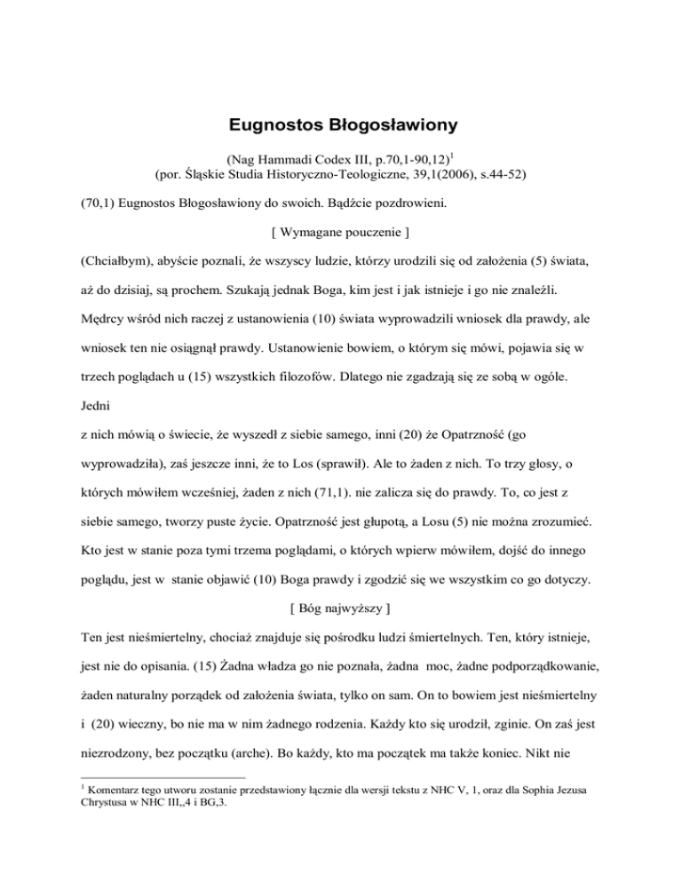 Eugnostos Błogosławiony (Nag Hammadi Codex III, p.70,1-90,12)1 (por. Śląskie Studia Historyczno-Teologiczne, 39,1(2006), s.44-52) (70,1) Eugnostos Błogosławiony do swoich. Bądźcie pozdrowieni. [ Wymagane pouczenie ] (Chciałbym), abyście poznali, że wszyscy ludzie, którzy urodzili się od założenia (5) świata, aż do dzisiaj, są prochem. Szukają jednak Boga, kim jest i jak istnieje i go nie znaleźli. Mędrcy wśród nich raczej z ustanowienia (10) świata wyprowadzili wniosek dla prawdy, ale wniosek ten nie osiągnął prawdy. Ustanowienie bowiem, o którym się mówi, pojawia się w trzech poglądach u (15) wszystkich filozofów. Dlatego nie zgadzają się ze sobą w ogóle. Jedni z nich mówią o świecie, że wyszedł z siebie samego, inni (20) że Opatrzność (go wyprowadziła), zaś jeszcze inni, że to Los (sprawił). Ale to żaden z nich. To trzy głosy, o których mówiłem wcześniej, żaden z nich (71,1). nie zalicza się do prawdy. To, co jest z siebie samego, tworzy puste życie. Opatrzność jest głupotą, a Losu (5) nie można zrozumieć. Kto jest w stanie poza tymi trzema poglądami, o których wpierw mówiłem, dojść do innego poglądu, jest w stanie objawić (10) Boga prawdy i zgodzić się we wszystkim co go dotyczy. [ Bóg najwyższy ] Ten jest nieśmiertelny, chociaż znajduje się pośrodku ludzi śmiertelnych. Ten, który istnieje, jest nie do opisania. (15) Żadna władza go nie poznała, żadna moc, żadne podporządkowanie, żaden naturalny porządek od założenia świata, tylko on sam. On to bowiem jest nieśmiertelny i (20) wieczny, bo nie ma w nim żadnego rodzenia. Każdy kto się urodził, zginie. On zaś jest niezrodzony, bez początku (arche). Bo każdy, kto ma początek ma także koniec. Nikt nie 1 Komentarz tego utworu zostanie przedstawiony łącznie dla wersji tekstu z NHC V, 1, oraz dla Sophia Jezusa Chrystusa w NHC III,,4 i BG,3. panuje (72,1). nad nim. Nie ma on imienia, bo kto ma imię, jest stworzeniem pochodzącym od kogoś innego, kto mu nadaje imię. Jest bez imienia. Nie ma postaci ludzkiej, bo kto ma (5) postać ludzką, jest stworzeniem pochodzącym od kogoś innego. Ma swój własny wygląd. Nie jest to wygląd taki, w jaki myśmy przyjęli, albo jaki widzieliśmy, lecz jest to wygląd obcy (dla nas), (10) obcy bardziej niż wszelka inna rzecz, lepszy od wszystkiego. Spogląda na wszystkie strony i widzi siebie samego w sobie samym. Jest nieogarniony. Jest nieuchwytny. (15) Jest kimś, kto stale trwa jako niezniszczalny. Jest kimś, kto nie ma niczego sobie podobnego. Jest niezmiennie dobry. Jest kimś bez braku. Jest kimś, kto stale trwa. Jest błogosławiony. Jest nie (20) do pojęcia, gdyż zwykle pojmuje tylko sam siebie. Jest nieograniczony, jest niedościgły, jest doskonały, gdyż nie ma (73,1) w nim braku. Jest błogosławiony, niezniszczalny. Mówi się o nim, że jest ojcem Pełni. [ Początek objawienia ] Jeszcze nie objawił się nikt z tych, którzy się objawili. (5) Wielkość i Moce są w nim, gdyż on wszystko ogarnia a jego nie ogarnia nic. To on bowiem jest całkowicie Umysłem, (10) Rozważaniem i Namysłem, Roztropnością i Mocą. One wszystkie są mocami równymi sobie. One stanowią źródło wszystkiego. Ich cały ród istnieje aż po ich (15) kres w pierwotnej wiedzy Niezrodzonego. Nie doszli jeszcze do (swego) objawienia. Istniało więc zróżnicowanie wśród niezniszczalnych eonów. [ Droga do niezniszczalności ] (20) W ten sposób zrozumiemy: wszelka rzecz, która wyszła ze zniszczenia, będzie niszczona ponieważ wyszła ze zniszczenia. Ten, kto (74,1). jest z niezniszczalności nie będzie zniszczony, lecz stanie się niezniszczalny, jako ten który powstał z niezniszczalności. Mnóstwo (5) ludzi pobłądziło, bo nie poznali tej istniejącej różnicy, a to oznacza, że umarli. To wystarczy aż do tego miejsca. Nie ma możliwości aby oddać naturę (rzeczy) przy pomocy słów, (10) które właśnie wypowiedziałem o błogosławionym, niezniszczalnym Bogu prawdy. Jeśli ktoś chciałby uwierzyć w te słowa, które zostały tu wyłożone, ten powinien przemyśleć: (15) od tego, co ukryte aż do pełni objawienia, a wtedy to poznanie pouczy go, jak wiara w to, co nie jest objawione, ma potwierdzenie w tym, co objawione. [ Ojciec tworzący siebie samego ] (20) A początek wiedzy jest taki: Pan pełni zgodnie z prawdą nie nazywa się „Ojcem” ale Praojcem (propator), gdyż Ojciec jest początkiem (75,1) tego, który objawia. Natomiast ten, który jest bez początku: to Praojciec (propator), który widzi siebie samego w sobie samym jak (5) w zwierciadle, gdyż objawił się w podobieństwie do Prawdziwego Ojca (Autopator), to znaczy „Rodzącego siebie” (autogenetor), tego, który jest naprzeciw siebie samego, ponieważ jest przed niezrodzonym, egzystującym wcześniej (10). Jest wprawdzie równy we wszystkim wobec tego, który jest przed nim, ale nie jest równy wobec niego w mocy. Po nim objawił on mnóstwo występujących naprzeciw niego bytów „samorodnych” (autogenes) (15) równych mu wiekiem, mocą, chwałą niezliczoną. A zwykle nazywa się je pokoleniem, nad którym nie ma panowania, pośród panowań, jakie są dane. Przeciwnie, (20) całe mnóstwo jest na tym miejscu takich, nad którymi nie ma panowania. A nazywa się ich dziećmi niezrodzonego Ojca, tego, który jest niepojęty (76,1) napełniony nie przemijającym blaskiem i niewypowiedzianą radością. Wszyscy mają w nim odpoczynek, pozostają w nieustannej (5) i niewypowiedzianej radości z powodu chwały niezmiennej i nieustannego wesela. O tej chwale nigdy nie słyszano ani nie znały jej wszystkie eony (10) w swoich światach. I to wystarczy do tego miejsca, abyśmy nie ciągnęli tego bez końca. [ Nieśmiertelny człowiek i wielka Mądrość ] Ale oto jest innym początek wiedzy (15) ze względu na to, co powstało. Pierwszym który się objawił przed wszystkim w Nieskończoności, jest Samozrodzo