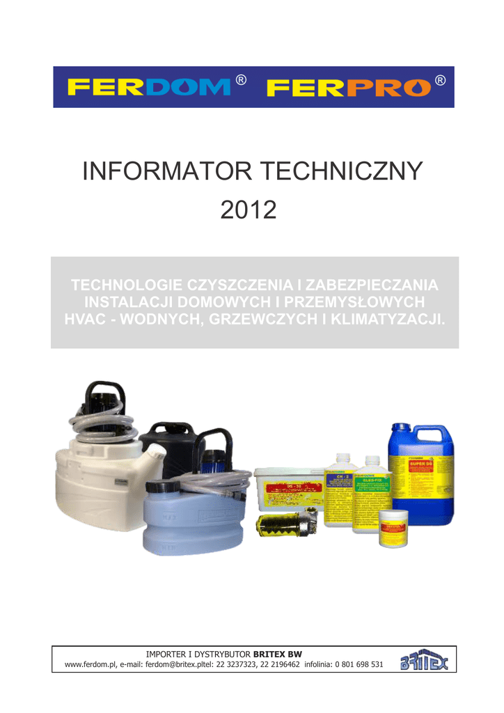 INFORMATOR TECHNICZNY 2012 IMPORTER I DYSTRYBUTOR BRITEX BW www.ferdom.pl, e-mail: [email protected]: 22 3237323, 22 2196462 infolinia: 0 801 698 531 OCHRONA INSTALACJI GRZEWCZYCH, KLIMATYZACJI, HVAC ZABEZPIECZANIE ANTYKOROZYJNE, ANTYOSADOWE ITP .............................................................................. !CH-1 Inhibitor systemów c.o. ............................................... !CH2, CH-3 Uniwersalny inhibitor systemów c.o. !CH-5 Inhibitor do generatorów pary do użytku spożywczego ................................. !CH-6 Inhibitor do generatorów pary zasilanych wodą zmiękczoną ...................... !CH-7 Inhibitor do generatorów pary zasilanych wodą zdemineralizowaną ......... !CH-8 ICE inhibitor do instalacji chłodzących ................................................. ZABEZPIECZANIE ANTYMROZOWE !STOP-ICE Inhibitor antymrozowy na bazie CH-3 i glikolu propylowego ............. !AL-PRO Inhibitor antymrozowy na bazie CH-3 i glikolu etylenowego ............. PREPARATY REGENERUJĄCE !REKO-FIX Regenerator kotła. ................................................................................ !ELES-FIX Uszczelniacz do c.o. ................................................................ OCHRONA INSTALACJI WODOCIĄGOWYCH, WODNYCH ITP. PREPARATY OCHRONNE !GELPHOS L- Inhibitor antykorozyjny i przeciwosadowy ................................ !GELCLOR - Preparat dezynfekujący do wody pitnej i spożywczej. ................. !GELCID - Preparat antyglonowy i antybakteryjny do wody technicznej, basenów .. PREPARATY DEZYNFEKUJĄCE !BRIT-STER - tabletki dezynfekujące ................................................................. DOZOWNIKI PREPARATÓW DOSAMIX !DOSAMIX 406 - domy jednorodzinne ................................................................. !DOSAMIX 600 - duże instalacje ................................................................. POMPY DOZUJĄCE DO INHIBITORÓW I INNYCH PREPARATÓW !DOSAMATIC PC - pompa o dozowaniu ustawialnym ................................................ !DOSAMATIC PP pompa o dozowaniu proporcjonalnym ................................. !LP liczniki przepływu z generatorem impulsów ................................................ !ZBD ZBIORNIK - 100 litrów ................................................................................ CZYSZCZENIE INSTALACJI GRZEWCZYCH, KLIMATYZACJI, HVAC CZYSZCZENIE INSTALACJI GRZEWCZYCH „On-line” podczas pracy systemu !DS-15 Środek czyszczący do instalacji centralnego ogrzewania. ...................... !SUPER-DS Uniwersalny środek czyszczący do instalacji. ................................. CZYSZCZENIE INSTALACJI I ARMATURY “Off-line" z pompą czyszczącą. !DS-30 Odkamieniacz do instalacji ciepłej wody, podgrzewaczy, wymienników itp. !DS-50 Silny środek czyszczący do instalacji wodnych i armatury. ...................... !DS-60 Bardzo silny środek czyszczący do elementów instalacji i armatury ......... PREPARATY FIRE CZYSZCZENIE STRONY OGNIOWEJ !FIRE GZ, FIRE OS, FIRE WS 4 4 5 5 6 6 6 7 8 8 9 9 9 9 10 11 12 13 14 ................................................................................. 15 JAK WYCZYŚCIC INSTALACJE C.O. - PODSTAWOWE INFO !Praktyczne porady w skrócie 1 2 3 3 3 3 ................................................................. 16, 17 POMPY I ZESTAWY CZYSZCZĄCE INSTALACJE !DANE TECHNICZNE, SPECYFIKACJE ........................................................ 18, 19 !ZESTAWY I AKCESORIA ....................................................................................... 20 ! PRZYKLADY ZASTOSOWANIA POMP ............................................................... 21, 22 IMPORTER I DYSTRYBUTOR BRITEX BW www.ferdom.pl, e-mail: [email protected]: 22 3237323, 22 2196462 infolinia: 0 801 698 531 OCHRONA INSTALACJI GRZEWCZYCH, KLIMATYZACJI, HVAC ZABEZPIECZANIE ANTYKOROZYJNE, ANTYOSADOWE I ANTYBAKTERYJNE CH-1 Inhibitor systemów c.o. ŚRODEK ZABEZPIECZAJĄCY - INHIBITOR CENTRALNEGO OGRZEWANIA - Do systemów C.O. ze wszystkich materiałów z wyłączając miedziano- aluminiowe - Zapobiega korozji grzejników, kotłów, rur, zaworów - Zapobiega odkładaniu się kamienia, zgorzeliny i głośnej pracy kotła - Chroni przed zapowietrzaniem, eliminuje nie dogrzane miejsca w grzejnikach - Zmniejsza zużycie paliwa - Chroni pompy przed zatarciem ZASADY DZIAŁANIA i USUWANE PROBLEMY. Pasywacja anodowa, czyli tworzenie warstwy ochronnej Inhibitor korozji CH-1/MB-1 działają poprzez mechanizm zwany pasywacją anodową. W rezultacie procesu elektrochemicznego inhibitory, w wodzie z płynem chroniącym, kierują się do anody i katody i są chemicznie absorbowane na powierzchni. Powstająca w ten sposób warstwa tworzy barierę, która efektywnie izoluje anodę od wody w obiegu i od kontaktu z katodą. Zwalnia to prędkość korozji do niewielkiego poziomu, przeważnie o 100 lub 1000 razy mniejszego w porównaniu do korozji w wodzie bez płynu chroniącego. Warstwa pasywna jest poddawana ciągłemu przerywaniu i rekonstrukcji i jej obecność zależy od ciągłej obecności w wodzie inhibitora, którego zadaniem jest naprawa warstwy pasywnej. Jeżeli zabraknie inhibitora, przerwana zostanie także ochrona przed korozją i to w bardzo krótkim czasie. Zazwyczaj atakowana jest najbardziej anodowa część elementu, na przykład naprężona spoina w grzejniku lub w szczelinie. Prędkość korozji na całej powierzchni może być bardzo mała, ale może być bardzo duża w danym miejscu, powodując perforację metalu w tym punkcie. Sposób użycia i dawkowanie. Zalecane stężenie inhibitora wynosi 4%. Unikać zbyt małego lub dużego rozcieńczenia. Produkt może być wprowadzony przez naczynie zbiorcze, wlany bezpośrednio do instalacji w dowolnym jej miejscu lub wprowadzony za pomocą Inżektora - pompy. Skuteczność inhibitora zwiększa wcześniejsze wypłukanie instalacji. Zabezpieczanie dużych / przemysłowych instalacji - patrz System CM-ZM. Uwaga! W i