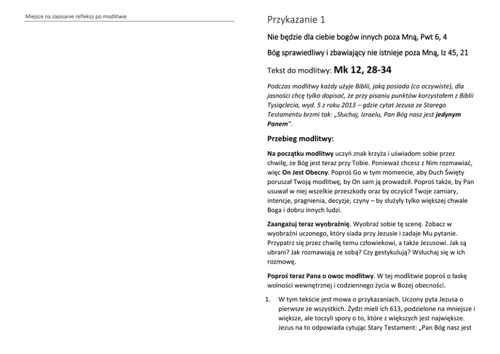 Miejsce na zapisanie refleksji po modlitwie Przykazanie 1 Nie będzie dla ciebie bogów innych poza Mną, Pwt 6, 4 Bóg sprawiedliwy i zbawiający nie istnieje poza Mną, Iz 45, 21 Tekst do modlitwy: Mk 12, 28-34 Podczas modlitwy każdy użyje Biblii, jaką posiada (co oczywiste), dla jasności chcę tylko dopisać, że przy pisaniu punktów korzystałem z Biblii Tysiąclecia, wyd. 5 z roku 2013 – gdzie cytat Jezusa ze Starego Testamentu brzmi tak: „Słuchaj, Izraelu, Pan Bóg nasz jest jedynym Panem”. Przebieg modlitwy: Na początku modlitwy uczyń znak krzyża i uświadom sobie przez chwilę, że Bóg jest teraz przy Tobie. Ponieważ chcesz z Nim rozmawiać, więc On Jest Obecny. Poproś Go w tym momencie, aby Duch Święty poruszał Twoją modlitwę, by On sam ją prowadził. Poproś także, by Pan usuwał w niej wszelkie przeszkody oraz by oczyścił Twoje zamiary, intencje, pragnienia, decyzje, czyny – by służyły tylko większej chwale Boga i dobru innych ludzi. Zaangażuj teraz wyobraźnię. Wyobraź sobie tę scenę. Zobacz w wyobraźni uczonego, który siada przy Jezusie i zadaje Mu pytanie. Przypatrz się przez chwilę temu człowiekowi, a także Jezusowi. Jak są ubrani? Jak rozmawiają ze sobą? Czy gestykulują? Wsłuchaj się w ich rozmowę. Poproś teraz Pana o owoc modlitwy. W tej modlitwie poproś o łaskę wolności wewnętrznej i codziennego życia w Bożej obecności. 1. W tym tekście jest mowa o przykazaniach. Uczony pyta Jezusa o pierwsze ze wszystkich. Żydzi mieli ich 613, podzielone na mniejsze i większe, ale toczyli spory o to, które z większych jest największe. Jezus na to odpowiada cytując Stary Testament: „Pan Bóg nasz jest 2. 3. 4. jedynym Panem”. Co oznacza dla Ciebie, że jest jedynym Panem? Pobądź przez chwilę ze słowem „jedyny”, niech ono drąży Twoje serce, niech przekopie ścieżkę do samego centrum Twego istnienia – tam, gdzie mieszka JEDYNY. Potem Jezus cytuje przykazanie miłości Boga i bliźniego. Można zapytać, co to ma wspólnego z Bogiem jedynym? W przykazaniu użyte jest słowo „cały”, które chce objąć całego człowieka w jego relacji do Boga. Człowiek ma kochać Boga w sposób całkowity, totalny, niepodzielny. Ma kochać Go całym sobą, wszystkim kim jest. Dlaczego tak? Czy dlatego, że jest Bogiem? Też i to na pierwszym miejscu. Ale też dlatego, że jest Bogiem JEDYNYM. Gdyby było dwóch bogów, trzeba by jakoś tę miłość dzielić. A skoro Bóg jest JEDYNY, to jedynie Jemu należy się cała miłość. Tu możemy zobaczyć to wszystko w naszym życiu, co sprawia, że naszą miłość dzielimy i przestaje być ona niepodzielna. Na pewno trudno jest nam taką miłością kochać Boga. Nasze „ja” zranione przez grzech, zawsze szuka czegoś „tylko dla siebie”, czegoś atrakcyjnego, pociągającego. Ale nie tylko z tego powodu może być trudno kochać Boga. W małżonkach może obudzić się wątpliwość – a co z moim mężem, co z moją żoną? Skoro miłość do Boga ma być niepodzielna, to jak kochać tę najbliższą mi osobę, z którą staję się jednym ciałem? Warto sobie uświadomić ważną zasadę: miłość do Boga jest wyłączna, ale nie wykluczająca innych miłości. Bo ta MIŁOŚĆ JEDYNA nie jest tego samego rodzaju, co miłość do współmałżonka, dzieci, rodziców, teściów, przyjaciół, itd. Każda z tych miłości jest inna, choć wszystkie nazywamy tak samo. Każda jest inna, ma swój osobliwy rys i smak. Kto tego nie rozumie, ten np. nie zrozumie słów Jezusa, by mieć w nienawiści wszystkich idąc za Nim. U Izajasza Bóg mówi, że ktoś drugi taki, jak On – nie istnieje. Ktoś sprawiedliwy i zbawiający. Ta jedyność Boga polega więc na tym, że On coś robi dla człowieka, On go zbawia. Tzw. bożki, które człowiek sobie czynił miały zawsze taką właściwość, że to człowiek musiał coś dla bożka robić. Ów bożek zawsze był łudząco podobny do tego, który go stworzył (a więc do człowieka), z tą jedną różnicą, że był 5. nieżywy. Drewniana czy metalowa kukiełka z rękami, którymi nie ruszał, nogami, które nie chodziły, ustami, które nie mówiły, uszami, które nie słyszały… więc trzeba było coś dla niego robić. A współczesne bożki? Też trzeba się dla nich poświęcać. Choćby pieniądze – dla ich zdobycia trzeba poświęcać mnóstwo pracy, energii, sił, a nawet zdrowia. Pieniądze należy zdobywać i zarabiać – to oczywiste, chodzi o formę patologiczną zdobywania pieniędzy, zwaną chciwością (co nie zawsze widać na zewnątrz, może się ona kryć za naszymi intencjami, tzn. mogę nie posiadać zbyt wiele na tym świecie, a i tak być zarażony chciwością). Podobnych poświęceń wymagają wszystkie inne współczesne idole i bożki. Spójrz na swoje życie w tym świetle i cokolwiek zobaczysz, uciesz się, że Pan daje Ci łaskę świadomości siebie oraz miej dla siebie miłosierdzie (widząc np. swoje bożki) i zobacz siebie jako człowieka w drodze. Ostatnia myśl odnośnie Boga, który jest JEDYNY. Czy podpisałbyś się pod słowami: „Bóg nie jest w moim życiu na pierwszym miejscu!”? Czy poprzednie punkty naprowadzają Cię na to, o co chodzi w tym zdaniu, że Bóg jest Panem jedynym? Skoro jest JEDYNY, to nie można Go postawić na pierwszym miejscu, bo zawsze coś może stanąć na drugim, trzecim, piątym… I tak Bóg, zamiast być JEDYNY, zostaje postawiony w jednym szeregu z czymś innym. Bóg jest JEDYNY, a cała reszta jest w zupełnie innej przestrzeni, zupełnie innej lidze, gdzie można sobie ważność osób i rzeczy ustawiać w dowolnej kolejności. Jednak Boga w tym nie ma, bo On jest BOGIEM JEDYNYM. Czy jest On taki dla Ciebie? Na koniec modlitwy porozmawiaj z Jezusem, jak przyjaciel z przyjacielem, o tym, co Cię dotknęło, poruszyło na tej modlitwie, co Ci się rozjaśniło, co zadziwiło, zaskoczyło… Wypowiedz przed Nim swoje odczucia związane z tą 