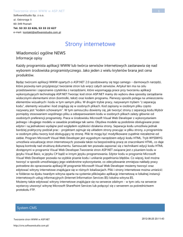 Tworzenie stron WWW w ASP.NET 1 SoftwareStudio Sp. z o.o. ul. Ostroroga 5 3R]QDĔ Tel. 53 33 22 626, 53 33 22 627 e-mail: [email protected] Strony internetowe :LDGRPRğFLRJyOQH1(:6 Informacje opisy .DīG\SURJUDPLVWDDSOLNDFML:::OXEWZyUFDVHUZLVyZLQWHUQHWRZ\FK]DVWDQDZLDVLċQDG Z\ERUHPğURGRZLVNDSURJUDPLVW\F]QHJR-DNRMHGHQ]ZLHOXNU\WHULyZEUDQDMHVWFHQD produktów. %ċGĆFWZyUFDPLDSOLNDFML:::RSDUW\FKR$631(72.0VSRG]LHZDP\VLċWHJRVDPHJR²GDUPRZ\FKQDU]ċG]L NWyUHSR]ZROĆQDPSU]\ğSLHV]\ýWZRU]HQLHVWURQOXEZUċF]FDâ\FKVHUZLVyZ$UW\NXâWHQPDQDFHOX SU]HGVWDZLHQLHL]DSR]QDQLHF]\WHOQLND]QDU]ċG]LDPLNWyUHZVSRPDJDMĆSUDFHSU]\WZRU]HQLXDSOLNDFML Z\NRU]\VWXMĆF\FKWHFKQRORJLċ$631(77ZRU]ĆFNRGVWURQ$631(7PDP\GRZ\ERUXGZDVSRVRE\]DU]ĆG]DQLD widocznymi elementami stron (kontrolki, tekst) oraz kodem programu. Pierwszy sposób polega na umieszczeniu HOHPHQWyZZL]XDOQ\FKLNRGXZW\PVDP\PSOLNX:GUXJLPWU\ELHSUDF\QD]\ZDQ\PWU\EHP´]VHSDUDFMĆ NRGXµHOHPHQW\ZL]XDOQHLNRG]QDMGXMĆVLċZRVREQ\FKSOLNDFK.RG]DSLVDQ\ZRVREQ\PSOLNXF]ċVWR QD]\ZDQ\MHVW´NRGHPVFKRZDQ\Pµ:W\PVDPRXF]NXGRZLHP\VLċMDNWZRU]\ýVWURQ\]VHSDUDFMĆNRGX:\EyU SRPLċG]\VWRVRZDQLHPZVSyOQHJRSOLNXDRGVHSDURZDQLHPNRGXZRVREQ\FKSOLNDFK]DOHī\JâyZQLHRG RVRELVW\FKSUHIHUHQFMLSURJUDPLVW\3UDFDZğURGRZLVNX0LFURVRIW9LVXDO:HE'HYHORSHU]Z\NRU]\VWDQLHP MHGQHJRLGUXJLHJRPRGHOXZ]DVDG]LHSU]HELHJDWDNVDPR2E\GZDPRGHOHVĆSRGREQLHREVâXJLZDQHSU]H] HG\WRULVĆMHGQDNRZRZ\GDMQHSRGZ]JOċGHPV]\ENRğFLG]LDâDQLDVWURQ\6HSDUDFMDNRGXXPRīOLZLDMHGQDN EDUG]LHMSUDNW\F]Q\SRG]LDâSUDFSURMHNWDQW]DMPXMHVLċXNâDGHPVWURQ\SUDFXMĆFZSOLNXVWURQ\DSURJUDPLVWD ZRVREQ\PSOLNXWZRU]\NRGREVâXJXMĆF\WċVWURQċ3OLNLWHPRJĆE\ýPRG\ILNRZDQH]XSHâQLHQLH]DOHīQLHRG VLHELH3URJUDP0LFURVRIW9LVXDO:HE'HYHORSHUMHVWZ\JRGQ\PQDU]ċG]LHPHG\FMLNRGX+70/7U\E:<6,:<* XPRīOLZLDZL]XDOL]DFMċVWURQLQWHUQHWRZ\FKSR]ZDODWDNīHQDEH]SRğUHGQLĆSUDFċ]H]QDF]QLNDPL+70/FRGDMH OHSV]ĆNRQWUROċQDGVWUXNWXUĆGRNXPHQWX6DPRXF]HNWHQSR]ZDOD]DSR]QDýVLċ]WHFKQLNDPLHG\FMLNRGX+70/ GRVWċSQ\PLZSURJUDPLH9LVXDO:HE'HYHORSHU7ZRU]HQLHVWURQ$631(7]ZLĆ]DQHMHVW]SLVDQLHPNRGXZ Mċ]\NX9LVXDO%DVLFZMċ]\NX&EĆGĩZLQQ\PMċ]\NXSURJUDPRZDQLD(G\WRUNRGXZSURJUDPLH0LFURVRIW 9LVXDO:HE'HYHORSHUSR]ZDODQDV]\ENLHSLVDQLHNRGXLXQLNDQLHSRSHâQLDQLDEâċGyZ&RZLċFHMNRGPRīQD WZRU]\ýZVSRVyEXPRīOLZLDMĆF\MHJRZLHORNURWQHZ\NRU]\VWDQLHFR]GHF\GRZDQLH]PQLHMV]DQDNâDG\SUDF\ SRWU]HEQHGRRSUDFRZDQLDDSOLNDFML:SURJUDPLH0LFURVRIW9LVXDO:HE'HYHORSHUPRīHP\WZRU]\ýRUD] HG\WRZDýZLWU\Q\LQWHUQHWRZH]QDMGXMĆFHVLċZUyīQ\FKORNDOL]DFMDFK3OLNLLVWURQ\LQWHUQHWRZHPRīQDXPLHğFLý ZIROGHU]HQDG\VNXWZDUG\PZLWU\QDRSDUWDQDV\VWHPLHSOLNyZMDNRDSOLNDFMċLQWHUQHWRZĆZORNDOQHMLQVWDQFML LQWHUQHWRZ\FKXVâXJLQIRUPDF\MQ\FK,QWHUQHW,QIRUPDWLRQ6HUYLFHV,,6ORNDOQDZLWU\QD,,6 0RīHP\WDNīHHG\WRZDýZLWU\Q\LQWHUQHWRZH]QDMGXMĆFHVLċQDVHUZHU]H]GDOQ\PZW\PFHOXQDVHUZHU]H Z\VWDUF]\XWZRU]\ýZLWU\Qċ0LFURVRIW6KDUH3RLQW6HUYLFHVOXESRâĆF]\ýVLċ]VHUZHUHP]DSRğUHGQLFWZHP SURWRNRâX)73 System CMS Tworzenie stron WWW w ASP.NET http://cms.softwarestudio.com.pl/ 2012-08-20 20:11:43 Tworzenie stron WWW w ASP.NET 6\VWHP]DU]ĆG]DQLDWUHğFLĆ>DQJ&RQWHQW0DQDJPHQW6\VWHP@WRSURJUDP SU]H]QDF]RQ\GRWZRU]HQLDLSURZDG]HQLDVHUZLVX:::']LċNL&06RZL XPLHV]F]DQLHL]DU]ĆG]DQLH]DZDUWRğFLĆVHUZLVXMHVWâDWZHLZ\JRGQH'RGDZDQLH ]DZDUWRğFLRGE\ZDVLċSU]\SRPRF\GRZROQHMSU]HJOĆGDUNLLQWHUQHWRZHMFRQLH Z\PDJDVSHFMDOLVW\F]QHMZLHG]\]QDMRPRğFLLQIRUPDW\NL+70/F]\Mċ]\NyZ SURJUDPRZDQLDLWS3RSURVWXSLV]HV]LSXEOLNXMHV]1LHSRWU]HEXMHV]ZLċF LQIRUPDW\NyZZHEPDVWHUyZF]\XVâXJDJHQFMLUHNODPRZ\FKīHE\XDNWXDOQLDý WUHğFLQDZHWNLONDUD]\G]LHQQLH0RīHV]SRG]LHOLýRERZLĆ]NLGRGDZDQLDWUHğFL PLċG]\RVRE\F]\G]LDâ\NWyUHQDMOHSLHM]QDMĆRNUHğORQĆWHPDW\NċER]DMPXMĆVLċ QLĆQDFRG]LHĕ :V]\VWNLHGRGDZDQHWUHğFLLQIRUPDFMHRSUDFRZDQLDSU]HFKRZ\ZDQHVĆZED]LH GDQ\FK']LċNLWHPX]DZDUWRğýVHUZLVXMHVWJHQHURZDQDG\QDPLF]QLHGDQH PRīHV]Z\NRU]\VW\ZDýZLHORNURWQLHWDNīHZLQQ\FKPLHMVFDFKPRīHV]MHWDNīH LQDF]HMVIRUPDWRZDýQSSU]\JRWRZDýGRGUXNXF]\VWZRU]\ýGRNXPHQW3') JURPDG]LV]DUFKLZXPNWyUHUyZQLHīPRīHV]SXEOLNRZDýZFDâRğFLOXEF]ċğFL 5R]G]LHOHQLHZDUVWZ\WUHğFLSUH]HQWDFMLLDSOLNDFMLZHIHNFLHNDīG\PRīHVNXSLý VLċQDSUDFDFKNWyUHSRWUDILZ\NRQDýQDMOHSLHMDXWRU]\LUHGDNWRU]\QD UHGDJRZDQLXWUHğFLJUDILF\LSURMHNWDQFLQDGLFKZ\JOĆGHPSUH]HQWDFMĆ administratorzy i informatycy - na sprawnym funkcjonowaniu serwisu. Zawsze PRīQDGRNRQDýQS]PLDQZWUHğFLEH]NRQLHF]QRğFL]PLDQZLQQHMZDUVWZLHQS graficznej. 2 Tworzenie stron WWW w ASP.NET Sklep internetowy ASP.net 6NOHS\LQWHUQHWRZHVWDMĆVLċJâyZQ\PVSRVREHPNRQWDNWXVNOHSX]NOLHQWHP ]DUyZQRZVHQVLHEL]QHZVRZ\PUR]ZLĆ]DQLD%%MDNLLQG\ZLGXDOQ\P UR]ZLĆ]DQLD%&6NOHS\LQWHUQHWRZHVWZRU]RQHSU]\SRPRF\WHFKQRORJLL 0LFURVRIW$6SQHWRUD]RSURJUDPRZDQLDGR]DU]ĆG]DQLDWUHğFLĆ&06]DSHZQLDMĆ Z\VRNĆVNXWHF]QRğýVSU]HGDī\RUD]âDWZĆSUDFċ]RSURJUDPRZDQLHPVNOHSX LQWHUQHWRZHJR3URJUDP6NOHS,QWHUQHWRZ\QHWVâXī\GRSURZDG]HQLDVSU]HGDī\ WRZDUyZLXVâXJ]DSRPRFĆPHGLXPMDNLPMHVWVLHý,QWHUQHWMHGQRF]HğQLH ZVSLHUDMĆFG]LDâDQLDPDUNHWLQJRZH]ZLĆ]DQH]SURPRFMĆRIHUW\LGRWDUFLH]QLĆGR V]HURNLFKNUċJyZSRWHQFMDOQ\FKRGELRUFyZ6NOHSLQWHUQHWRZ\SU]\JRWRZXMH strony widoczne zarówno dla klienta jak i dla wyszukiwarek internetowych JâyZQLH*RRJOHRUD]SR]ZDODQDLQWHJUDFMċ]SRUWDODPL]DMPXMĆF\PLVLċ SRUyZQ\ZDQLHPRIHUWLFHQUyīQ\FKVNOHSyZLQWHUQHWRZ\FKW]ZSRUyZQ\ZDUNL Tworzenie stron WWW w ASP.NET Sklep internetowy na zamówienie Tworzenie stron WWW w ASP.NET http://cms.softwarestudio.com.pl/ 2012-08-20 20:11:43 Tworzenie stron WWW w ASP.NET 2IHUXMHP\XVâXJLZ]DNUHVLHWZRU]HQLDLQG\ZLGXDOQHJRVNOHSXLQWHUQHWRZHJR 6./(31$=$0Ð:,(1,($SOLNDFMHGRVWRVRZDQHVĆGRSRWU]HE=DPDZLDMĆFHJR WDNE\]DSHZQLýPDNV\PDOQĆZ\GDMQRğýNWyUDV]\ENRSU]\QLHVLHZ\PLHUQH]\VNL ,QWHJUDFMDSRVLDGDQHJRSU]H]3DĕVWZDRSURJUDPRZDQLDKDQGORZHJR] WZRU]RQ\PLDSOLNDFMDPLLQWHUQHWRZ\PLFHOHPMHVWRVLĆJQLċFLHMDNQDMZLċNV]HM IXQNFMRQDOQRğFLSURJUDPX6./(3,17(51(72:<2XWVRXUFLQJLQIRUPDW\F]Q\MHVW Z\JRGQĆLHNRQRPLF]QĆIRUPĆXWU]\PDQLDV\VWHPXLQIRUPDW\F]QHJRZPDâHML ğUHGQLHMILUPLHSR]ZDODQDSURZDG]HQLHVNOHSXQDVHUZHU]HILUP\]HZQċWU]QHM 3 Tworzenie stron WWW w ASP.NET 2EVâXJDGDQ\FKLWHFKQRORJLD$-$; 7ZRU]\P\LQWHUDNW\ZQHDSOLNDFMH