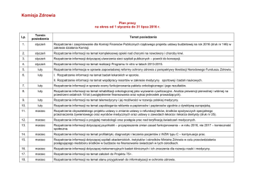 Komisja Zdrowia Plan pracy na okres od 1 stycznia do 31 lipca 2016 r. Lp. Termin posiedzenia 1. styczeń Rozpatrzenie i zaopiniowanie dla Komisji Finansów Publicznych rządowego projektu ustawy budżetowej na rok 2016 (druk nr 146) w zakresie działania Komisji. 2. styczeń Rozpatrzenie informacji na temat kompleksowej opieki nad chorymi na nowotwory i choroby krwi. 3. styczeń Rozpatrzenie informacji dotyczącej utworzenia sieci szpitali publicznych – powrót do koncepcji. 4. styczeń Rozpatrzenie informacji na temat realizacji Programu In vitro w latach 2013-2015. 5. luty Rozpatrzenie informacja w sprawie zapowiadanej reformy ochrony zdrowia z perspektywy likwidacji Narodowego Funduszu Zdrowia. 6. luty I. Rozpatrzenie informacji na temat badań lekarskich w sporcie. Temat posiedzenia II. Rozpatrzenie informacji na temat współpracy resortów w zakresie medycyny sportowej i badań naukowych. 7. luty Rozpatrzenie informacji w sprawie oceny funkcjonowania pakietu onkologicznego i jego rezultatów. 8. luty Rozpatrzenie informacji na temat rehabilitacji onkologicznej jako wyzwanie cywilizacyjne. Analiza prewencji pierwotnej i wtórnej na przestrzeni ostatnich 10 lat (uwzględnienie finansowania oraz wykaz jednostek prowadzących). 9. luty Rozpatrzenie informacji na temat telemedycyny i jej możliwości w rozwoju polskiej medycyny. 10. luty Rozpatrzenie informacji na temat zapobiegania reklamie e-papierosów i papierosów zgodnie z dyrektywą europejską. 11. marzec Rozpatrzenie obywatelskiego projektu ustawy o zmianie ustawy o refundacji leków, środków spożywczych specjalnego przeznaczenia żywieniowego oraz wyrobów medycznych oraz ustawy o zawodach lekarza i lekarza dentysty (druk nr 25). 12. marzec Rozpatrzenie informacji o przyjętej metodologii oraz postępie prac nad taryfikacją świadczeń medycznych. 13. marzec Rozpatrzenie informacji dotyczącej psychiatrii – przyspieszenie zmian zasad funkcjonowania – w roku 2016, nie 2017 – konieczność społeczna. 14. marzec Rozpatrzenie informacji na temat profilaktyki, diagnostyki i leczenia pacjentów z WZW typu C – kontynuacja prac. 15. marzec Rozpatrzenie informacji dotyczącej szpitali akademickich, instytutów i ośrodków Ministra Zdrowia w celu przeciwdziałania postępującego niedoboru środków w budżecie na finansowanie świadczeń w tych ośrodkach. 16. marzec Rozpatrzenie informacji dotyczącej niekomercyjnych badań klinicznych i ich znaczenia dla rozwoju nauki i medycyny. 17. marzec Rozpatrzenie informacji na temat założeń do Projektu 75+. 18. marzec Rozpatrzenie informacji na temat stanu przygotowań do informatyzacji w ochronie zdrowia. Lp. Termin posiedzenia 19. kwiecień Rozpatrzenie informacji dotyczącej kondycji polskiej urologii. 20. kwiecień Rozpatrzenie informacji dotyczącej problematyki leczenia nieswoistych zapaleń jelit wśród dzieci. 21. kwiecień Rozpatrzenie informacji dotyczącej wykorzystania konopi leczniczych w profilaktyce prozdrowotnej i medycynie. 22. kwiecień Rozpatrzenie informacji na temat problemów pacjentów reumatycznych. 23. kwiecień Rozpatrzenie informacji dotyczącej problematyki leczenia chorych na SM jako schorzenia interdyscyplinarnego, determinującego zaangażowanie różnych środowisk w usprawnianie życia chorych na stwardnienie rozsiane. 24. kwiecień Rozpatrzenie informacji na temat profilaktyki wśród dzieci i młodzieży z zakresu otyłości i cukrzycy. 25. maj Rozpatrzenie „Sprawozdania z realizacji Programu Ograniczania Zdrowotnych Następstw Palenia Tytoniu w Polsce w 2014 roku”. 26. maj Rozpatrzenie informacji dotyczącej map potrzeb zdrowotnych jako wyzwania w walce z białymi plamami w świadczeniach zdrowotnych na terenie Polski. 27. maj Rozpatrzenie informacji na temat funkcjonowania szpitali uniwersyteckich i klinicznych. 28. maj Rozpatrzenie informacji w sprawie obowiązkowych szczepień ochronnych oraz sytuacji epidemiologicznej w zakresie schorzeń zakaźnych w Polsce. 29. czerwiec Rozpatrzenie „Sprawozdania z realizacji Narodowego programu zwalczania chorób nowotworowych w roku 2015” oraz Harmonogramu zadań wykonywanych w ramach programu wieloletniego „Narodowy program zwalczania chorób nowotworowych” w roku 2014 wraz z kierunkami realizacji zadań tego programu na lata 2015 i 2016. 30. czerwiec Rozpatrzenie propozycji tematów kontroli do planu pracy Najwyższej Izby Kontroli na 2016 r. 31. czerwiec I. Rozpatrzenie i zaopiniowanie dla Komisji Finansów Publicznych Sprawozdania z wykonania budżetu państwa za okres od 1 stycznia do 31 grudnia 2015 r. wraz z Analizą NIK w zakresie działania Komisji. Temat posiedzenia II. Rozpatrzenie sprawozdania z działalności Najwyższej Izby Kontroli w zakresie działania Komisji. 32. czerwiec Rozpatrzenie informacji na temat polskiej stomatologii dziecięcej. 33. lipiec Zaopiniowanie projektu planu finansowego Narodowego Funduszu Zdrowia na 2017 r. 34. lipiec Rozpatrzenie informacji na temat koordynacji udzielania świadczeń zdrowotnych na szczeblu centralnym i wojewódzkim. 35. lipiec Rozpatrzenie informacji dotyczącej realnych kosztów świadczeń w ochronie zdrowia.