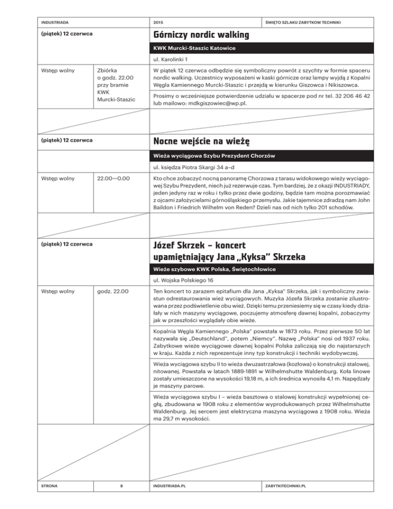 INDUSTRIADA 2015 (piątek) 12 czerwca Górniczy nordic walking ŚWIĘTO SZLAKU ZABYTKOW TECHNIKI KWK Murcki-Staszic Katowice ul. Karolinki 1 Wstęp wolny Zbiórka o godz. 22.00 przy bramie KWK Murcki-Staszic (piątek) 12 czerwca W piątek 12 czerwca odbędzie się symboliczny powrót z szychty w formie spaceru nordic walking. Uczestnicy wyposażeni w kaski górnicze oraz lampy wyjdą z Kopalni Węgla Kamiennego Murcki-Staszic i przejdą w kierunku Giszowca i Nikiszowca. Prosimy o wcześniejsze potwierdzenie udziału w spacerze pod nr tel. 32 206 46 42 lub mailowo: [email protected]. Nocne wejście na wieżę Wieża wyciągowa Szybu Prezydent Chorzów ul. księdza Piotra Skargi 34 a–d Wstęp wolny 22.00—0.00 (piątek) 12 czerwca Kto chce zobaczyć nocną panoramę Chorzowa z tarasu widokowego wieży wyciągowej Szybu Prezydent, niech już rezerwuje czas. Tym bardziej, że z okazji INDUSTRIADY, jeden jedyny raz w roku i tylko przez dwie godziny, będzie tam można porozmawiać z ojcami założycielami górnośląskiego przemysłu. Jakie tajemnice zdradzą nam John Baildon i Friedrich Wilhelm von Reden? Dzieli nas od nich tylko 201 schodów. Józef Skrzek – koncert upamiętniający Jana „Kyksa” Skrzeka Wieże szybowe KWK Polska, Świętochłowice ul. Wojska Polskiego 16 Wstęp wolny godz. 22.00 Ten koncert to zarazem epitafium dla Jana „Kyksa” Skrzeka, jak i symboliczny zwiastun odrestaurowania wież wyciągowych. Muzyka Józefa Skrzeka zostanie zilustrowana przez podświetlenie obu wież. Dzięki temu przeniesiemy się w czasy kiedy działały w nich maszyny wyciągowe, poczujemy atmosferę dawnej kopalni, zobaczymy jak w przeszłości wyglądały obie wieże. Kopalnia Węgla Kamiennego „Polska” powstała w 1873 roku. Przez pierwsze 50 lat nazywała się „Deutschland”, potem „Niemcy”. Nazwę „Polska” nosi od 1937 roku. Zabytkowe wieże wyciągowe dawnej kopalni Polska zaliczają się do najstarszych w kraju. Każda z nich reprezentuje inny typ konstrukcji i techniki wydobywczej. Wieża wyciągowa szybu II to wieża dwuzastrzałowa (kozłowa) o konstrukcji stalowej, nitowanej. Powstała w latach 1889-1891 w Wilhelmshutte Waldenburg. Koła linowe zostały umieszczone na wysokości 19,18 m, a ich średnica wynosiła 4,1 m. Napędzały je maszyny parowe. Wieża wyciągowa szybu I – wieża basztowa o stalowej konstrukcji wypełnionej cegłą, zbudowana w 1908 roku z elementów wyprodukowanych przez Wilhelmshutte Waldenburg. Jej sercem jest elektryczna maszyna wyciągowa z 1908 roku. Wieża ma 29,7 m wysokości. STRONA 8 INDUSTRIADA.PL ZABYTKITECHNIKI.PL INDUSTRIADA 2015 ŚWIĘTO SZLAKU ZABYTKOW TECHNIKI (piątek) 12 czerwca Pierwsza zmiana: palimy się do roboty Park Tradycji, Siemianowice Śląskie ul. E. Orzeszkowej 12 Wstęp wolny godz. 22.00 „Pogłoski” spektakl plenerowy „Praca” widowisko Teatru Ognia Nam-Tara Płonący piec węgierski – wypalanie pamiątek Bilety: 20 zł w cenie „czorny drink”– bezalkoholowy. Sprzedaż i rezerwacje ruszają 14 maja: T: 32 765 27 40 wew. 14 parktradycji@ siemck.pl godz. 23.00 Akustyczny koncert zespołu OBERSCHLESIEN Noc w Parku Tradycji rozświetlą płomienie. Ogień bowiem, obok pracy, jest wiodącym motywem wieczoru. Wszystko rozpocznie się o godz. 22.00 na placu przed Parkiem Tradycji od wypalania pamiątek w piecu węgierskim. Później na scenie pod Szybem Krystyn odbędzie się jednoaktowy spektakl plenerowy„Pogłoski, czyli rzecz o ostatnim dniu pracy Janka Bułki na kopalni Max, a głównie o domniemanych okolicznościach jego przykrego rozstania z tym światem“. W przedstawieniu napisanym specjalnie na INDUSTRIADĘ, opowieści niesamowite będą przeplatać się z elementami humorystycznymi i wątkami nawiązującymi do lokalnego kolorytu. O godzinie 23.00 w budynku Parku Tradycji grupa OBERSCHLESIEN – po raz pierwszy na Górnym Śląsku – zaprezentuje materiał z nowej płyty w wersji akustycznej. To będzie niepowtarzalna noc, pełna niespodzianek. Po cimoku, czorni choby diobły sam sie uwijōmy – aże iskry lecōm. Indystriada choby wulkan. Idzie noc, mōmy moc – i ôgyń w nos. Te słowa, napisane przez prof. Zbigniewa Kadłubka rozpoczną koncert zespołu OBERSCHLESIEN. (piątek) 12 czerwca Nocną szychtę czas zacząć Zabytkowa Kopalnia Srebra, Tarnowskie Góry ul. Szczęść Boże 81 Bilety: 40 zł Wymagana rezerwacja i przedpłata do 9.06. Szczegóły: bort@ kopalniasrebra.pl, T: 32 285 49 96 STRONA godz. 22.00 Dźwięk gwarkowskiego dzwonu, sztuczne ognie, uroczysta iluminacja wieży wyciągowej oraz nocne zwiedzanie z podziemnymi atrakcjami. Tak w piątek 12 czerwca rozpocznie się w Zabytkowej Kopalni Srebra industriadowa szychta. Najpierw przy zgaszonych światłach zabrzmi zarejestrowany cyfrowo dźwięk oryginalnego gwarkowskiego dzwonu. Do początków XX wieku oznajmiał on rozpoczęcie i zakończenie pracy górników. Później nastąpi uroczyste włączenie oświetlenia wieży wyciągowej kopalni, a w niebo polecą fajerwerki oznajmiając, że otwarto podziemia. W samych podziemiach czekać na nas będzie mroczna niespodzianka. 9 INDUSTRIADA.PL ZABYTKITECHNIKI.PL