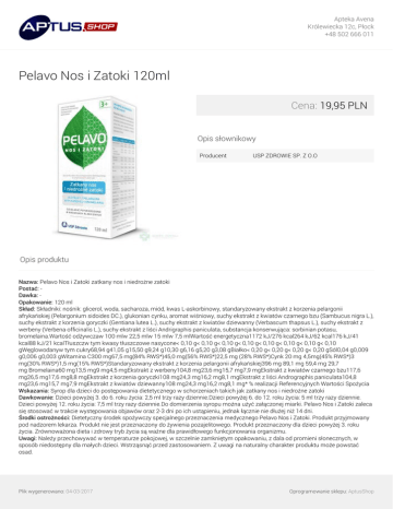 Apteka Avena Królewiecka 12c, Płock +48 502 666 011 Pelavo Nos i Zatoki 120ml Cena: 19,95 PLN Opis słownikowy Producent USP ZDROWIE SP. Z O.O Opis produktu Nazwa: Pelavo Nos i Zatoki zatkany nos i niedrożne zatoki Postać: Dawka: Opakowanie: 120 ml Skład: Składniki: nośnik: glicerol, woda, sacharoza, miód, kwas L-askorbinowy, standaryzowany ekstrakt z korzenia pelargonii afrykańskiej (Pelargonium sidoides DC.), glukonian cynku, aromat wiśniowy, suchy ekstrakt z kwiatów czarnego bzu (Sambucus nigra L.), suchy ekstrakt z korzenia goryczki (Gentiana lutea L.), suchy ekstrakt z kwiatów dziewanny (Verbascum thapsus L.), suchy ekstrakt z werbeny (Verbena officinalis L.), suchy ekstrakt z liści Andrigraphis paniculata, substancja konserwująca: sorbinian potasu, bromelaina.Wartość odżywczaw 100 mlw 22,5 mlw 15 mlw 7,5 mlWartość energetyczna1172 kJ/276 kcal264 kJ/62 kcal176 kJ/41 kcal88 kJ/21 kcalTłuszczw tym kwasy tłuszczowe nasycone< 0,10 g< 0,10 g< 0,10 g< 0,10 g< 0,10 g< 0,10 g< 0,10 g< 0,10 gWęglowodanyw tym cukry68,94 g41,05 g15,50 g9,24 g10,30 g6,16 g5,20 g3,08 gBiałko< 0,20 g< 0,20 g< 0,20 g< 0,20 gSól0,04 g0,009 g0,006 g0,003 gWitamina C300 mg67,5 mg(84% RWS*)45,0 mg(56% RWS*)22,5 mg (28% RWS*)Cynk 20 mg 4,5mg(45% RWS*)3 mg(30% RWS*)1,5 mg(15% RWS*)Standaryzowany ekstrakt z korzenia pelargonii afrykańskiej396 mg 89,1 mg 59,4 mg 29,7 mg Bromelaina60 mg13,5 mg9 mg4,5 mgEkstrakt z werbeny104,8 mg23,6 mg15,7 mg7,9 mgEkstrakt z kwiatów czarnego bzu117,6 mg26,5 mg17,6 mg8,8 mgEkstrakt z korzenia goryczki108 mg24,3 mg16,2 mg8,1 mgEkstrakt z liści Andrographis paniculata104,8 mg23,6 mg15,7 mg7,9 mgEkstrakt z kwiatów dziewanny108 mg24,3 mg16,2 mg8,1 mg* % realizacji Referencyjnych Wartości Spożycia Wskazania: Syrop dla dzieci do postępowania dietetycznego w schorzeniach takich jak zatkany nos i niedrożne zatoki Dawkowanie: Dzieci powyżej 3. do 6. roku życia: 2,5 ml trzy razy dziennie.Dzieci powyżej 6. do 12. roku życia: 5 ml trzy razy dziennie. Dzieci powyżej 12. roku życia: 7,5 ml trzy razy dziennie.Do domierzenia syropu można użyć załączonej miarki. Pelavo Nos i Zatoki zaleca się stosować w trakcie występowania objawów oraz 2-3 dni po ich ustąpieniu, jednak łącznie nie dłużej niż 14 dni. Środki ostrożności: Dietetyczny środek spożywczy specjalnego przeznaczenia medycznego Pelavo Nos i Zatoki. Produkt przyjmowany pod nadzorem lekarza. Produkt nie jest przeznaczony do żywienia pozajelitowego. Produkt przeznaczony dla dzieci powyżej 3. roku życia. Zrównoważona dieta i zdrowy tryb życia są ważne dla prawidłowego funkcjonowania organizmu. Uwagi: Należy przechowywać w temperaturze pokojowej, w szczelnie zamkniętym opakowaniu, z dala od promieni słonecznych, w sposób niedostępny dla małych dzieci. Wstrząsnąć przed zastosowaniem. Z uwagi na naturalny charakter produktu może powstać osad. Plik wygenerowano: 04-03-2017 Oprogramowanie sklepu: AptusShop Apteka Avena Królewiecka 12c, Płock +48 502 666 011 Plik wygenerowano: 04-03-2017 Powered by TCPDF (www.tcpdf.org) Oprogramowanie sklepu: AptusShop