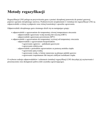 Metody regazyfikacji Regazyfikacja LNG polega na przywróceniu gazu z postaci skroplonej ponownie do postaci gazowej, poprzez ogrzanie skroplonego surowca. Podstawowymi urządzeniami w instalacji do regazyfikacji LNG są odparowalniki o różnej wydajności oraz różnej konstrukcji i sposobie ogrzewania. Odparowalniki skroplonego gazu ziemnego dzieli się na następujące grupy: odparowalniki z ogrzewaniem do temperatury równej temperaturze otoczenia odparowalniki ogrzewane wodą morską lub rzeczną (ORV) odparowalniki ogrzewane powietrzem (SPV) odparowalniki z ogrzewaniem do temperatury wyższej od temperatury otoczenia odparowalniki z ogrzewaniem bezpośrednim: ogrzewanie ogniowe – palnikami gazowymi ogrzewanie elektryczne odparowalniki z pośrednim ogrzewaniem za pomocą nośnika ciepła: ogrzewanie parą wodną ogrzewanie wodą, w której zanurzone są płonące palniki gazowe ogrzewanie izopentanem lub innymi ciekłymi nośnikami ciepła. O wyborze rodzaju odparowalników i schemacie instalacji regazyfikacji LNG decyduje jej usytuowanie i przeznaczenie oraz dostępność paliwa (lub czynnika ogrzewającego).