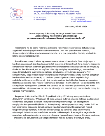 Prof. dr hab. n. med. Paweł Grieb Kierownik Zakładu Farmakologii Doświadczalnej Instytut Medycyny Doświadczalnej i Klinicznej im. M. Mossakowskiego Polskiej Akademii Nauk 02-106 Warszawa, ul. Pawińskiego 5 tel.: (22) 60-86-527 fax: (22) 60-86-527 e-mail: [email protected] Warszawa, 09.03.2015r. Ocena rozprawy doktorskiej Pani mgr Moniki Toporkiewicz „Liposomowy nośnik leku genetycznego przeznaczony do celowanej terapii nowotworów krwi” Przedłożona mi do oceny rozprawa doktorska Pani Moniki Toporkiewicz dotyczy kręgu zagadnień wzbudzających wielkie zainteresowanie. Jest nim poszukiwanie nowych, skuteczniejszych leków przeciwnowotworowych - a w tym przypadku, bardziej konkretnie, leków przeciwbiałaczkowych. Poszukiwania nowych leków są prowadzone w różnych kierunkach. Obecnie jednym z bardziej obiecujących jest konstruowanie tak zwanych „inteligentnych form leków”, złożonych nanostruktur których zadaniem jest selektywne dostarczanie substancji czynnej do miejsc jej działania. Ten kierunek jest szczególnie obiecujący między innymi dlatego, że umożliwić może terapeutyczną ingerencję w materiał genetyczny, czyli „terapię genową”. Przy konstruowaniu tego rodzaju leków wykorzystana być musi wiedza z wielu różnych, odległych bardzo od siebie dziedzin nauki, od biofizyki przez inżynierię chemiczną do biologii molekularnej i medycyny klinicznej - jest to więc zadanie intelektualnie bardzo wymagające. Rozprawa doktorska Pani Moniki Toporkiewicz dowodzi - moim zdaniem - że doktorantka tym szczególnym wymaganiom podołała. Nie oznacza to, że rozprawa pozbawiona jest wad i niedostatków - ale zaznaczam od razu, że nie mają one zasadniczego znaczenia dla oceny jej wartości merytorycznej. Rozprawa doktorska Pani Moniki Toporkiewicz liczy 122 strony maszynopisu i ma „klasyczną” konstrukcję. W liczącym 31 stron wstępie autorka omawia, kolejno: podstawowe wiadomości dotyczące białaczek i ich podłoża cytogenetycznego - ze szczególnym uwzględnieniem przewlekłej białaczki limfocytarnej i roli antyapoptotycznego białka Bcl-2 w tym schorzeniu; koncepcję terapii genowej i podstawowe kierunki poszukiwań metod terapeutycznego transferu materiału genetycznego do komórek, oraz zastosowanie wirusowych i niewirusowych nośników kwasów nukleinowych. Poszczególne zagadnienia omawiane są kompetentnie, w oparciu o obszerną i prawidłowo cytowaną literaturę naukową - chociaż wiele poruszonych we wstępie tematów nie ma związku z tematyką pracy. . 1 W dalszym ciągu Wstępu, na stronach od 21 do 25 przedstawione jest zagadnienie antysensowych oligonukleotydów jako potencjalnych leków przeciwnowotworowych; w tej kategorii bliżej omówiony jest Oblimersen, przedstawiony jako fosfotiolowany oligodeoksynukleozyd zawierający 18 zasad, skierowany przeciwko genowi białka Bcl-2. Oblimersen kilka lat temu był przedmiotem badań klinicznych jako potencjalna terapia przewlekłej białaczki limfatycznej. Zakończeniem wstępu jest podrozdział 5. zatytułowany „Naturalne bariery limitujące efektywne dostarczenie leku genetycznego do komórek docelowych”, który - moim zdaniem - zasługuje na szczególnie wysoką ocenę, gdyż w jasny i uporządkowany, wręcz plastyczny sposób przedstawia trudności, jakie na drodze do „miejsca docelowego” w komórce napotyka „lek genetyczny”, taki jak na przykład antysensowy oligonukleotyd. W tym podrozdziale zamieszczona jest rycina 6., będąca ilustracją omawianego zagadnienia. Z dużym prawdopodobieństwem przypuszcać można, że jest to autorskie dzieło doktorantki - jest to bowiem jedyna rycina we wstępie, która nie jest opatrzona odnośnikiem do źródła literaturowego. Schemat zamieszczony na tej rycinie jest bardzo pomocny w wyobrażeniu sobie trudności, jakie na swojej drodze pokonywać musi każdy terapeutyczny materiał genetyczny, zanim dotrze do miejsca docelowego - do jądra komórkowego albo do cytoplazmy. Z drugiej strony, podpis pod tym schematem jest - moim zdaniem - mylący, bo pokazane są na nim etapy i bariery, które musi pokonać nie „niewirusowy mośnik leków genetycznych”, lecz lek genetyczny taki jak antysens, który na pierwszych etapach umieszczony jest w nośniku, lecz w następnych jest już z niego uwolniony. Nie mam wątpliwości, że autorka o tym doskonale wie, bo przecież na str. 42 napisała: „Uważa się, że główną drogą wnikania liposomów i lipopleksów do wnętrza komórki docelowej jest endocytoza... , natomiast proces fuzji błon pozwala na uwolnienie lipopleksów lub samego materiału genetycznego z endosomu.” Drugą częścią rozprawy jest rozdział „Cel pracy”. Autorka definiuje cel swoich badań jako „stworzenie liposomowego nośnika antysensowych oligonukleotydów anty-BCL2 przeznaczonego do celowanej terapii nowotworów krwi pochodzenia B-komórkowego”, precyzując dalej, że nośnik taki powinien między innymi „... chronić zamknięty w nim kwas nukleinowy przed białkami surowicy i osocza...”, „wykazywać niską nieswoistą aktywność cytotoksyczną i hemolityczną”, oraz dobrze by było, aby dodatkowo „...charakteryzował się [on] zwiększoną toksycznością względem komórek docelowych”. Widać tu pewien kłopot ze zdefiniowaniem faktycznego celu pracy, bo czytelnik nabiera wątpliwości, czy celem tym jest opracowanie nośnika dla różnych leków genetycznych, na przykład dla różnych antysensowych oligonukleotydów, czy też chodzi o opracowanie konkretnej formy leku w oparciu o znaną substancję czynną o znanym działaniu przeciwbiałaczkowym? Zresztą ten kłopot zaznacza się już w tytule pracy, bo przecież to nie nośnik leku genetycznego będzie przeznaczony do terapii nowotworów krwi, lecz forma leku złożona z substancji czynnej leku umieszczonej w tym nośniku, na przykład w liposomie. 2 Kolejne niezgrabności pojawiają się już na następnej stronie, na której