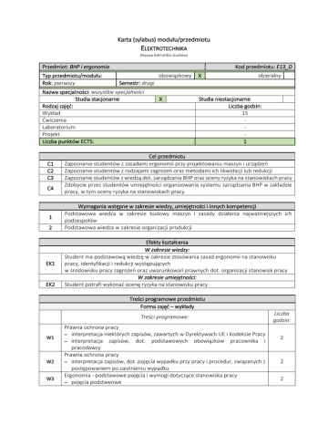 Karta (sylabus) modułu/przedmiotu ELEKTROTECHNIKA (Nazwa kierunku studiów) Przedmiot: BHP i ergonomia Typ przedmiotu/modułu: Rok: pierwszy Kod przedmiotu: E13_D C4 1 2 EK1 EK2 X obieralny X Studia niestacjonarne Liczba godzin: 15 1 Semestr: drugi Nazwa specjalności: wszystkie specjalności Studia stacjonarne Rodzaj zajęć: Wykład Ćwiczenia Laboratorium Projekt Liczba punktów ECTS: C1 C2 C3 obowiązkowy Cel przedmiotu Zapoznanie studentów z zasadami ergonomii przy projektowaniu maszyn i urządzeń Zapoznanie studentów z rodzajami zagrożeń oraz metodami ich likwidacji lub redukcji Zapoznanie studentów z wiedzą dot. zarządzania BHP oraz oceny ryzyka na stanowiskach pracy Zdobycie przez studentów umiejętności organizowania systemu zarządzania BHP w zakładzie pracy, w tym oceny ryzyka na stanowiskach pracy Wymagania wstępne w zakresie wiedzy, umiejętności i innych kompetencji Podstawowa wiedza w zakresie budowy maszyn i zasady działania najważniejszych ich podzespołów Podstawowa wiedza w zakresie organizacji produkcji Efekty kształcenia W zakresie wiedzy: Student ma podstawową wiedzę w zakresie stosowania zasad ergonomii na stanowisku pracy, identyfikacji i redukcji występujących w środowisku pracy zagrożeń oraz uwarunkowań prawnych dot. organizacji stanowisk pracy W zakresie umiejętności: Student potrafi wykonać ocenę ryzyka na stanowisku pracy Treści programowe przedmiotu Forma zajęć – wykłady Treści programowe: W1 W2 W3 Prawna ochrona pracy interpretacja niektórych zapisów, zawartych w Dyrektywach UE i Kodeksie Pracy interpretacja zapisów, dot. podstawowych obowiązków pracownika i pracodawcy Prawna ochrona pracy interpretacja zapisów, dot. pojęcia wypadku przy pracy i procedur, związanych z postępowaniem po zaistnieniu wypadku Ergonomia - podstawowe pojęcia i wymogi dotyczące stanowiska pracy pojęcia podstawowe Liczba godzin: 2 2 2 obciążenie układu kostnego i mięśniowego W4 W5 W6 W7 W8 1 F1 P1 Ergonomia - podstawowe pojęcia i wymogi dotyczące stanowiska pracy wydatek energetyczny a zdrowie człowieka stres i jego wpływ na stan organizmu oraz jakość wykonywanej pracy Zagrożenia na stanowisku pracy – pojęcia podstawowe klasyfikacja typowych zagrożeń na stanowisku pracy (zagrożenia mechaniczne, zagrożenia ergonomiczne, zagrożenia hałasem i drganiami, zagrożenia chemiczne, zagrożenia elektryczne, zagrożenia biologiczne) skutki oddziaływania w/w zagrożeń na organizm ludzki Metody redukcji i likwidacji zagrożeń na stanowisku pracy środki proceduralne, techniczne (także środki ochrony indywidualnej) i zachowawcze Zarządzanie bezpieczeństwem i higieną pracy – pojęcia podstawowe i elementy systemu Ocena ryzyka na stanowisku pracy (zasadność wykonywania i przegląd metod oceny ryzyka) Suma godzin: 2 2 2 2 1 15 Narzędzia dydaktyczne Wykład z prezentacją multimedialną oraz wykład konwersatoryjny Sposoby oceny Ocena formująca: Praca kontrolna w trakcie semestru Ocena podsumowująca: Zaliczenie w formie kolokwium Obciążenie pracą studenta Forma aktywności Średnia liczba godzin na realizowanie aktywności Godziny kontaktowe z wykładowcą, realizowane w formie zajęć dydaktycznych – łączna liczba 15 godzin w semestrze Godziny kontaktowe z wykładowcą realizowane w formie (np. konsultacji) – łączna liczba godzin w semestrze Przygotowanie się do zajęć – łączna liczba godzin w semestrze Suma 15 Sumaryczna liczba punktów ECTS dla przedmiotu 1 1 2 3 4 Literatura podstawowa i uzupełniająca Praca zespołowa pod redakcją naukową Danuty Koradeckiej: Bezpieczeństwo pracy i ergonomia (cz. 1 i 2) – Centralny Instytut Ochrony Pracy w Warszawie, Warszawa 1999 Praca zespołowa pod redakcją naukową Danuty Koradeckiej: Bezpieczeństwo i higiena pracy – Centralny Instytut Ochrony Pracy w Warszawie, W-wa 2008 Bugajska J., Gedliczka A., Konarska M., Roman-Liu D., Słowikowski J.: Ergonomia – Centralny Instytut Ochrony Pracy w Warszawie, W-wa 2000 Kowalewski S., Dąbrowski A., Dąbrowski M.: Zagrożenia mechaniczne – Centralny Instytut Ochrony Pracy w Warszawie, W-wa 2000 5 6 7 Kowalewski St.: Charakterystyka zagrożeń stwarzanych przez maszyny produkcyjne – Centralny Instytut Ochrony Pracy w Warszawie, W-wa 2000 Augustyńska D., Zawieska M.: Ochrona przed hałasem i drganiami w środowisku pracy – Centralny Instytut Ochrony Pracy w Warszawie, W-wa 1999 Jankowska E., Więcek E.: Pyły w środowisku pracy – Centralny Instytut Ochrony Pracy w Warszawie, W-wa 2007 Efekt kształcenia Macierz efektów kształcenia Odniesienie danego efektu kształcenia do efektów zdefiniowanych dla całego programu (PEK) EK1 E1A_W22 E1A_W09 EK2 E1A_W22 E1A_W09 Stopień w jakim efekty kształcenia związane są z przedmiotem Cele przedmiotu Treści programowe Narzędzia dydaktyczne +++ ++ C1, C2 W1÷W6, 1, 2 F1 P1 +++ ++ C3, C4 W7÷W8, 1, 2 F1 P1 Sposoby oceny Formy oceny - szczegóły Na ocenę 2 (ndst) EK1 EK2 Na ocenę 3 (dst) EK1 EK2 Na ocenę 3+ (dst+) EK1 EK2 Na ocenę 4 (db) EK1 EK2 EK1 Na ocenę 4+ (db+) EK2 Na ocenę 5 (bdb) EK1 Student nie potrafi wymienić i omówić rodzajów zagrożeń na określonym stanowisku pracy; nie zna podstawowych zasad ergonomii; nie potrafi zdefiniować pojęć: wypadek przy pracy, zarządzanie bhp, ocena ryzyka na stanowisku pracy Student nie potrafi dobrać metody oceny ryzyka do określonego stanowiska pracy Student potrafi wymienić i omówić rodzaje zagrożeń na określonym stanowisku pracy; zna podstawowe zasad y ergonomii; nie potrafi bez pomocy zdefiniować pojęć: wypadek przy pracy, zarządzanie bhp, ocena ryzyka na stanowisku pracy Student potrafi dobrać metodę oceny ryzyka do określonego stanowiska pracy; nie potrafi bez pomocy przeprowadzić oceny ryzyka na stanowisku pracy Student potrafi wymienić i omówić rodzaje zagrożeń na określonym stanowisku pracy; zna podstawowe zasad y ergonomii i potrafi je omówić; nie potrafi bez pomocy zd