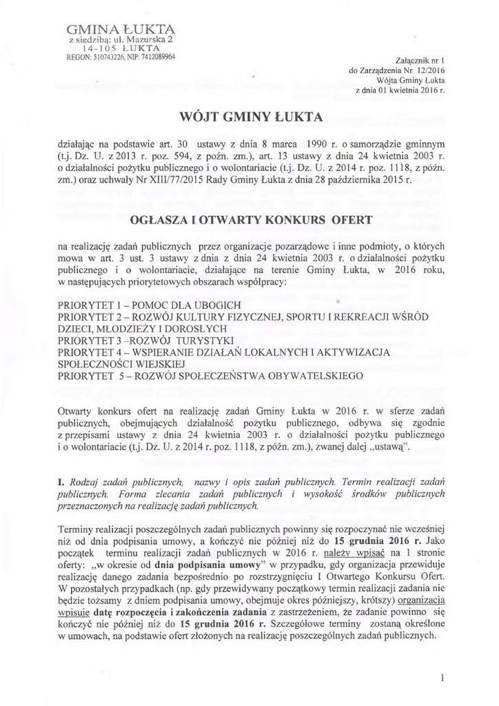 G M IN A ŁU K TA z s ie d z ib ą : u l. M a z u r s k a 2 14-105 Ł U K T A REGON: 510743226, NIP: 7412089964 Z a łą c z n ik nr j do Zarządzenia N r 12/2016 W ójta Gminy Łukta z dnia 01 kwietnia 2016 r. WÓJT GMINY ŁUKTA działając na podstawie art. 30 ustawy z dnia 8 marca 1990 r. o samorządzie gminnym (t.j. Dz. U. z 2013 r. poz. 594, z poźn. zm.), art. 13 ustawy z dnia 24 kwietnia 2003 r. o działalności pożytku publicznego i o wolontariacie (t.j. Dz. U. z 2014 r. poz. 1118, zpóźn. zm.) oraz uchwały Nr XIII/77/2015 Rady Gminy Łukta z dnia 28 października 2015 r. OGŁASZA I OTWARTY KONKURS OFERT na realizację zadań publicznych przez organizacje pozarządowe i inne podmioty, o których mowa w art. 3 ust. 3 ustawy z dnia z dnia 24 kwietnia 2003 r. o działalności pożytku publicznego i o wolontariacie, działające na terenie Gminy Łukta, w 2016 roku, w następujących priorytetowych obszarach współpracy: PRIORYTET 1 - POMOC DLA UBOGICH PRIORYTET 2 - ROZWÓJ KULTURY FIZYCZNEJ, SPORTU I REKREACJI WŚRÓD DZIECI, MŁODZIEŻY I DOROSŁYCH PRIORYTET 3 -ROZWÓJ TURYSTYKI PRIORYTET 4 - WSPIERANIE DZIAŁAŃ LOKALNYCH I AKTYWIZACJA SPOŁECZNOŚCI WIEJSKIEJ PRIORYTET 5 - ROZWÓJ SPOŁECZEŃSTWA OBYWATELSKIEGO Otwarty konkurs ofert na realizację zadań Gminy Łukta w 2016 r. w sferze zadań publicznych, obejmujących działalność pożytku publicznego, odbywa się zgodnie z przepisami ustawy z dnia 24 kwietnia 2003 r. o działalności pożytku publicznego i o wolontariacie (t.j. Dz. U. z 2014 r. poz. 1118, z późn. zm.), zwanej dalej „ustawą”. I. Rodzaj zadań publicznych, nazwy i opis zadań publicznych. Termin realizacji zadań publicznych. Forma zlecania zadań publicznych i wysokość środków publicznych przeznaczonych na realizacją zadań publicznych. Terminy realizacji poszczególnych zadań publicznych powinny się rozpoczynać nie wcześniej niż od dnia podpisania umowy, a kończyć nie później niż do 15 grudnia 2016 r. Jako początek terminu realizacji zadań publicznych w 2016 r. należy wpisać na 1 stronie oferty: „w okresie od dnia podpisania umowy” w przypadku, gdy organizacja przewiduje realizację danego zadania bezpośrednio po rozstrzygnięciu I Otwartego Konkursu Ofert. W pozostałych przypadkach (np. gdy przewidywany początkowy termin realizacji zadania nie będzie tożsamy z dniem podpisania umowy, obejmuje okres późniejszy, krótszy) organizacja wpisuje datę rozpoczęcia i zakończenia zadania z zastrzeżeniem, że zadanie powinno się kończyć nie później niż do 15 grudnia 2016 r. Szczegółowe terminy zostaną określone w umowach, na podstawie ofert złożonych na realizację poszczególnych zadań publicznych. 1 Uwaga! « Wskazane terminy realizacji zadań publicznych powinny być spójne z Harmonogramem działań (Rozdział III punkt 9 oferty). PRIORYTET 1 - POMOC DLA UBOGICH Zadanie Nr 1: Rodzaj zadania zgodny z art. 4 ustawy: Pomoc społeczna, w tym pomoc rodzinom i osobom w trudnej sytuacji życiowej oraz wyrównywania szans tych rodzin i osób. Nazwa zadania: „Świadczenie pomocy społecznej dla ubogich poprzez zbiórkę i wydawanie odzieży oraz sprzętu gospodarstwa domowego poprzez prowadzenie Punktu Wydawnictwa odzieży, sprzętu gospodarstwa domowego oraz prowadzenie nieodpłatnej Wypożyczalni Sprzętu Rehabilitacyjnego.” Opis zadania: zadanie polega w szczególności na: 1. Zbiórce i wydawaniu odzieży oraz sprzętu gospodarstwa domowego potrzebującym mieszkańcom Gminy Łukta. 2. Systematycznej segregacji pozyskanych darów rzeczowych. 3. Prowadzeniu Punktu Wydawania odzieży, sprzętu gospodarstwa domowego. 4. Prowadzeniu rozeznania sytuacji socjalnej środowisk wymagających pomocy rzeczowej w Gminie Łukta. 5. Prowadzeniu nieodpłatnej Wypożyczalni Sprzętu Rehabilitacyjnego 6. Prowadzenie rozeznania odnośnie potrzeb sprzętu rehabilitacyjnego wśród mieszkańców Gminy Łukta. Forma zlecania zadań publicznych: wspieranie zadania. Wysokość środków publicznych przeznaczonych na realizację zadania w 2016 r.: 3 000,00 zł PRIORYTET 2 - ROZWÓJ KULTURY FIZYCZNEJ. SPORTU I REKREACJI WŚRÓD DZIECI. MŁODZIEŻY I DOROSŁYCH Zadanie Nr I : Rodzaj zadania zgodny z art. 4 ustawy: Wspieranie i upowszechnianie kultury fizycznej. Nazwa zadania: „Popularyzacja piłki nożnej w środowisku wiejskim.” Opis zadania: zadanie polega w szczególności na: 1. Zwiększeniu dostępności społeczności lokalnej do działalności sportowej prowadzonej przez kluby sportowe. 2. Utrzymaniu, modernizacji i ulepszaniu niezbędnej bazy sportowej. 3. Organizacji rozgrywek sportowych na terenie Gminy Łukta. 4. Udziale w zawodach i rozgrywkach sportowych. 5. Uczestnictwie w imprezach sportowo-rekreacyjnych. 6. Przygotowaniu i zapewnieniu udziału dorosłych członków klubów sportowych w rozgrywkach ligowych piłki nożnej, zapewnieniu kadry szkoleniowej i pomocniczej. 7. Organizacji szkoleń dzieci i młodzieży w zakresie gry w piłkę nożną. 8. Poprawie warunków uprawiania sportu przez członków klubów sportowych, w tym m.in. zakup ubioru i wyposażenie sportowego. Forma zlecania zadań publicznych: wspieranie zadania. Wysokość środków publicznych przeznaczonych na realizację zadania w 2016 r.: 73 000,00 zł 2 Zadanie Nr 2: Rodzaj zadania zgodny z art. 4 ustawy: Wspieranie i upowszechnianie kultury fizycznej. Nazwa zadania: „Popularyzacja sportów walki wśród dzieci i młodzieży z terenu Gminy Łukta w dowolnym stylu karate.” Opis zadania: zadanie polega w szczególności na: 1. Popularyzacji sportów walki, jako formy aktywnego spędzania czasu wolnego i zdrowego trybu życia wśród dzieci i młodzieży z Gminy Łukta. 2. Organizacji wydarzeń sportowych, imprez lokalnych promujących sporty walki w konkurencji karate. 3. Przygotowaniu i zapewnieniu udziału drużyn w turniejach i zawodach karate. 4. Organizacji szkoleń, seminariów i zajęć treningowych karate dla dzieci i młodzieży, a w ty