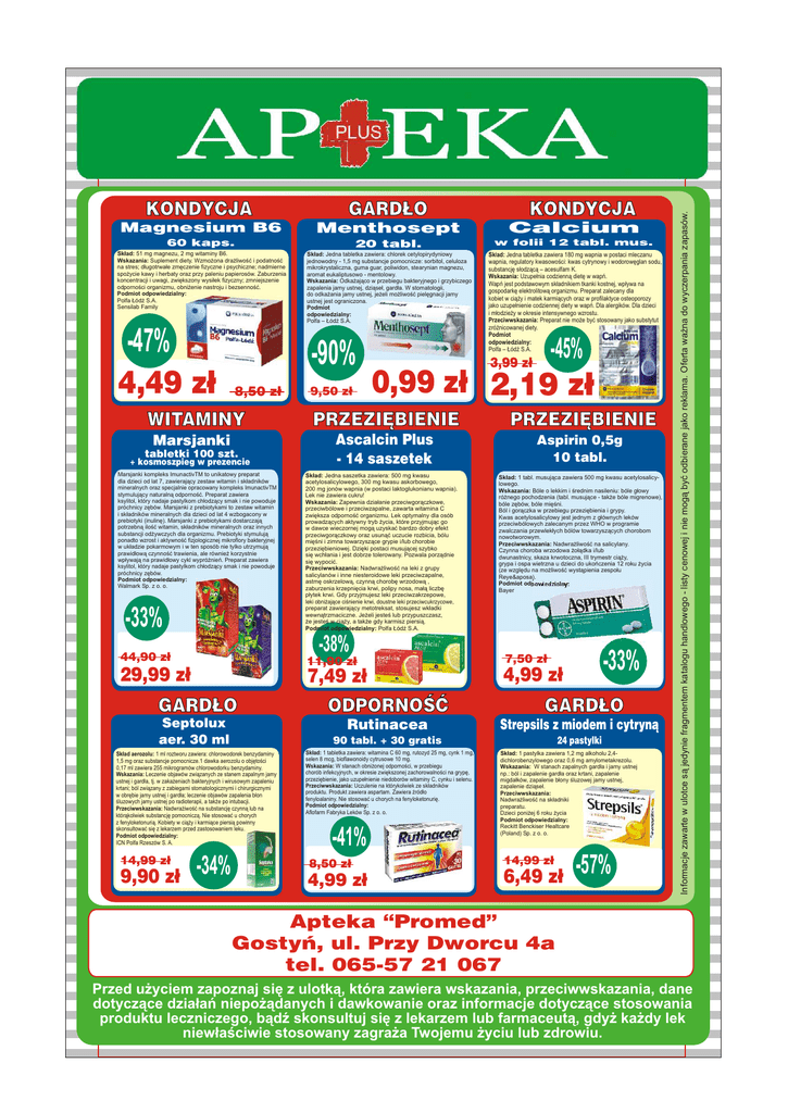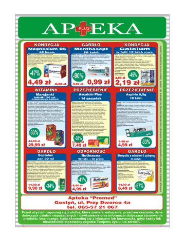 GARD£O Menthosept Calcium 60 kaps. 20 tabl. w folii 12 tabl. mus. Sk³ad: 51 mg magnezu, 2 mg witaminy B6. Wskazania: Suplement diety. Wzmo¿ona dra¿liwoœæ i podatnoœæ na stres; d³ugotrwa³e zmêczenie fizyczne i psychiczne; nadmierne spo¿ycie kawy i herbaty oraz przy paleniu papierosów. Zaburzenia koncentracji i uwagi, zwiêkszony wysi³ek fizyczny; zmniejszenie odpornoœci organizmu, obni¿enie nastroju i bezsennoœæ. Podmiot odpowiedzialny: Polfa £ódŸ S.A. Sensilab Family Sk³ad: Jedna tabletka zawiera: chlorek cetylopirydyniowy jednowodny - 1,5 mg substancje pomocnicze: sorbitol, celuloza mikrokrystaliczna, guma guar, poliwidon, stearynian magnezu, aromat eukaliptusowo - mentolowy. Wskazania: Odka¿aj¹co w przebiegu bakteryjnego i grzybiczego zapalenia jamy ustnej, dzi¹se³, gard³a. W stomatologii, do odka¿ania jamy ustnej, je¿eli mo¿liwoœæ pielêgnacji jamy ustnej jest ograniczona. Podmiot odpowiedzialny: Polfa – £ódŸ S.A. Sk³ad: Jedna tabletka zawiera 180 mg wapnia w postaci mleczanu wapnia, regulatory kwasowoœci: kwas cytrynowy i wodorowêglan sodu, substancjê s³odz¹c¹ – acesulfam K. Wskazania: Uzupe³nia codzienn¹ dietê w wapñ. Wapñ jest podstawowym sk³adnikiem tkanki kostnej, wp³ywa na gospodarkê elektrolitow¹ organizmu. Preparat zalecany dla kobiet w ci¹¿y i matek karmi¹cych oraz w profilaktyce osteoporozy jako uzupe³nienie codziennej diety w wapñ. Dla alergików. Dla dzieci i m³odzie¿y w okresie intensywnego wzrostu. Przeciwwskazania: Preparat nie mo¿e byæ stosowany jako substytut zró¿nicowanej diety. Podmiot odpowiedzialny: Polfa – £ódŸ S.A. -47% 4,49 z³ -90% 8,50 z³ WITAMINY Marsjanki tabletki 100 szt. + kosmoszpieg w prezencie Marsjanki kompleks ImunactivTM to unikatowy preparat dla dzieci od lat 7, zawieraj¹cy zestaw witamin i sk³adników mineralnych oraz specjalnie opracowany kompleks ImunactivTM stymuluj¹cy naturaln¹ odpornoœæ. Preparat zawiera ksylitol, który nadaje pastylkom ch³odz¹cy smak i nie powoduje próchnicy zêbów. Marsjanki z prebiotykami to zestaw witamin i sk³adników mineralnych dla dzieci od lat 4 wzbogacony w prebiotyki (inulinê). Marsjanki z prebiotykami dostarczaj¹ potrzebn¹ iloœæ witamin, sk³adników mineralnych oraz innych substancji od¿ywczych dla organizmu. Prebiotyki stymuluj¹ ponadto wzrost i aktywnoœæ fizjologicznej mikroflory bakteryjnej w uk³adzie pokarmowym i w ten sposób nie tylko utrzymuj¹ prawid³ow¹ czynnoœæ trawienia, ale równie¿ korzystnie wp³ywaj¹ na prawid³owy cykl wypró¿nieñ. Preparat zawiera ksylitol, który nadaje pastylkom ch³odz¹cy smak i nie powoduje próchnicy zêbów. Podmiot odpowiedzialny: Walmark Sp. z o. o. -33% GARD£O Septolux aer. 30 ml PRZEZIÊBIENIE Ascalcin Plus - 14 saszetek Aspirin 0,5g 10 tabl. Sk³ad: Jedna saszetka zawiera: 500 mg kwasu acetylosalicylowego, 300 mg kwasu askorbowego, 200 mg jonów wapnia (w postaci laktoglukonianu wapnia). Lek nie zawiera cukru! Wskazania: Zapewnia dzia³anie przeciwgor¹czkowe, przeciwbólowe i przeciwzapalne, zawarta witamina C zwiêksza odpornoœæ organizmu. Lek optymalny dla osób prowadz¹cych aktywny tryb ¿ycia, które przyjmuj¹c go w dawce wieczornej mog¹ uzyskaæ bardzo dobry efekt przeciwgor¹czkowy oraz usun¹æ uczucie rozbicia, bólu miêœni i zimna towarzysz¹ce grypie i/lub chorobie przeziêbieniowej. Dziêki postaci musuj¹cej szybko siê wch³ania i jest dobrze tolerowany. Pozwala porz¹dnie siê wypociæ. Przeciwwskazania: Nadwra¿liwoœæ na leki z grupy salicylanów i inne niesteroidowe leki przeciwzapalne, astmê oskrzelow¹, czynn¹ chorobê wrzodow¹ , zaburzenia krzepniêcia krwi, polipy nosa, ma³¹ liczbê p³ytek krwi. Gdy przyjmujesz leki przeciwzakrzepowe, leki obni¿aj¹ce ciœnienie krwi, doustne leki przeciwcukrzycowe, preparat zawieraj¹cy metotreksat, stosujesz wk³adki wewn¹trzmaciczne. Je¿eli jesteœ lub przypuszczasz, ¿e jesteœ w ci¹¿y, a tak¿e gdy karmisz piersi¹. Podmiot odpowiedzialny: Polfa £ódŸ S.A. -34% 7,49 z³ ODPORNOŒÆ Rutinacea Sk³ad: 1 tabl. musuj¹ca zawiera 500 mg kwasu acetylosalicylowego. Wskazania: Bóle o lekkim i œrednim nasileniu: bóle g³owy ró¿nego pochodzenia (tabl. musuj¹ce - tak¿e bóle migrenowe), bóle zêbów, bóle miêœni. Ból i gor¹czka w przebiegu przeziêbienia i grypy. Kwas acetylosalicylowy jest jednym z g³ównych leków przeciwbólowych zalecanym przez WHO w programie zwalczania przewlek³ych bólów towarzysz¹cych chorobom nowotworowym. Przeciwwskazania: Nadwra¿liwoœæ na salicylany. Czynna choroba wrzodowa ¿o³¹dka i/lub dwunastnicy, skaza krwotoczna, III trymestr ci¹¿y, grypa i ospa wietrzna u dzieci do ukoñczenia 12 roku ¿ycia (ze wzglêdu na mo¿liwoœæ wyst¹pienia zespo³u Reye&aposa). Podmiot odpowiedzialny: Bayer Sk³ad: 1 tabletka zawiera: witamina C 60 mg, rutozyd 25 mg, cynk 1 mg, selen 8 mcg, bioflawonoidy cytrusowe 10 mg. Wskazania: W stanach obni¿onej odpornoœci, w przebiegu chorób infekcyjnych, w okresie zwiêkszonej zachorowalnoœci na grypê, przeziêbienie, jako uzupe³nienie niedoborów witaminy C, cynku i selenu. Przeciwwskazania: Uczulenie na którykolwiek ze sk³adników produktu. Produkt zawiera aspartam. Zawiera Ÿród³o fenyloalaniny. Nie stosowaæ u chorych na fenyloketonuriê. Podmiot odpowiedzialny: Aflofarm Fabryka Leków Sp. z o. o. -41% 8,50 z³ 4,99 z³ -33% 7,50 z³ 4,99 z³ GARD£O Strepsils z miodem i cytryn¹ 90 tabl. + 30 gratis Sk³ad aerozolu: 1 ml roztworu zawiera: chlorowodorek benzydaminy 1,5 mg oraz substancje pomocnicze.1 dawka aerozolu o objêtoœci 0,17 ml zawiera 255 mikrogramów chlorowodorku benzydaminy. Wskazania: Leczenie objawów zwi¹zanych ze stanem zapalnym jamy ustnej i gard³a, tj. w zaka¿eniach bakteryjnych i wirusowym zapaleniu krtani; ból zwi¹zany z zabiegami stomatologicznymi i chirurgicznymi w obrêbie jamy ustnej i gard³a; leczenie objawów zapalenia b³on œluzowych jamy ustnej po radioterapii, a tak¿e po