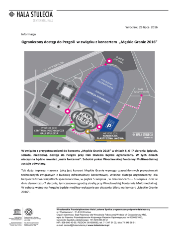 Wrocław, 28 lipca 2016 Informacja Ograniczony dostęp do Pergoli w związku z koncertem „Męskie Granie 2016” W związku z przygotowaniami do koncertu „Męskie Granie 2016” w dniach 5, 6 i 7 sierpnia (piątek, sobota, niedziela), dostęp do Pergoli przy Hali Stulecia będzie ograniczony. W tych dniach nieczynna będzie również „mała fontanna”. Sobotni pokaz Wrocławskiej Fontanny Multimedialnej zostaje odwołany. Tak duża impreza masowa jaką jest koncert Męskie Granie wymaga czasochłonnych przygotowań technicznych związanych z budową infrastruktury koncertowej. Właśnie dlatego organizatorzy, dla bezpieczeństwa wszystkich spacerowiczów, w piątek 5 sierpnia , w dniu koncertu – 6 sierpnia oraz w dniu demontażu-7 sierpnia, tymczasowo ogrodzą strefę przy Wrocławskiej Fontannie Multimedialnej. W sobotę wstęp na Pergolę będzie możliwy wyłącznie po okazaniu biletu na koncert „Męskie Granie 2016”. Wrocławskie Przedsiębiorstwo Hala Ludowa Spółka z ograniczoną odpowiedzialnością ul. Wystawowa 1, 51-618 Wrocław Organ rejestrowy: Sąd Rejonowy dla Wrocławia Fabrycznej Wydział VI Gospodarczy KRS, wpis do Rejestru Przedsiębiorców Krajowego Rejestru Sądowego pod nr 0000051000, wysokość kapitału zakładowego: 131.923.000,00 zł NIP: 896-000-10-95, REGON: 001005092, tel. 71 347 51 02, faks 71 348 68 51, e-mail: [email protected] www.halastulecia.pl W pierwszy sierpniowy weekend nie będzie można zatem swobodnie wypoczywać przy Fontannie Multimedialnej i na Pergoli, odwołany zostaje również sobotni wieczorny pokaz specjalny . Aby zrekompensować utrudnienia, w niedzielę odbędą się są dwa pokazy Fontanny: Piękna i Bestia oraz Mikro & Makro Kosmos. Ograniczenia potrwają do niedzieli , 7 sierpnia- godz. 15.00. Przepraszamy za utrudnienia! Wszystkich gości, którzy w tych dniach chcieliby spędzić czas na terenach zielonych Pergoli, przepraszamy za niedogodności i zapraszamy do zwiedzania Hali Stulecia /wejście D3/ oraz wystawy „Marilyn & Marlena – ikony kobiecości w obiektywie Miltona H. Greene’a” /wejście główne/, którą w dniach 5 – 7 sierpnia będzie można obejrzeć bezpłatnie. Przypominamy -wystawa jest czynna w godz.12.00-18.00. Jednocześnie, serdecznie zapraszamy w kolejny weekend, 13 – 14 sierpnia do uczestniczenia w zajęciach rekreacyjnych w ramach Lata na Pergoli oraz w piątek, 12 sierpnia do Letniego Kina , tym razem na dwa filmy! Więcej informacji na: www.halastulecia.pl/lato-na-pergoli/ gdzie także znajdziecie Państwo repertuar Letniego Kina . http://centrumpoznawcze.pl/ http://halastulecia.pl/marilyn-marlena/ *** Wrocławskie Przedsiębiorstwo Hala Ludowa Spółka z ograniczoną odpowiedzialnością ul. Wystawowa 1, 51-618 Wrocław Organ rejestrowy: Sąd Rejonowy dla Wrocławia Fabrycznej Wydział VI Gospodarczy KRS, wpis do Rejestru Przedsiębiorców Krajowego Rejestru Sądowego pod nr 0000051000, wysokość kapitału zakładowego: 131.923.000,00 zł NIP: 896-000-10-95, REGON: 001005092, tel. 71 347 51 02, faks 71 348 68 51, e-mail: [email protected] www.halastulecia.pl
