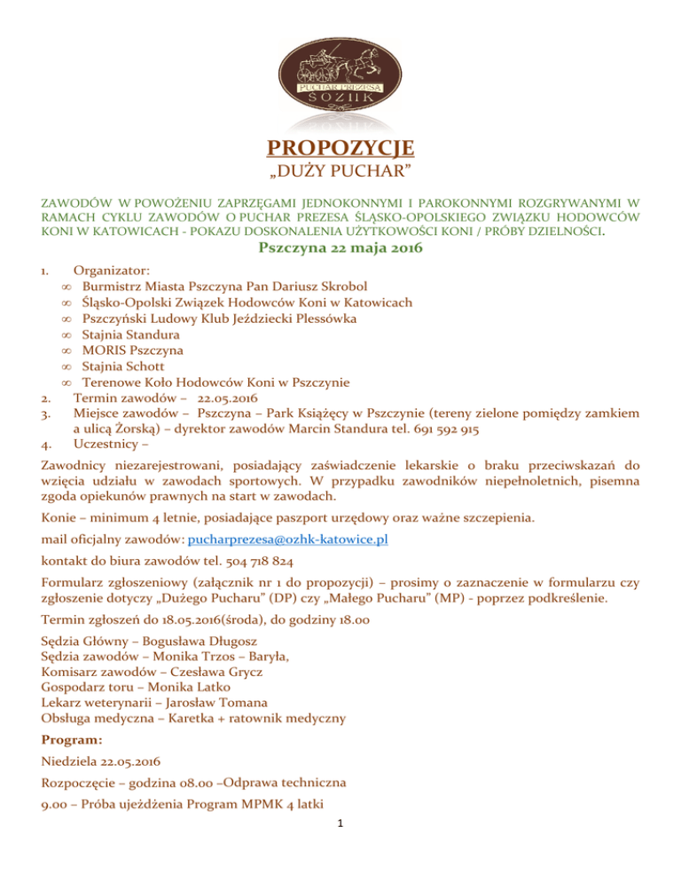 PROPOZYCJE „DUŻY PUCHAR” ZAWODÓW W POWOŻENIU WOŻENIU ZAPRZĘGAMI JEDNOKONNYMI I PAROKONNYMI ROZGRYWANYMI W RAMACH CYKLU ZAWODÓW O PUCHAR PREZESA ŚLĄSKO-OPOLSKIEGO ŚLĄSKO OPOLSKIEGO ZWIĄZKU HODOWCÓW KONI W KATOWICACH - POKAZU DOSKONALENIA UŻYTKOWOŚCI KONI / PRÓBY DZIELNOŚCI. DZIELNOŚCI Pszczyna 22 maja 2016 1. • • • • • • • 2. 3. 4. Organizator: Burmistrz Miasta Pszczyna Pan Dariusz Skrobol Śląsko-Opolski Opolski Związek Hodowców Koni w Katowicach Pszczyński Ludowy Klub Jeździecki Plessówka Stajnia Standura MORIS Pszczyna Stajnia Schott Terenowe Koło Hodowców Koni w Pszczynie Pszc Termin zawodów – 22.05.2016 .05.2016 Miejsce zawodów – Pszczyna – Park Książęcy w Pszczynie (tereny zielone pomiędzy zamkiem a ulicą Żorską) – dyrektor zawodów Marcin Standura tel. 691 592 915 Uczestnicy – Zawodnicy niezarejestrowani, posiadający zaświadczenie lekarskie o braku przeciwskazań do wzięcia udziału w zawodach sportowych. W przypadku zawodników niepełnoletnich, pisemna zgoda opiekunów prawnych na start w zawodach. Konie – minimum 4 letnie, posiadające ające paszport urzędowy oraz ważne szczepienia. mail oficjalny zawodów: [email protected] pucharprezesa@ozhk kontakt do biura zawodów tel. 504 718 824 Formularz zgłoszeniowy (załącznik nr 1 do propozycji) – prosimy o zaznaczenie w formularzu czy zgłoszenie dotyczy „Dużego Pucharu” (DP) czy „Małego Pucharu” (MP) - poprzez podkreślenie. Termin zgłoszeń do 18.05.2016(środa) .2016(środa), do godziny 18.00 Sędzia Główny – Bogusława Długosz Sędzia zawodów – Monika Trzos – Baryła, Komisarz zawodów – Czesława Grycz Gospodarz toru – Monika Latko Lekarz weterynarii – Jarosław Tomana Obsługa medyczna – Karetka + ratownik medyczny Program: Niedziela 22.05.2016 Odprawa techniczna Rozpoczęcie – godzina 08.00 –Odprawa 9.00 – Próba ujeżdżenia Program MPMK 4 latki 1 12.00 - 13.00 – Maraton kombinowany Godziny rozpoczęcia konkursów będą uzależnione od ilości zgłoszeń. Organizator zastrzega możliwość zmian w programie zawodów. Warunki techniczne: - Prosimy o przedstawienie dokumentów w loży sędziowskiej i wniesienie opłat w biurze zawodów. - opłata organizacyjna – 50 zł od zaprzęgu, - zgłoszenia po terminie; opłata organizacyjna – 60 zł Wpisowe należy wpłacić najpóźniej do 18.05.2016na konto Organizatora: Pszczyński Ludowy Klub Jeździecki „Plessówka” 43-241 Łąka ul. Jagiellońska 11 Nr konta: 81116022020000000162198866 - zawody będą rozgrywane zgodnie z przepisami PZJ; - organizator nie ponosi odpowiedzialności za wypadki, kradzieże oraz szkody mogące mieć miejsce podczas zawodów i transportu; Kodeks Postępowania z Koniem I. Polski Związek Jeździecki w ślad za Międzynarodową Federacją Jeździecką FEI oczekuje, że wszystkie osoby zaangażowane w jakikolwiek sposób w sporty konne, będą przestrzegać zasad niniejszego Kodeksu Postępowania z Koniem oraz przyjmą do wiadomości, że w każdym przypadku dobro konia musi być sprawą nadrzędną i nigdy nie może być podporządkowane współzawodnictwu sportowemu ani celom komercyjnym. II. Na wszystkich etapach treningu i przygotowań konia do startu w zawodach, dobro konia musi stać ponad wszelkimi innymi wymaganiami. Dotyczy to stałej opieki, metod treningu, starannego obrządku, kucia i transportu. III. Konie i jeźdźcy muszą być wytrenowani, kompetentni i zdrowi zanim wezmą udział w zawodach. Odnosi się to także do podawania leków i środków medycznych, zabiegów chirurgicznych zagrażających dobru konia lub ciąży klaczy, oraz do przypadków nadużywania pomocy medycznej. IV. Zawody nie mogą zagrażać dobru konia. Wymaga to zwrócenia szczególnej uwagi na teren zawodów, powierzchnię podłoża, pogodę, warunki stajenne, kondycję koni i ich bezpieczeństwo także podczas podróży powrotnej z zawodów. V. Należy dołożyć wszelkich starań, aby zapewnić koniom staranną opiekę po zakończeniu zawodów, a także humanitarne traktowanie po zakończeniu kariery sportowej. Dotyczy to właściwej opieki weterynaryjnej obrażeń odniesionych na zawodach, spokojnej starości, ewentualnie eutanazji. PZJ zachęca wszystkie osoby działające w sporcie jeździeckim do stałego podnoszenia swojej wiedzy oraz umiejętności dotyczących wszelkich aspektów współpracy z koniem. Propozycje zatwierdzone przez SZJ w dniu 10.05.2016 r. 2