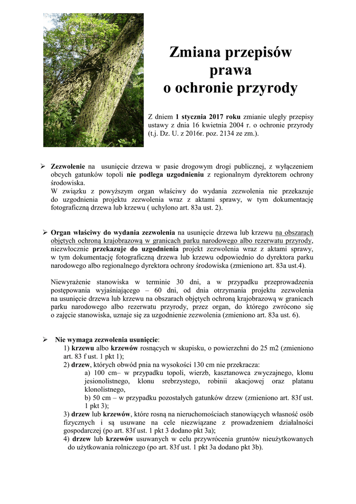 Zmiana przepisów prawa o ochronie przyrody Z dniem 1 stycznia 2017 roku zmianie uległy przepisy ustawy z dnia 16 kwietnia 2004 r. o ochronie przyrody (t.j. Dz. U. z 2016r. poz. 2134 ze zm.). Zezwolenie na usunięcie drzewa w pasie drogowym drogi publicznej, z wyłączeniem obcych gatunków topoli nie podlega uzgodnieniu z regionalnym dyrektorem ochrony środowiska. W związku z powyższym organ właściwy do wydania zezwolenia nie przekazuje do uzgodnienia projektu zezwolenia wraz z aktami sprawy, w tym dokumentację fotograficzną drzewa lub krzewu ( uchylono art. 83a ust. 2). Organ właściwy do wydania zezwolenia na usunięcie drzewa lub krzewu na obszarach objętych ochroną krajobrazową w granicach parku narodowego albo rezerwatu przyrody, niezwłocznie przekazuje do uzgodnienia projekt zezwolenia wraz z aktami sprawy, w tym dokumentację fotograficzną drzewa lub krzewu odpowiednio do dyrektora parku narodowego albo regionalnego dyrektora ochrony środowiska (zmieniono art. 83a ust.4). Niewyrażenie stanowiska w terminie 30 dni, a w przypadku przeprowadzenia postępowania wyjaśniającego – 60 dni, od dnia otrzymania projektu zezwolenia na usunięcie drzewa lub krzewu na obszarach objętych ochroną krajobrazową w granicach parku narodowego albo rezerwatu przyrody, przez organ, do którego zwrócono się o zajęcie stanowiska, uznaje się za uzgodnienie zezwolenia (zmieniono art. 83a ust. 6). Nie wymaga zezwolenia usunięcie: 1) krzewu albo krzewów rosnących w skupisku, o powierzchni do 25 m2 (zmieniono art. 83 f ust. 1 pkt 1); 2) drzew, których obwód pnia na wysokości 130 cm nie przekracza: a) 100 cm– w przypadku topoli, wierzb, kasztanowca zwyczajnego, klonu jesionolistnego, klonu srebrzystego, robinii akacjowej oraz platanu klonolistnego, b) 50 cm – w przypadku pozostałych gatunków drzew (zmieniono art. 83f ust. 1 pkt 3); 3) drzew lub krzewów, które rosną na nieruchomościach stanowiących własność osób fizycznych i są usuwane na cele niezwiązane z prowadzeniem działalności gospodarczej (po art. 83f ust. 1 pkt 3 dodano pkt 3a); 4) drzew lub krzewów usuwanych w celu przywrócenia gruntów nieużytkowanych do użytkowania rolniczego (po art. 83f ust. 1 pkt 3a dodano pkt 3b). 2 Rada gminy, w drodze uchwały stanowiącej akt prawa miejscowego, może określić, że przepisów art. 83 ust. 1 ustawy o ochronie przyrody nie stosuje się także do innych drzew lub krzewów wskazanych w oparciu o następujące kryteria: 1) gatunek drzewa lub krzewu, lub 2) wiek drzewa lub krzewu, lub 3) obwód pnia drzewa na wysokości 130 cm lub powierzchnia krzewu albo krzewów rosnących w skupisku, lub 4) cel usunięcia drzewa lub krzewu: a) związany jest z prowadzeniem działalności gospodarczej, b) niezwiązany jest z prowadzeniem działalności gospodarczej, lub 5) cechy nieruchomości: a) objęcie nieruchomości określonych przez radę gminy formami ochrony przyrody, o których mowa w art. 6 ust. 1 pkt 1–5, b) wpisanie do rejestru zabytków, c) położenie w pasie drogowym drogi publicznej, d) rodzaj użytku wynikający z ewidencji gruntów i budynków, e) określone przeznaczenie nieruchomości wynikające z miejscowego planu zagospodarowania przestrzennego lub decyzji o warunkach zabudowy i zagospodarowania terenu (dodano po art. 83f ust. 1 ust. 1a). W postępowaniu, którego przedmiotem jest sporządzenie projektu uchwały, o której mowa powyżej, zapewnia się możliwość udziału społeczeństwa, na zasadach i w trybie określonych w ustawie z dnia 3 października 2008 r. o udostępnianiu informacji o środowisku i jego ochronie, udziale społeczeństwa w ochronie środowiska oraz o ocenach oddziaływania na środowisko (dodano po art. 83f ust. 1a ust. 1b) Opłatę za usunięcie: 1) drzewa ustala się mnożąc liczbę cm obwodu pnia drzewa mierzonego na wysokości 130 cm i stawkę opłaty (zmieniono art. 85 ust. 1). 2) krzewu ustala się mnożąc liczbę metrów kwadratowych powierzchni gruntu pokrytej usuwanymi krzewami i stawkę opłaty (zmieniono art. 85 ust. 3). Rada gminy, w drodze uchwały stanowiącej akt prawa miejscowego, określa wysokość stawek opłat, jednolicie dla wszystkich drzew lub krzewów albo różnicując je ze względu na: 1) rodzaj lub gatunek drzew lub krzewów; 2) obwód pnia drzewa lub powierzchnię krzewu albo krzewów rosnących w skupisku (dodano po art. 85 ust. 4 ust. 4a). Stawki opłat za usuwanie: 1) drzew nie mogą przekraczać 500 zł (zmieniono art. 85 ust. 5) 2) krzewów nie mogą przekraczać 200 zł (zmieniono art. 85 ust. 6). W przypadku, gdy rada gminy nie określi wysokości stawek opłat, do ustalania opłaty za usunięcie drzewa lub krzewu stosuje się maksymalne stawki tj. 500 zł dla drzew i 200 zł dla krzewów (zmieniono art. 85 ust. 7). 3 Stawki, o których mowa powyżej podlegają z dniem 1 stycznia każdego roku waloryzacji o prognozowany średnioroczny wskaźnik cen towarów i usług konsumpcyjnych ogółem, przyjęty w ustawie budżetowej (zmieniono art. 85 ust. 8). Uchylono zapis, że nie nalicza się opłat za usunięcie drzew lub krzewów, na których usunięcie osoba fizyczna uzyskała zezwolenie na cele niezwiązane z prowadzeniem działalności gospodarczej (art. 86 ust. 1 pkt 2) Nie nalicza się opłat 1) za usunięcie drzew, których obwód pnia mierzony na wysokości 130 cm nie przekracza: a) 120 cm – w przypadku topoli, wierzb, kasztanowca zwyczajnego, klonu jesionolistnego, klonu srebrzystego, robinii akacjowej oraz platanu klonolistnego, b) 80 cm – w przypadku pozostałych gatunków drzew 2) w celu przywrócenia gruntów nieużytkowanych do użytkowania innego niż rolnicze, zgodnego z przeznaczeniem terenu, określonym w miejscowym planie zagospodarowania przestrzennego lub decyzji o warunkach zabudowy i zagospodarowania terenu (zmieniono art. 86 ust. 1 pkt 7), 3) za usunięcie krzewu lub krzewów rosnących w skupiskach, pokrywających grunt o powierzchni do 50 m2, w celu przywrócenia