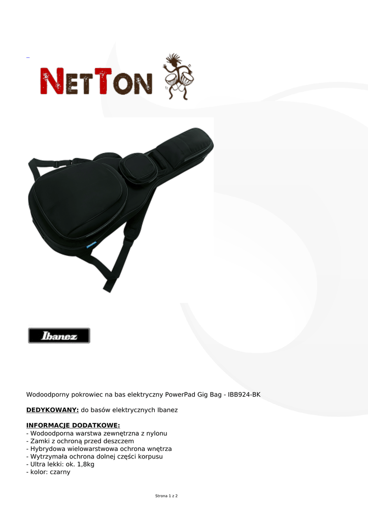 Wodoodporny pokrowiec na bas elektryczny PowerPad Gig Bag - IBB924-BK DEDYKOWANY: do basów elektrycznych Ibanez INFORMACJE DODATKOWE: - Wodoodporna warstwa zewnętrzna z nylonu - Zamki z ochroną przed deszczem - Hybrydowa wielowarstwowa ochrona wnętrza - Wytrzymała ochrona dolnej części korpusu - Ultra lekki: ok. 1,8kg - kolor: czarny Strona 1 z 2 Strona 2 z 2
