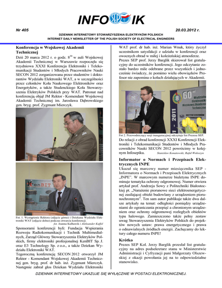 INFO IK Nr 405 20.03.2012 r. DZIENNIK INTERNETOWY STOWARZYSZENIA ELEKTRYKÓW POLSKICH INTERNET DAILY NEWSLETTER OF THE POLISH SOCIETY OF ELECTRICAL ENGINEERS • Konferencja w Wojskowej Akademii Technicznej Dziś 20 marca 2012 r. o godz. 830 w auli Wojskowej Akademii Technicznej w Warszawie rozpoczęła się trzydniowa XXXI Konferencja Elektroniki i Telekomunikacji Studentów i Młodych Pracowników Nauki SECON 2012 zorganizowana przez studentów i doktorantów Wydziału Elektroniki WAT, a w szczególności przez członków Koła Naukowego Elektroników oraz Energetyków, a takŜe Studenckiego Koła Stowarzyszenia Elektryków Polskich przy WAT. Patronat nad konferencją objął JM Rektor - Komendant Wojskowej Akademii Technicznej im. Jarosława Dąbrowskiego gen. bryg. prof. Zygmunt Mierczyk. WAT prof. dr hab. inŜ. Marian Wnuk, który Ŝyczył uczestnikom satysfakcji z udziału w konferencji oraz owocnych obrad w miłej i koleŜeńskiej atmosferze. Prezes SEP prof. Jerzy Barglik skierował list gratulacyjny do uczestników konferencji. Jego odczytanie zostało bardzo mile odebrane przez wszystkich i jednocześnie świadczy, Ŝe pomimo wielu obowiązków Profesor nie zapomina o kołach działających w Akademii. Fot 2. Przewodniczący sesji inauguracyjnej odczytuje list Prezesa SEP. Do relacji z obrad konferencji XXXI Konferencji Elektroniki i Telekomunikacji Studentów i Młodych Pracowników Nauki SECON 2012 powrócimy w kolejnym Infosepiku. Stanisław Konatowski, Rafał Wołoszyn Informator o Normach i Przepisach Elektrycznych INPE Fot. 1. Wystąpienie Rektora (zdjęcie górne) i Dziekana Wydziału Elektroniki WAT (zdjęcie dolne) podczas otwarcia konferencji. fot. Joanna Kulhawik i Aleksander Kuffel Sponsorami konferencji byli: Fundacja Wspierania Rozwoju Radiokomunikacji i Technik Multimedialnych, Zarząd Główny Stowarzyszenia Elektryków Polskich, firmy elektroniki profesjonalnej KenBIT Sp. J. oraz E3 Technology Sp. z o.o., a takŜe Dziekan Wydziału Elektroniki WAT. Tegoroczną konferencję SECON 2012 otworzył JM Rektor - Komendant Wojskowej Akademii Technicznej gen. bryg. prof. dr hab. inŜ. Zygmunt Mierczyk. Następnie zabrał głos Dziekan Wydziału Elektroniki Ukazał się marcowy numer miesięcznika SEP Informatora o Normach i Przepisach Elektrycznych „INPE”. W marcowym numerze biuletynu INPE dominuje tematyka ochrony odgromowej. Numer otwiera artykuł prof. Andrzeja Sowy z Politechniki Białostockiej pt. „NaraŜenie piorunowe sieci elektroenergetycznej zasilającej obiekt budowlany z urządzeniem piorunochronnym”. Ten sam autor publikuje takŜe dwa dalsze artykuły na temat: odległości pomiędzy urządzeniami do ograniczania przepięć a chronionym urządzeniem oraz ochrony odgromowej rozległych obiektów typu halowego. Zamieszczono takŜe pełny zestaw uwag Stowarzyszenia Elektryków Polskich do projektów nowych ustaw: prawa energetycznego i prawa o odnawialnych źródłach energii. Zachęcamy do lektury całego numeru INPE! Krótko Prezes SEP Kol. Jerzy Barglik przesłał list gratulacyjny na adres podsekretarz stanu w Ministerstwie Administracji i Cyfryzacji pani Małgorzaty Olszewskiej z okazji powołania jej na to odpowiedziałne stanowisko. DZIENNIK INTERNETOWY UKAZUJE SIĘ WYŁĄCZNIE W POSTACI ELEKTRONICZNEJ.