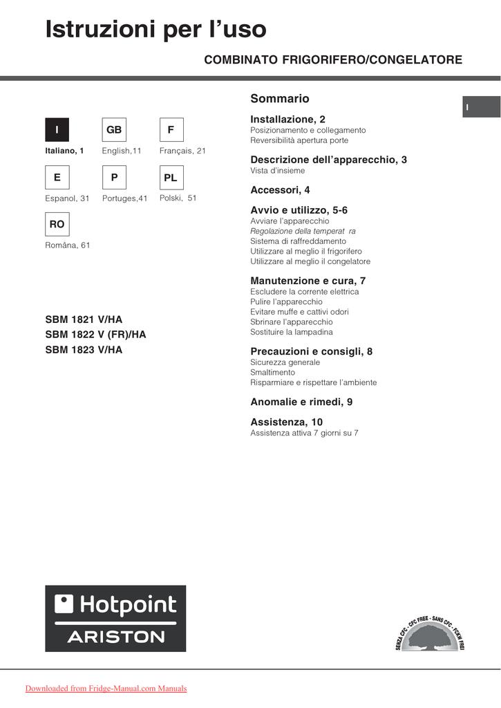 Istruzioni per luso COMBINATO FRIGORIFERO/CONGELATORE Sommario I Italiano, 1 E Espanol, 31 GB English,11 P Portuges,41 F Français, 21 PL Polski, 51 Installazione, 2 Posizionamento e collegamento Reversibilità apertura porte Descrizione dellapparecchio, 3 Vista dinsieme Accessori, 4 Avvio e utilizzo, 5-6 RO Româna, 61 Avviare lapparecchio Regolazione della temperat ra Sistema di raffreddamento Utilizzare al meglio il frigorifero Utilizzare al meglio il congelatore Manutenzione e cura, 7 SBM 1821 V/HA SBM 1822 V (FR)/HA SBM 1823 V/HA Escludere la corrente elettrica Pulire lapparecchio Evitare muffe e cattivi odori Sbrinare lapparecchio Sostituire la lampadina Precauzioni e consigli, 8 Sicurezza generale Smaltimento Risparmiare e rispettare lambiente Anomalie e rimedi, 9 Assistenza, 10 Assistenza attiva 7 giorni su 7 Downloaded from Fridge-Manual.com Manuals I Installazione I ! È importante conservare questo libretto per poterlo consultare in ogni momento. In caso di vendita, di cessione o di trasloco, assicurarsi che resti insieme allapparecchio per informare il nuovo proprietario sul funzionamento e sui relativi avvertimenti. ! Leggere attentamente le istruzioni: ci sono importanti informazioni sullinstallazione, sulluso e sulla sicurezza. Reversibilità apertura porte 1 Posizionamento e collegamento Posizionamento 1. Posizionare lapparecchio in un ambiente ben aerato e non umido. 2. Non ostruire le griglie posteriori di ventilazione: compressore e condensatore emettono calore e richiedono una buona aerazione per funzionare bene e contenere i consumi elettrici. 3. Lasciare una distanza di almeno 10 cm tra la parte superiore dellapparecchio ed eventuali mobili sovrastanti e di almeno 5 cm tra le fiancate e mobili/pareti laterali. 4. Lasciare lapparecchio lontano da fonti di calore (la luce solare diretta, una cucina elettrica). 5. Per mantenere una ottimale distanza del prodotto dalla parete posteriore, montare i distanzieri presenti nel kit di installazione seguendo le istruzioni presenti sul foglio dedicato. 2 3 Livellamento 1. Installare lapparecchio su un pavimento piano e rigido. 2. Se il pavimento non fosse perfettamente orizzontale, compensare svitando o avvitando i piedini anteriori. Collegamento elettrico Dopo il trasporto, posizionare lapparecchio verticalmente e attendere almeno 3 ore prima di collegarlo allimpianto elettrico. Prima di inserire la spina nella presa della corrente, accertarsi che: la presa abbia la messa a terra e sia a norma di legge; la presa sia in grado di sopportare il carico massimo di potenza della macchina, indicato nella targhetta caratteristiche posta nel vano frigorifero in basso a sinistra (es 150 W); la tensione di alimentazione sia compresa nei valori indicati nella targhetta caratteristiche, posta in basso a sinistra (es 220-240 V); la presa sia compatibile con la spina dellapparecchio. In caso contrario richiedere la sostituzione della spina a un tecnico autorizzato (vedi Assistenza); non usare prolunghe e multiple. ! Ad apparecchio installato, il cavo elettrico e la presa della corrente devono essere facilmente raggiungibili. ! Il cavo non deve subire piegature o compressioni. ! Il cavo deve essere controllato periodicamente e sostituito solo da tecnici autorizzati (vedi Assistenza). ! Lazienda declina ogni responsabilità qualora queste norme non vengano rispettate. 2 Downloaded from Fridge-Manual.com Manuals 4 5 ∅ 3mm Descrizione dellapparecchio Vista dinsieme I Le istruzioni sulluso valgono per diversi modelli per cui è possibile che la figura presenti particolari differenti rispetto a quelli dellapparecchio acquistato. La descrizione degli oggetti più complessi si trova nelle pagine seguenti. Manopola REGOLAZIONE DELLA TEMPERATURA PURE WIND RIPIANO WINE RACK* Cassetto FRUTTA e VERDURA Balconcino estraibile PORTAOGGETTI Balconcino PORTALATTINE* Balconcino BOTTIGLIE Vano CONGELAMENTO e CONSERVAZIONE Vano CONSERVAZIONE PIEDINO di regolazione Variabili per numero e/o per posizione. * Presente solo in alcuni modelli. Downloaded from Fridge-Manual.com Manuals 3 Accessori I 1 2 RIPIANI: pieni o a griglia. Sono estraibili e regolabili in altezza grazie alle apposite guide (vedi figura), per linserimento di contenitori o alimenti di notevole dimensione. Per regolare laltezza non è necessario estrarre completamente il ripiano. Indicatore TEMPERATURA*: per individuare la zona più fredda del frigorifero. 1. Controllare che sullindicatore risulti ben evidente OK (vedi figura). 2. Se non compare la scritta OK significa che la temperatura è troppo elevata: regolare la manopola FUNZIONAMENTO FRIGORIFERO su una posizione più alta (più freddo) e attendere circa 10 h finché la temperatura si sia stabilizzata. 3. Controllare nuovamente lindicatore: se necessario, procedere con una nuova regolazione. L'indicatore può essere completamente nero anche nel caso in cui siano state introdotte grosse quantità di alimenti o la porta del frigorifero sia stata aperta ripetutamente. In questo caso procedere con una nuova regolazione della temperatura (vedi Utilizzare il display). * Presente solo in alcuni modelli. 4 Downloaded from Fridge-Manual.com Manuals Avvio e utilizzo Avviare lapparecchio ! Prima di avviare lapparecchio, seguire le istruzioni sullinstallazione (vedi Installazione). ! Prima di collegare lapparecchio pulire bene i vani e gli accessori con acqua tiepida e bicarbonato. 1. Inserire la spina nella presa e accertarsi che si accenda la lampada di illuminazione interna. 2. Ruotare la manopola per LA REGOLAZIONE DELLA TEMPERATURA su un valore medio. Dopo qualche ora sarà possibile inserire alimenti nel frigorifero. Regolazione della temperatura La temperatura all'interno del reparto frigorifero si regola automaticamente in base alla posizione della manopola del termostato. 1 = meno freddo MAX = più freddo Si consiglia, comunque, una posizione media Per aumentare lo spazio e disposizione e migliorare l'aspetto estetico, questo apparecchio ha la