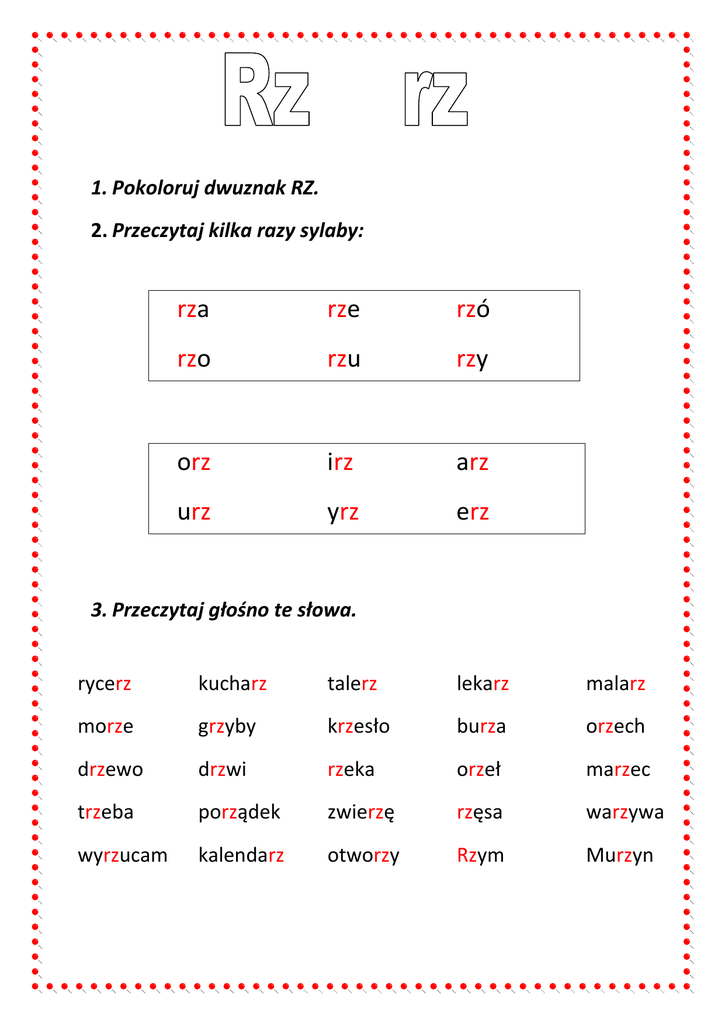 1. Pokoloruj dwuznak RZ. 2. Przeczytaj kilka razy sylaby: rza rze rzó rzo rzu rzy orz irz arz urz yrz erz 3. Przeczytaj głośno te słowa. rycerz kucharz talerz lekarz malarz morze grzyby krzesło burza orzech drzewo drzwi rzeka orzeł marzec trzeba porządek zwierzę rzęsa warzywa wyrzucam kalendarz otworzy Rzym Murzyn 4. Dopasuj połówki słów. Podpisz obrazki BU BY GRZY ________________________ ________________________ KA RZA RZE RZY WA _______________________ WA ________________________ 5. Przeczytaj zdania. Pokoloruj w nich dwuznak RZ. A. Malarz maluje domy. B. Wisła to polska rzeka. C. Nie lubię kiedy jest burza, grzmoty i błyskawice. D. Marzena i jej mama gotują zupę grzybową. E. Warzywa i owoce są zdrowe. F. Grzegorz myje talerze i kubki. 6. Podpisz rysunki. Wszystkie słowa mają dwuznak RZ. R................................... M.................................. O................................... D................................... D................................... K................................... 7. Poszukaj słów z RZ w każdej linijce G M B M T W R I K B D R E O A A A Z J R R O E R B R L W U U Z Z B G M U Z E A C G A U R R A R E R R A R K C Z Z R Z N Z Z D Z K H E Y Z A I T Y R A U U O B E F E R W Z N R T R A C E D Z A W K Z E Z W D T E Y W I I W S D 8. Przeczytaj i dorysuj. To rzeka. Pokoloruj ją na granatowo. Na rzece jest most z drewna. Na nim leżą grzyby. Daleko są dwie góry, wysoka po lewej, a niska po prawej stronie. Na wysokiej górze jest jedno drzewo. Na górze po prawej stronie stoi domek. Na niebie są ciemne chmury. Grzmi i błyska w oddali. To burza. 9. Tak czy nie? Zaznacz prawidłową odpowiedź. A. Orzeł to wielki ptak. TAK NIE B. Woda w morzu jest słona. TAK NIE C. Wrzątek to zimna woda. TAK NIE D. Grzyby i orzechy kupujemy w sklepie. TAK NIE E. Kucharz w pracy ma garnki i talerze. TAK NIE F. Drzwi i okna można otworzyć. TAK NIE G. Warto mieć porządek w pokoju. TAK NIE H. Wiewiórka nie wspina się na drzewa. TAK NIE I. Stoły i krzesła to meble. TAK NIE J. Koty mają trzy ogony. TAK NIE