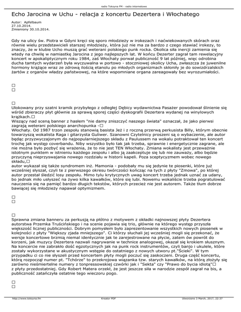 radio Toksyna FM - radio internetowe Echo Jarocina w Uchu - relacja z koncertu Dezertera i Włochatego Autor: Apfelbaum 27.10.2014. Zmieniony 30.10.2014. Gdy na ulicy św. Piotra w Gdyni kręci się sporo młodzieży w irokezach i naćwiekowanych skórach oraz równie wielu przedstawicieli starszej młodzieży, która już nie ma za bardzo z czego stawiać irokezy, to znaczy, że w klubie Ucho muszą grać weterani polskiego punk rocka. Okolica siła inercji zamienia się wtedy na chwilę w namiastkę Jarocina z jego najlepszych lat. W końcu Dezerter zagrał tam rewelacyjny koncert w apokaliptycznym roku 1984, zaś Włochaty porwał publiczność 9 lat później, więc odrobina ducha tamtych wydarzeń była wyczuwalna w portowo - stoczniowej okolicy Ucha, zwłaszcza że juwenilne hormony krążące wraz ze zdrową ilością etanolu po młodych organizmach skłoniły je do sowizdrzalskich żartów z organów władzy państwowej, na które wspomniane organa zareagowały bez wyrozumiałości. Ulokowany przy szatni kramik przybyłego z odległej Dębicy wydawnictwa Pasażer powodował ślinienie się wśród zbieraczy płyt głównie za sprawą sporej części dyskografii Dezertera wydanej na winylowych krążkach. Wiszący nad sceną banner z hasłem "nie damy zniszczyć naszego świata" oznaczał, że jako pierwsi zagrają weterani polskiego anarchopunka - Włochaty. Od 1987 trzon zespołu stanowią basista Jeż i z roczną przerwą perkusista Billy, którym obecnie towarzyszą wokalista Raga i gitarzysta Guliwer. Szanowni Czytelnicy proszeni są o wybaczenie, ale autor będąc przyzwyczajonym do najpopularniejszego składu z Paulussem na wokalu potraktował ten koncert trochę jak występ coverbandu. Niby wszystko było tak jak trzeba, sprawnie i energetycznie zagrane, ale nie można było pozbyć się wrażenia, że to nie jest TEN Włochaty. Zmiana wokalisty jest przeważnie istotnym punktem w istnieniu każdego zespołu i albo ją zaakceptuje się lub nie zauważy, albo będzie przyczyną nieprzyswajania nowego rozdziału w historii kapeli. Poza sceptycyzmem wobec nowego składu, autor wykazał się także syndromem inż. Mamonia - podobały mu się jedynie te piosenki, które już wcześniej słyszał, czyli te z pierwszego okresu twórczości kończąc na tych z płyty "Zmowa", po której autor przestał śledzić losy zespołu. Mimo tylu krytycznych uwag koncert trzeba jednak uznać za udany, bo jednak miło usłyszeć na żywo kilka kawałków, które się lubi. Nowemu wokaliście trzeba pogratulować nauczenia się na pamięć bardzo długich tekstów, których przecież nie jest autorem. Także tłum dobrze bawiącej się młodzieży napawał optymizmem. Sprawna zmiana banneru za perkusją na płótno z motywem z okładki najnowszej płyty Dezertera autorstwa Przemka Truścińskiego i na scenie pojawia się trio, głównie na którego występ przyszła większość licznej publiczności. Dobrym pomysłem było zaprezentowanie wszystkich nowych piosenek w kolejności z płyty "Większy zjada mniejszego". Ci którzy słuchali jej wcześniej mogli się przekonać, że wersje koncertowe brzmią niemal identycznie jak te zarejestrowane na płycie, zatem ów powrót do korzeni, jak muzycy Dezertera nazwali nagrywanie w technice analogowej, okazał się krokiem słusznym. Na koncercie nie zabrakło dość egzotycznych jak na punk rock instrumentów, czyli banjo i ukulele, które zostały wykorzystane w akustycznym wstępie do ostatniego z nowych utworu pt."Ścieki". W tym przypadku ci co nie słyszeli przed koncertem płyty mogli poczuć się zaskoczeni. Druga część koncertu, którą rozpoczął numer pt. "Tchórze" to przekrojowa wiązanka tzw. starych kawałków, na którą złożyły się zarówno nieśmiertelne numery z tonpressowskiej czwórki jak i "Sekta" czy "Prawo do bycia idiotą" z płyty przedostatniej. Gdy Robert Matera orzekł, że jest jeszcze siła w narodzie zespół zagrał na bis, a publiczność zatańczyła ostatnie tego wieczoru pogo. http://www.toksyna.fm Kreator PDF Utworzono 3 March, 2017, 22:37 radio Toksyna FM - radio internetowe Kilka rzeczy ewidentnie cieszy po tym koncercie. Wysoka frekwencja, której przyczyny można upatrywać także w występach obu zespołów na zupełnie niepunkowym Przystanku Woodstock; bardzo duża ilość młodzieży w tym także tej ortodoksyjnie-punkowo ubranej i uczesanej, a do tego dochodzi również całkiem spory ruch na stoisku wydawnictwa Pasażer. Być może większym powodzeniem cieszyły się tekstylia, a nie płyty, ale jednak trzeba docenić zainteresowanie udzielaniem dodatkowego wsparcia dla zespołów i niszowych wydawców. Powrotna podróż kolejką SKM, w której wielu pasażerów dzierżyło pod pachą siedmio i dwunastocalowe płyty należy podobnie jak koncert Włochatego i Dezertera do rzeczy przyjemnych. [p] Więcej zdjęć: tutaj http://www.toksyna.fm Kreator PDF Utworzono 3 March, 2017, 22:37