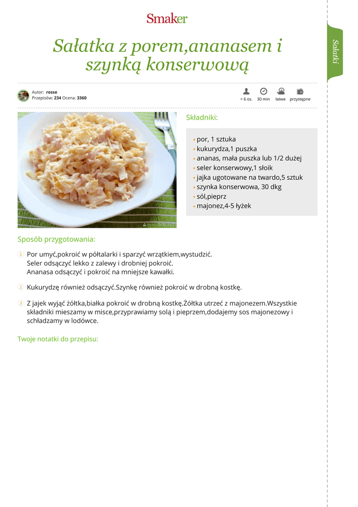 Sałatka z porem,ananasem i szynką konserwową Autor: rosse Przepisów: 234 Ocena: 3360 > 6 os. 30 min łatwe przystępne Składniki: por, 1 sztuka kukurydza,1 puszka ananas, mała puszka lub 1/2 dużej seler konserwowy,1 słoik jajka ugotowane na twardo,5 sztuk szynka konserwowa, 30 dkg sól,pieprz majonez,4-5 łyżek Sposób przygotowania: 1 Por umyć,pokroić w półtalarki i sparzyć wrzątkiem,wystudzić. Seler odsączyć lekko z zalewy i drobniej pokroić. Ananasa odsączyć i pokroić na mniejsze kawałki. 2 Kukurydzę również odsączyć.Szynkę również pokroić w drobną kostkę. 3 Z jajek wyjąć żółtka,białka pokroić w drobną kostkę.Żółtka utrzeć z majonezem.Wszystkie składniki mieszamy w misce,przyprawiamy solą i pieprzem,dodajemy sos majonezowy i schładzamy w lodówce. Twoje notatki do przepisu: