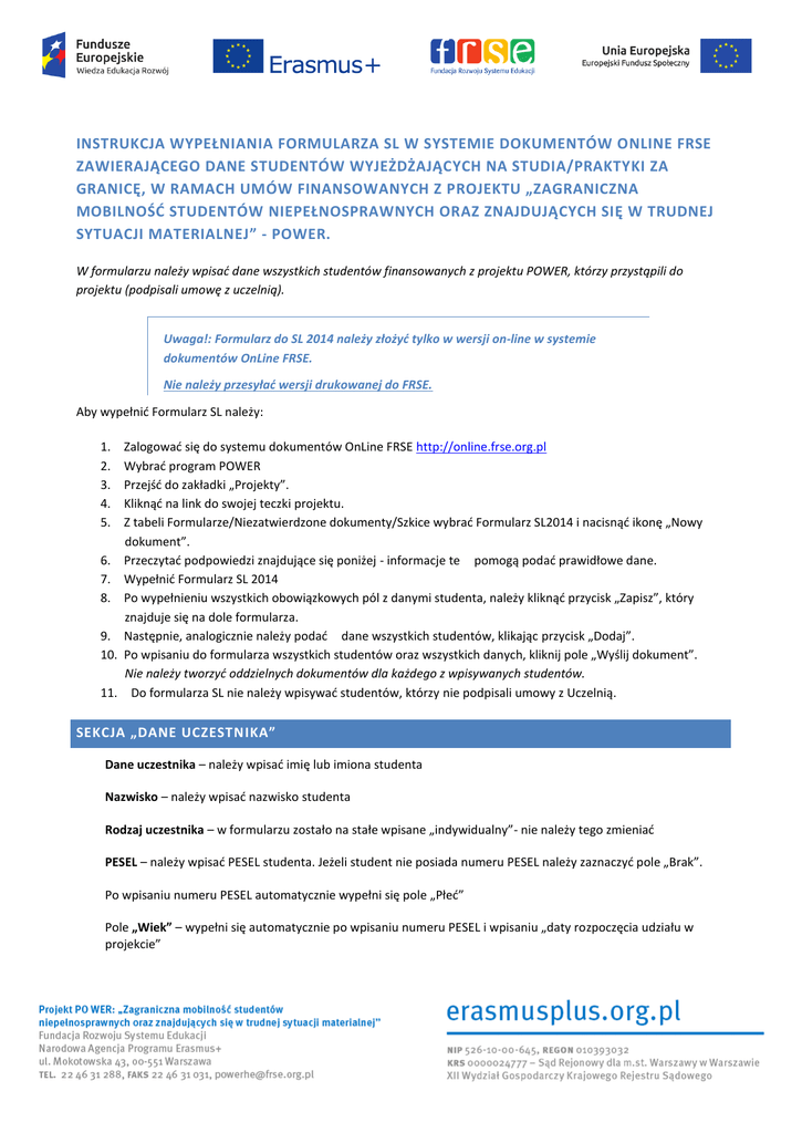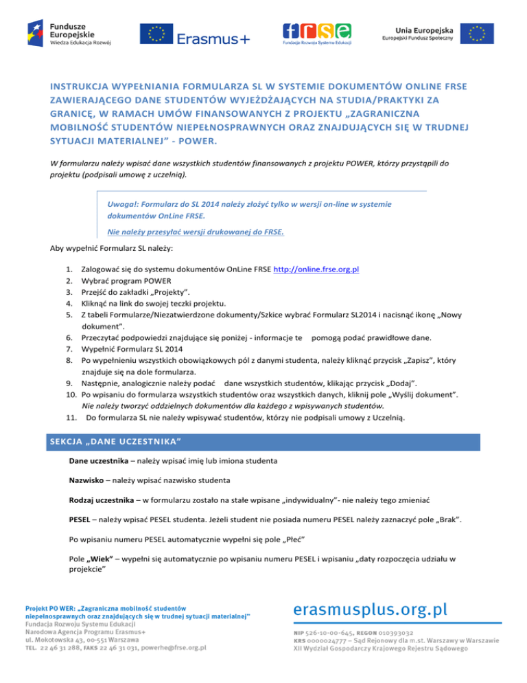 INSTRUKCJA WYPEŁNIANIA FORMULARZA SL W SYSTEMIE DOKUMENTÓW ONLINE FRSE ZAWIERAJĄCEGO DANE STUDENTÓW WYJEŻDŻAJĄCYCH NA STUDIA/PRAKTYKI ZA GRANICĘ, W RAMACH UMÓW FINANSOWANYCH Z PROJEKTU „ZAGRANICZNA MOBILNOŚĆ STUDENTÓW NIEPEŁNOSPRAWNYCH ORAZ ZNAJDUJĄCYCH SIĘ W TRUDNEJ SYTUACJI MATERIALNEJ” - POWER. W formularzu należy wpisać dane wszystkich studentów finansowanych z projektu POWER, którzy przystąpili do projektu (podpisali umowę z uczelnią). Uwaga!: Formularz do SL 2014 należy złożyć tylko w wersji on-line w systemie dokumentów OnLine FRSE. Nie należy przesyłać wersji drukowanej do FRSE. Aby wypełnić Formularz SL należy: 1. 2. 3. 4. 5. 6. 7. 8. 9. 10. 11. Zalogować się do systemu dokumentów OnLine FRSE http://online.frse.org.pl Wybrać program POWER Przejść do zakładki „Projekty”. Kliknąć na link do swojej teczki projektu. Z tabeli Formularze/Niezatwierdzone dokumenty/Szkice wybrać Formularz SL2014 i nacisnąć ikonę „Nowy dokument”. Przeczytać podpowiedzi znajdujące się poniżej - informacje te pomogą podać prawidłowe dane. Wypełnić Formularz SL 2014 Po wypełnieniu wszystkich obowiązkowych pól z danymi studenta, należy kliknąć przycisk „Zapisz”, który znajduje się na dole formularza. Następnie, analogicznie należy podać dane wszystkich studentów, klikając przycisk „Dodaj”. Po wpisaniu do formularza wszystkich studentów oraz wszystkich danych, kliknij pole „Wyślij dokument”. Nie należy tworzyć oddzielnych dokumentów dla każdego z wpisywanych studentów. Do formularza SL nie należy wpisywać studentów, którzy nie podpisali umowy z Uczelnią. SEKCJA „DANE UCZESTNIKA” Dane uczestnika – należy wpisać imię lub imiona studenta Nazwisko – należy wpisać nazwisko studenta Rodzaj uczestnika – w formularzu zostało na stałe wpisane „indywidualny”- nie należy tego zmieniać PESEL – należy wpisać PESEL studenta. Jeżeli student nie posiada numeru PESEL należy zaznaczyć pole „Brak”. Po wpisaniu numeru PESEL automatycznie wypełni się pole „Płeć” Pole „Wiek” – wypełni się automatycznie po wpisaniu numeru PESEL i wpisaniu „daty rozpoczęcia udziału w projekcie” W polu „Wykształcenie”- należy wybrać z listy rozwijalnej najwyższy poziom wykształcenia, który posiada uczestnik w chwili przystąpienia do projektu. SEKCJA „DANE KONTAKTOWE UCZESTNIKA” W tej sekcji należy wpisać adres kontaktowy studenta. UWAGA!: Należy podać adres kontaktowy, korespondencyjny, tzn. taki, który umożliwi dotarcie do danego uczestnika projektu w przypadku wylosowania do udziału w badaniu ewaluacyjnym. Obszar wg stopnia (DEGURBA)- pole to wypełni się automatycznie po wypełnieniu pola „Gmina” Pola „telefon kontaktowy” i „adres e-mail” – należy wpisać kontaktowy numer telefonu i e-mail studenta. SEKCJA „SZCZEGÓŁY I RODZAJ WSPARCIA” W polu „Data rozpoczęcia udziału w projekcie” – należy wpisać datę podpisania umowy pomiędzy studentem a uczelnią. UWAGA!: W przypadku, gdy najpierw została podpisana umowa o finansowanie wyjazdu w ramach programu Erasmus+, a następnie do umowy został podpisany aneks na dofinansowanie stypendium ze środków POWER, to w tym polu należy wpisać datę podpisania umowy ze studentem w ramach programu Erasmus+. W przypadku, gdy uczelnia podpisała ze studentem tylko umowę o dofinansowanie stypendium ze środków POWER należy wpisać datę podpisania tej umowy. W polu „Data zakończenia udziału w projekcie” należy wpisać datę zakończenia mobilności zgodną z datą wpisaną do Mobility Tool. W polu „Zakończenie udziału osoby w projekcie zgodnie z zaplanowaną przez nią ścieżką uczestnictwa” należy wybrać TAK lub NIE – pole obowiązkowe. UWAGA!: Wypełnić tylko w przypadku zakończenia mobilności. W polu „Status osoby na rynku pracy” – zostało wpisane „osoba bierna zawodowo” – nie należy tego zmieniać. W polu „Doprecyzowanie statusu” – zostało wpisane „osoba ucząca się” – nie należy tego zmieniać. W polu „Sytuacja osoby w momencie zakończenia udziału w projekcie (1)” – należy wybrać jedną z podanych opcji. W polu „Sytuacja osoby w momencie zakończenia udziału w projekcie (2)” – należy wybrać jedna z podanych opcji, inną niż wybrana w polu „Sytuacja osoby w momencie zakończenia udziału w projekcie (1)” UWAGA!: Pole „Sytuacja osoby w momencie zakończenia udziału w projekcie (2)” jest nieobowiązkowe W polu „Rodzaj przyznanego wsparcia” - zostało wpisane „program mobilności ponadnarodowej” – nie należy tego zmieniać. W polu „Doprecyzowanie rodzaju wsparcia” należy wybrać: - w przypadku, jeśli student wyjeżdża na studia należy wybrać „studia w uczelni zagranicznej” - w przypadku, jeśli student wyjeżdża na praktykę należy wybrać „staż/praktyka w zagranicznym przedsiębiorstwie. W polu „Data rozpoczęcia udziału we wsparciu” należy wpisać datę rozpoczęcia mobilności zgodną z datą wpisaną do Mobility Tool. W polu „Data zakończenia udziału we wsparciu” należy wpisać datę zakończenia mobilności zgodną z datą wpisaną do Mobility Tool. Jeżeli nie jest znana data zakończenia mobilności należy pozostawić pole puste. ! Uwaga: daty w polach „Data zakończenia udziału we wsparciu” i „Data zakończenia udziału w projekcie” powinny być takie same. SEKCJA „STATUS UCZESTNIKA PROJEKTU W CHWILI PRZYSTĄPIENIA DO PROJEKTU” - w przypadku studenta niepełnosprawnego obowiązkowe jest zaznaczenie TAK w polu „Osoba z niepełnosprawnościami” - w przypadku studenta z prawem do „dodatku socjalnego” obowiązkowe jest zaznaczenie TAK w polu „Osoba w innej niekorzystnej sytuacji społecznej (innej niż wymienione powyżej)” Pozostałe informacje w tej sekcji należy podać zgodnie z deklarację studenta.