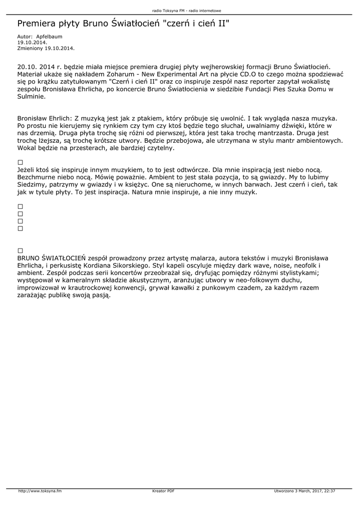 radio Toksyna FM - radio internetowe Premiera płyty Bruno Światłocień "czerń i cień II" Autor: Apfelbaum 19.10.2014. Zmieniony 19.10.2014. 20.10. 2014 r. będzie miała miejsce premiera drugiej płyty wejherowskiej formacji Bruno Światłocień. Materiał ukaże się nakładem Zoharum - New Experimental Art na płycie CD.O to czego można spodziewać się po krążku zatytułowanym "Czerń i cień II" oraz co inspiruje zespół nasz reporter zapytał wokalistę zespołu Bronisława Ehrlicha, po koncercie Bruno Światłocienia w siedzibie Fundacji Pies Szuka Domu w Sulminie. Bronisław Ehrlich: Z muzyką jest jak z ptakiem, który próbuje się uwolnić. I tak wygląda nasza muzyka. Po prostu nie kierujemy się rynkiem czy tym czy ktoś będzie tego słuchał, uwalniamy dźwięki, które w nas drzemią. Druga płyta trochę się różni od pierwszej, która jest taka trochę mantrzasta. Druga jest trochę lżejsza, są trochę krótsze utwory. Będzie przebojowa, ale utrzymana w stylu mantr ambientowych. Wokal będzie na przesterach, ale bardziej czytelny. Jeżeli ktoś się inspiruje innym muzykiem, to to jest odtwórcze. Dla mnie inspiracją jest niebo nocą. Bezchmurne niebo nocą. Mówię poważnie. Ambient to jest stała pozycja, to są gwiazdy. My to lubimy Siedzimy, patrzymy w gwiazdy i w księżyc. One są nieruchome, w innych barwach. Jest czerń i cień, tak jak w tytule płyty. To jest inspiracja. Natura mnie inspiruje, a nie inny muzyk. BRUNO ŚWIATŁOCIEŃ zespół prowadzony przez artystę malarza, autora tekstów i muzyki Bronisława Ehrlicha, i perkusistę Kordiana Sikorskiego. Styl kapeli oscyluje między dark wave, noise, neofolk i ambient. Zespół podczas serii koncertów przeobrażał się, dryfując pomiędzy różnymi stylistykami; występował w kameralnym składzie akustycznym, aranżując utwory w neo-folkowym duchu, improwizował w krautrockowej konwencji, grywał kawałki z punkowym czadem, za każdym razem zarażając publikę swoją pasją. http://www.toksyna.fm Kreator PDF Utworzono 3 March, 2017, 22:37