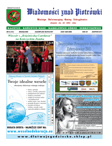 KOÖCZYCE MAŁE MAÈE - MARKLOWICE GÓRNE - ZEBRZYDOWICE KACZYCE - KOŃCZYCE (145) NR 82 (151) MIESIÊCZNIK EGZEMPLARZ bezp£atny BEZP£ATNY egzemplarz Wieczórprojekt z „Księżniczką Czardasza” Unijny na Kończyckim Zamku w przedszkolu str. 13 ISSN 1508-0986 LUTY 2011 RokROK XII XII SIERPIEŃ IX Halowy Turniej Piãki Noēnej w Kaczycach str. 11 Serdecznie zapraszają ks. bp Bielsko-Żywiecki Tadeusz Rakoczy, Wójt Gminy Zebrzydowice Andrzej Kondziołka oraz Starosta Cieszyński Czesław Gluza. Diecezjalne Doæynki w tym roku w Zebrzydowicach str. 16 nowość NOWO¹» - kostka KOSTKA granitowa GRANITOWA - s St Tr R. 2 konkurs fotograficzny „cztery pory roku” SzczegóÊy str. 5 W TYM NUMERZE: 9 WaÔne zmiany w opiece zdrowotnej - str. 13 9 Poradnik dla rodziców - str. 17 9 KÌcik kulinarny - str. 19 F . H . U . Stañczyk STAÑCZYK S TtUuD d U DrYo -dSyo l a-r i uNmo nwo o ! m-p y -s I Oi o URO w śe ćl a t rs t. r . 86 Gminne Przedszkole Publiczne w Zebrzydowicach z oddziaäami w Marklowicach Górnych, Kaczycach i Koþczycach Maäych ogäasza, Ĕe zapisy dzieci na rok szkolny 2011/2012 odbödñ siö w marcu 2011 r. Karty zgÊoszeØ bÖdÌ dostÖpne w wymienionych placówkach od 01.03.2011 r. Przed zäoĔeniem karty prosimy rodziców o zapoznanie siö z zasadami rekrutacji (dostöpne w kaĔdej placówce). Na 11 wrzeÎnia tego roku zaplanowano w Zebrzydowicach uroczystoÎci zwiÌzane z tradycyjnymi DoÔynkami Diecezjalnymi. Wezmñ w nich udziaä oprócz rolników równieĔ przedstawiciele wäadz koĈcielnych, samorzñdowych i paþstwowych. BOGATA oferta OFERTA - najniższe NAJNIÓSZE ceny CENY na: NA: Bogata www.weselnedekoracje.eu w w w . d l a t w o j e g o d z i e c k a . s k l eWiadomoœci p . p lznad Piotrówki 1 SkÊad jest czynny: od pn.-pt. 8.00 - 16.00 w soboty odjest 8.00czynny: do 13.00 Skład od pn.-pt. 7.00 - 16.00 www.fhustanczyk.pl w soboty od 7.00 do 13.00 www.fhustanczyk.pl GROSZEK ZWYKŁY EKO-GROSZEK - do pieców z podajnikiem - KWK Bobrek Węgiel: Orzech - Piast nowa Posezo daż Orzech--KWK Marcel ORZECH Piast wyprze ów MUŁ - KWK -Rydułtowy Groszek Ziemowit kształtownikbat 20% Ra FLOT - KWK Marcel znych Eko groszek - Bobrek żelaChwałowice FLOT - KWK Jankowice - Rydułtowy -Muł zasuwy, zamki, zawiasy, klamki i inne Flot - Marcel artykuły metalowe, drut do migo-mag Flot - Jankowice Transport przy zakupie 1 tony Transport przy zakupie tony opału na terenie gminy -1gratis! opału na terenie gminy - gratis! Oferujemy węgiel workowany Groszek - eko-groszek (na paletach) Oferujemy węgiel workowany i koks na paletach z rozładunkiem Groszek - eko-groszek (na paletach) za pomocą HDS-u! HDS-u! z rozładunkiem za pomocą PRAKTYCZNIEIIWYGODNIE WYGODNIE PRAKTYCZNIE Zasuwy, zamki, zawiasy, klamki i inne artykuły metalowe, drut do migo-mag Żagiel i Lukas - kamień czerwony - granulacja 8 do 16 Kostka granitowa - kostka szara - kostka rudo-szara - kostka czarna - kostka czerwona ZAMÓWIENIA TELEFONICZNE 2 Wiadomoœci znad Piotrówki 32 469 10 39 2 Wiadomoœci znad Piotrówki opał, piasek, kamień, . kostka granitowa itp NA RATY GRANITOWY grYSY KOLOROWE - biały, różowy, zielony, szary Obrzeża granitowe 40 x 20 Obrzeża granitowe 100 x 20 Kamień murowy granitowy Zasypka granitowa WYBORY DO SEJMU RZECZYPOSPOLITEJ POLSKIEJ I DO SENATU RZECZYPOSPOLITEJ POLSKIEJ W DNIU 9 PAŹDZIERNIKA 2011 - wyciąg KALENDARZ WYBORCZY prosi o "uregulowanie opłaty w wysokości 115,00 zł w nieprzekraczalnym terminie do 26.08.2011 r.". Autorzy piszą, że to w związku z wpisem przez kielczanina jego firmy do Ewidencji Działalności Gospodarczej prowadzonej przez Urząd Miasta Kielce. Do pisma dołączony jest wypełniony druk przelewu. - Pieczątka na kopercie, urzędowy styl pisma. Zrozumiałem, że muszę zapłacić, choć nie było mowy o sankcjach - mówi Rafał Polak. Na wszelki wypadek postanowił potwierdzić to w kieleckim ratuszu. I tu zaskoczenie. - Poradzono mi, żebym absolutnie nie wpłacał kwoty, bo pismo wygląda podejrzanie, i że takich osób jak ja zgłosiło się już kilkadziesiąt - dodaje. Krajowy Rejestr Pracowników i Pracodawców do złudzenia przypomina Krajowy Rejestr Pracodawców i Pracowników z Bielska-Białej. Ta druga instytucja to portal internetowy, na którym informacje publikowane są bezpłatnie. - Dzwonią ludzie z całej Polski. Tylko dziś odebrałam kilkaset telefonów w tej sprawie. Nie mamy nic wspólnego z tą firmą. To oszustwo, na które należy uczulić przedsiębiorców - mówi Marta Gibas z firmy Eurocom S.C. A.Komędera i M.Gibas prowadzącej portal krpip.pl. - Szacujemy, że od kwietnia takie pismo mogło dostać już kilkanaście tysięcy firm w Polsce. Kontaktowaliśmy się z mężczyzną, który wysyła te pisma, ale potraktował nas, jakbyśmy spadli z nieba - dodaje i informuje, że jej firma zgłosiła już sprawę do prokuratur w Bielsku-Białej, Toruniu i Warszawie. "Rekomendujemy pozostanie bezczynnym i niedokonywanie żadnych opłat" - czytamy w wydanym wczoraj stanowisku kieleckiego urzędu miasta. Zadzwoniliśmy do Krajowego Rejestru Pracowników i Pracodawców. - W piśmie nie jest napisane, że opłata jest dobrowolna, bo wymagamy od przedsiębiorcy innego sposobu myślenia niż od osoby prywatnej. Osoba zakładająca firmę powinna być świadoma, że nie na każde pismo powinno się odpowiadać wpłatą pieniędzy - tłumaczy Marlena Hertzke z biura obsługi klienta. Broni się, że w regulaminie na stronie internetowej firmy jest informacja o dobrowolnej wpłacie, oraz że jeśli przedsiębiorca się rozmyśli, może żądać zwrotu pieniędzy. - Nie ma informacji o konsekwencjach, czyli nie ma żadnych konsekwencji - mówi Hertzke. Co dostaje się w zamian? Login, hasło i dostęp do wynegocjowanych przez Krajowy Rejestr Pracowników i Pracodawców ofert handlowych. Hertzke zapewnia, że nie jest to forma wyłudzenia pieniędzy. - Zdajemy sobie sprawę, że konstrukcja listu jest kontrowersyjna, lecz to tylk