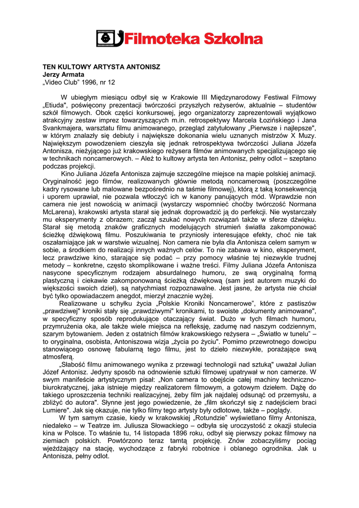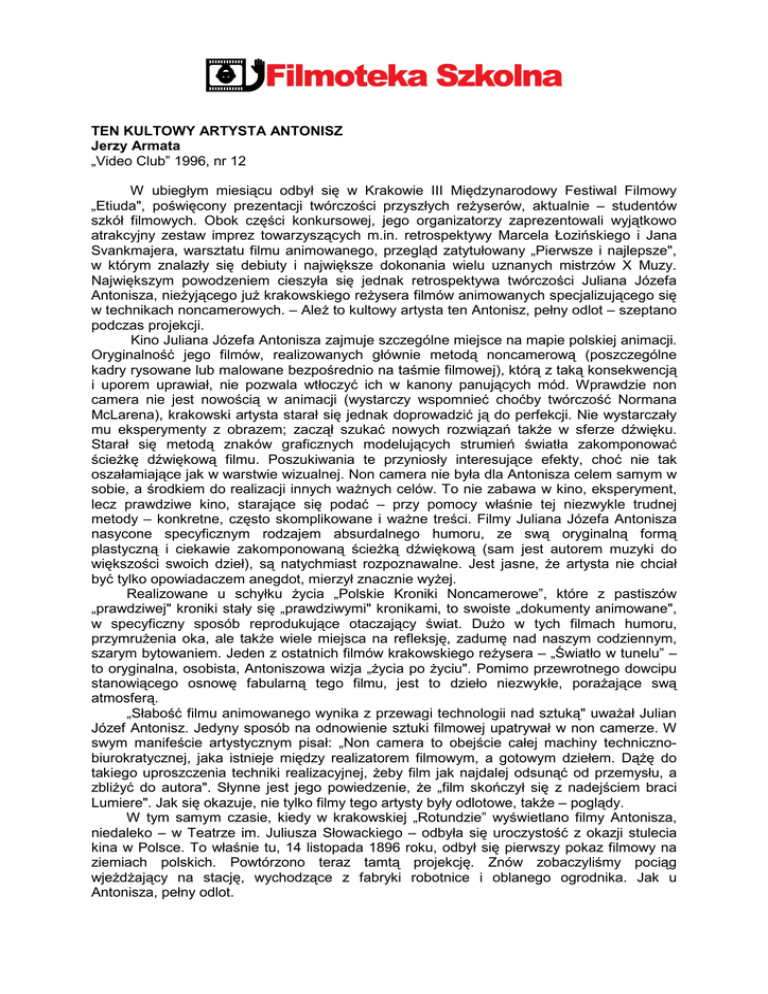 TEN KULTOWY ARTYSTA ANTONISZ Jerzy Armata „Video Club” 1996, nr 12 W ubiegłym miesiącu odbył się w Krakowie III Międzynarodowy Festiwal Filmowy „Etiuda", poświęcony prezentacji twórczości przyszłych reżyserów, aktualnie – studentów szkół filmowych. Obok części konkursowej, jego organizatorzy zaprezentowali wyjątkowo atrakcyjny zestaw imprez towarzyszących m.in. retrospektywy Marcela Łozińskiego i Jana Svankmajera, warsztatu filmu animowanego, przegląd zatytułowany „Pierwsze i najlepsze", w którym znalazły się debiuty i największe dokonania wielu uznanych mistrzów X Muzy. Największym powodzeniem cieszyła się jednak retrospektywa twórczości Juliana Józefa Antonisza, nieżyjącego już krakowskiego reżysera filmów animowanych specjalizującego się w technikach noncamerowych. – Ależ to kultowy artysta ten Antonisz, pełny odlot – szeptano podczas projekcji. Kino Juliana Józefa Antonisza zajmuje szczególne miejsce na mapie polskiej animacji. Oryginalność jego filmów, realizowanych głównie metodą noncamerową (poszczególne kadry rysowane lub malowane bezpośrednio na taśmie filmowej), którą z taką konsekwencją i uporem uprawiał, nie pozwala wtłoczyć ich w kanony panujących mód. Wprawdzie non camera nie jest nowością w animacji (wystarczy wspomnieć choćby twórczość Normana McLarena), krakowski artysta starał się jednak doprowadzić ją do perfekcji. Nie wystarczały mu eksperymenty z obrazem; zaczął szukać nowych rozwiązań także w sferze dźwięku. Starał się metodą znaków graficznych modelujących strumień światła zakomponować ścieżkę dźwiękową filmu. Poszukiwania te przyniosły interesujące efekty, choć nie tak oszałamiające jak w warstwie wizualnej. Non camera nie była dla Antonisza celem samym w sobie, a środkiem do realizacji innych ważnych celów. To nie zabawa w kino, eksperyment, lecz prawdziwe kino, starające się podać – przy pomocy właśnie tej niezwykle trudnej metody – konkretne, często skomplikowane i ważne treści. Filmy Juliana Józefa Antonisza nasycone specyficznym rodzajem absurdalnego humoru, ze swą oryginalną formą plastyczną i ciekawie zakomponowaną ścieżką dźwiękową (sam jest autorem muzyki do większości swoich dzieł), są natychmiast rozpoznawalne. Jest jasne, że artysta nie chciał być tylko opowiadaczem anegdot, mierzył znacznie wyżej. Realizowane u schyłku życia „Polskie Kroniki Noncamerowe”, które z pastiszów „prawdziwej" kroniki stały się „prawdziwymi" kronikami, to swoiste „dokumenty animowane", w specyficzny sposób reprodukujące otaczający świat. Dużo w tych filmach humoru, przymrużenia oka, ale także wiele miejsca na refleksję, zadumę nad naszym codziennym, szarym bytowaniem. Jeden z ostatnich filmów krakowskiego reżysera – „Światło w tunelu” – to oryginalna, osobista, Antoniszowa wizja „życia po życiu". Pomimo przewrotnego dowcipu stanowiącego osnowę fabularną tego filmu, jest to dzieło niezwykłe, porażające swą atmosferą. „Słabość filmu animowanego wynika z przewagi technologii nad sztuką" uważał Julian Józef Antonisz. Jedyny sposób na odnowienie sztuki filmowej upatrywał w non camerze. W swym manifeście artystycznym pisał: „Non camera to obejście całej machiny technicznobiurokratycznej, jaka istnieje między realizatorem filmowym, a gotowym dziełem. Dążę do takiego uproszczenia techniki realizacyjnej, żeby film jak najdalej odsunąć od przemysłu, a zbliżyć do autora". Słynne jest jego powiedzenie, że „film skończył się z nadejściem braci Lumiere". Jak się okazuje, nie tylko filmy tego artysty były odlotowe, także – poglądy. W tym samym czasie, kiedy w krakowskiej „Rotundzie” wyświetlano filmy Antonisza, niedaleko – w Teatrze im. Juliusza Słowackiego – odbyła się uroczystość z okazji stulecia kina w Polsce. To właśnie tu, 14 listopada 1896 roku, odbył się pierwszy pokaz filmowy na ziemiach polskich. Powtórzono teraz tamtą projekcję. Znów zobaczyliśmy pociąg wjeżdżający na stację, wychodzące z fabryki robotnice i oblanego ogrodnika. Jak u Antonisza, pełny odlot. Jerzy Armata