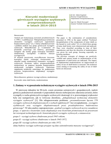 SZYBY I MASZYNY WYCIĄGOWE Kierunki modernizacji górniczych wyciągów szybowych przeprowadzonych w latach 2014-2015 Streszczenie: Artykuł jest kontynuacją rozważań przedstawionych w 1996 r. w publikacji pt. "Dekapitalizacja techniczna elementów wyciągów szybowych zagrożeniem bezpieczeństwa pracy" [1], w której scharakteryzowano i poddano analizie trzy grupy górniczych wyciągów szybowych. Sklasyfikowano je w zależności od przedziału czasowego ich budowy, prezentując następnie dla każdej grupy koncepcje kierunków modernizacji, szczególnie w zakresie maszyn wyciągowych. W artykule pozytywnie zweryfikowano ówczesne koncepcje zmian, wskazując równocześnie na aktualne trendy modernizacji elementów wyciągów szybowych. Oceniono wpływ przeprowadzonych modernizacji na poprawę poziomu bezpieczeństwa użytkowania wyciągów szybowych. Omówiono zagadnienia techniczne zmierzające do podniesienia poziomu bezpieczeństwa eksploatacji wyciągów szybowych. dr inż. Adam Zygmunt Wyższy Urząd Górniczy Departament Energomechaniczny mgr inż. Marek Szczygieł Instytut Techniki Górniczej KOMAG Abstract: The paper is the continuation of considerations presented in 1996 in the paper entitled "Technical decapitalisation of the components of mine shafts as the hazard to work safety" [1], in which three groups of mine shaft hoists were characterized and analysed. They were classified according to time of their manufacture and then the direction of modernization was given for each group, focusing especially on hoisting machines. The previous concepts of changes are positively verified and current trends in modernization of the components of shaft hoists are indicated. The impact of implemented modernizations on improvement of safety of use of shaft hoists is assessed. The technical issues aiming at increasing the safety of use of shaft hoists are discussed. Słowa kluczowe: górnicze wyciągi szybowe, modernizacje Keywords: mine shaft hoists, modernizations 1. Zmiany w wyposażeniu technicznym wyciągów szybowych w latach 1996-2015 W pierwszej dekadzie lat 90-tych, czasie przemian ustrojowych i gospodarczych, nadzór górniczy podsumował zaistniałe w poprzednim okresie niebezpieczne zdarzenia (awarie), które wystąpiły w ruchu górniczych wyciągów szybowych i dostrzegł, iż w przeważającej większości były one następstwem, jak to wówczas określono, „dekapitalizacji technicznej elementów wyciągów szybowych" [1]. Dla zdiagnozowania problemu „przeanalizowano łącznie 570 wyciągów szybowych eksploatowanych w szybach zgłębionych", bez uwzględnienia „wyciągów szybikowych oraz wyciągów eksploatowanych przez przedsiębiorstwa budownictwa górniczego". W toku analizy zaproponowano „podział wyciągów szybowych na trzy zasadnicze grupy, w oparciu o kryterium czasu eksploatacji oraz kryterium promowanych na przestrzeni lat rozwiązań technologicznych i konstrukcyjnych wyciągów szybowych, a mianowicie: grupa I - wyciągi szybowe zbudowane przed 1945 rokiem, grupa II - wyciągi szybowe zbudowane w latach 1945-1972, grupa III -wyciągi szybowe zbudowane po roku 1972, (datę budowy wyciągu szybowego przyjęto wg daty zainstalowania maszyny wyciągowej)". MASZYNY GÓRNICZE NR 1/2016 36 SZYBY I MASZYNY WYCIĄGOWE Dla uzmysłowienia ówczesnej skali problemu należy przypomnieć, że w 1996 r. oceniono, iż wyciągami szybowymi transportuje się rocznie około 200 milionów ton kopalin użytecznych, dobowo korzysta z nich około 200 tysięcy pracowników zatrudnionych w podziemiach kopalń. Łączna liczba wyciągów szybowych (w tym szybikowych) wynosiła 744. Maksymalna głębokość szybów osiągała (...) w Polsce 1250 m. Największa prędkość jazdy naczyń wyciągowych wynosiła 20 m/s, a maksymalna masa transportowana 30 Mg". W wyniku przeprowadzonej analizy poszczególnych grup wyciągów szybowych, ustalono liczbę wyciągów według stanu na koniec 1996 r. Autorzy ówczesnej publikacji "Dekapitalizacja techniczna elementów wyciągów szybowych zagrożeniem bezpieczeństwa pracy" stwierdzając „brak dokładnego rozeznania przebiegu eksploatacji systemów maszynowych transportu pionowego w całym okresie ich eksploatacji", zgłosili na podstawie własnych doświadczeń następujące sugestie [1]: 1. Grupa maszyn wyciągowych zbudowanych po 1972 r. w zasadzie nie wymaga modernizacji, a jedynie usunięcia ewentualnych błędów fabrycznych (np. błąd w układzie sterowania hamulców tarczowych z agregatem sterowniczo-pompowym firmy R. BOSCH). Jednak w przypadku maszyn intensywnie eksploatowanych, realizujących główne zadania wydobywcze i pracujących w wyciągach szybowych, dla których przewiduje się dalszą, długoletnią eksploatację, należy rozważyć, czy wszystkie podzespoły tych maszyn będą w stanie sprostać stawianym im zadaniom w okresie przewidywanej eksploatacji. Jeżeli w wyniku takiej analizy dojdzie się do wniosku, że określone elementy maszyny wyciągowej ulegną naturalnemu zużyciu przed terminem planowanej likwidacji wyciągu szybowego, to należy wybrać właściwą porę do ich wymiany, unikając sytuacji, w której zajdzie potrzeba wymiany kosztownych podzespołów na krótko przed likwidacją wyciągu. Przy okazji takiej wymiany celowym jest wprowadzenie nowoczesnych rozwiązań zapewniających poprawienie właściwości eksploatacyjnych z uwagi na możliwość diagnozowania poszczególnych elementów i szerokiej wizualizacji stanów ich pracy. 2. Maszyny wyciągowe zbudowane do 1945 r. w zasadzie należy wycofać z eksploatacji, zwłaszcza w tych przypadkach, w których zakłada się dalszą długoletnią eksploatację wyciągów szybowych. W przypadkach nieodległych terminów planowanych likwidacji wyciągów szybowych, ich maszyny wyciągowe powinny być poddawane wzmożonej kontroli technicznej. 3. Najbardziej predysponowane do modernizacji są maszyny wyciągowe grupy II budowane w latach sześćdzies