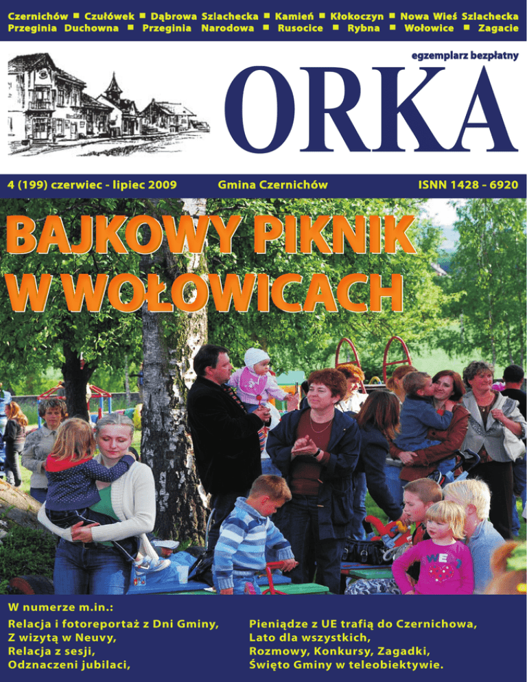 Czernichów Z Czułówek Z Dąbrowa Szlachecka Z Kamień Z Kłokoczyn Z Nowa Wieś Szlachecka Przeginia Duchowna Z Przeginia Narodowa Z Rusocice Z Rybna Z Wołowice Z Zagacie egzemplarz bezpłatny 4 (199) czerwiec - lipiec 2009 ORKA Gmina Czernichów W numerze m.in.: Relacja i fotoreportaż z Dni Gminy, Z wizytą w Neuvy, Relacja z sesji, Odznaczeni jubilaci, ISNN 1428 - 6920 Pieniądze z UE trafią do Czernichowa, Lato dla wszystkich, Rozmowy, Konkursy, Zagadki, Święto Gminy w teleobiektywie. REKLAMA m REKLAMA m REKLAMA m REKLAMA m REKLAMA m REKLAMA m REKLAM m REKLAMA MIEJSCE NA TWOJĄ REKLAMĘ CENNIK REKLAM W CZASOPIŚMIE ORKA W 2009 ROKU 1-2 kolory Wielokolorowe 1 strona 1/2 strony 1/4 strony 1/8 strony 1/16 strony 1/32 strony 300 zł 500 zł 160 zł 300 zł 85 zł 160 zł 50 zł 85 zł 30 zł 50 zł 20 zł 30 zł Ceny obejmują wykonanie składu komputerowego reklam i są cenami netto. RABATY: 1. Udziela się rabatu w wysokości 30% ceny, gdy reklamodawca jednorazowo zleca co najmniej trzykrotną edycję tej samej reklamy w ciągu roku. 2. Udziela się rabatu w wysokości 30% ceny, gdy reklamodawca dostarcza reklamę w wersji elektronicznej, w formacie nie wymagającym dodatkowej obróbki graficznej i składu komputerowego. Zainteresowanych prosimy o kontakt telefoniczny pod numerem podanym w stopce drukarskiej lub drogą mailową na adres: orka@czernichów.pl, można też zgłaszać się osobiście w tej sprawie do siedziby GCI w Urzędzie Gminy Czernichów. Szanowni Państwo! W reszcie lato. Dla jednych pora nicnierobienia, dla drugich ciężkiej pracy. Przy zaplanowanym od lat remoncie, w polu i w domu. Gdzieś między kolejnymi obowiązkami uciekają nam rzeczy ważne. Nie wiedzieć kiedy dorastają dzieci, rodzicom i nam przybywa zmarszczek i siwych włosów. Nieubłaganie mija czas. - To już 50 lat? – dziwi się pięknie siwiuteńka mieszkanka gminy tuląc się do swego męża. – Kiedy to zleciało? Po tylu latach kochamy się bardziej jak po ślubie. Ech, chciałoby się kiedyś tak powiedzieć. Tylko jak to zrobić? Może podpowiedzią służyć nam będą starsi mieszkańcy gminy. Ich opowieści o wspólnie przeżytych latach są naprawdę ciekawe. Szkoda tylko, że na co dzień brakuje nam czasu, by usiąść spokojnie i ich wysłuchać. Może w nawale codziennych obowiązków znajdziemy choć krótką chwilę. Zwłaszcza, że nie brak i takich w naszym życiu, które czekają na uwiecznienie. Razem z Wami chcemy się cieszyć z radosnych chwil w Waszym życiu. Dlatego też uruchamiamy stronę specjalnie dla Was. W „Orce” towarzyskiej napiszemy o Waszym ślubie, powitamy na świecie Wa- sze dzieci. Piszcie do nas, przynoście nam zdjęcia, informujcie o ważnych wydarzeniach. Chcemy też wspólnie z Wami utrwalić czas przeszły. Pora urlopu sprzyja porządkom. Może w Waszych domach zachowały się stare przepisy kulinarne? Ciast babci, którymi pachniał cały dom, pasztetów, ulubionych zup i wędzonych samodzielnie szynek? Nie wyrzucajmy ich. To nic, że brakuje nam czasu na przygotowanie według nich potraw. Stare przepisy kuchni czernichowskiej złożą się na wspaniałą książkę kucharską, którą wspólnie wydamy. W końcu mamy się czym pochwalić. A gotowanie wcale nie musi być z Pascalem czy Ewą Wachowicz. Równie dobrze w każdym zakątku Polski, i nie tylko, może odbywać się wspólnie z paniami z Kamienia, Rusocic czy Rybnej. Od Was zależy jak będziemy promować się w świecie. Zwłaszcza, że już w nim zaistnieliśmy. Z Neuvy wróciło właśnie 41 mieszkańców gminy. Znacie ich opowieści o muzeum złota i prywatnym pałacu? Nie? Zaglądnijcie więc czym prędzej do relacji z Francji i przeczytajcie co wydarzyło się w Neuvy. Z nadmiaru wolnego czasu cieszą się dzieci. Dopilnujmy, by nie siedziały przed telewizorem i komputerem. Tyle się przecież w naszej gminie dzieje. Były już dni gminy, koncerty i występy. W szkołach i stowarzyszeniach trwa lato na wsi. Wycieczki, zajęcia w plenerze i zabawy. Za miesiąc spływ kajakowy. Może warto zainteresować się tym co jest, a nie narzekać na forach, że w Czernichowie wieje nudą? Joanna Kostrz Wydawca: Rada Gminy Czernichów, 32-070 Czernichów 2 Rada programowa: Zdzisław Frąc, Andrzej Mach, Adam Wysoczyński Redaktor naczelny: Joanna Kostrz Redakcja: Urząd Gminy Czernichów, 32-070 Czernichów 2 tel. 012-270-26-09; tel. kom. 0501402389 e-mail: orka@czernichów.pl Skład: Marian Szczepaniak Druk: Master Druk Kraków; ul. Szara 26c tel. 012 657 90 09 e-mail: [email protected] Redakcja nie odpowiada za treść ogłoszeń i zastrzega sobie prawo do zmian i skrótów w nadesłanych tekstach. Artykułów niezamówionych nie zwracamy. ISSN 1428-6920 Nakład 1200 egz. Zdjęcie na okładce: Wiesław Piwowarczyk Urząd Gminy Czernichów W numerze lipcowym Orki przeczytacie Dyżur między innymi o tym jak: redakcyjny Przeżyć ze sobą 50 lat i cieszyć się każdą chwilą Dzieci z Czernichowa podbijały Kraków Radni tępili martwe dusze Wójt marzy o budżecie z plasteliny Spędzić lato w domu nie nudząc się Podglądać bezkarnie za unijne pieniądze Bawiliśmy się podczas Dni Gminy Mieszkańcy gminy odkrywali Francję Policjanci walczą ze złodziejami Trafić przez żołądek w świat Strażacy ćwiczą i rywalizują str. 6 i 7 str. 7 str. 8 str. 9 str. 11 str. 13 i 14 str. 15 do 18 str. 19 do 21 str. 24 str. 26 str. 28 i 29 Masz problem? Nie wiesz jak go rozwiązać? Potrzebujesz pomocy? W każdy poniedziałek, od godziny 14 do 16, w Gminnym Centrum Informacji trwa dziennikarski dyżur. Przyjdź, porozmawiaj. Może uda się nam pomóc? czerwiec - lipiec 2009 3 W naszej gminie Z Najlepsi w powiecie Piąte miejsce na liście grup wybranych przez Zarząd Województwa Małopolskiego i aż 185 punktów uzyskało Lokalna Grupa Działania – Blisko Krakowa, która skupia gminy Czernichów, Mogilany, Skawina i Świątniki Górne. Do zarządu województwa wpłynęły 42 wnioski z c