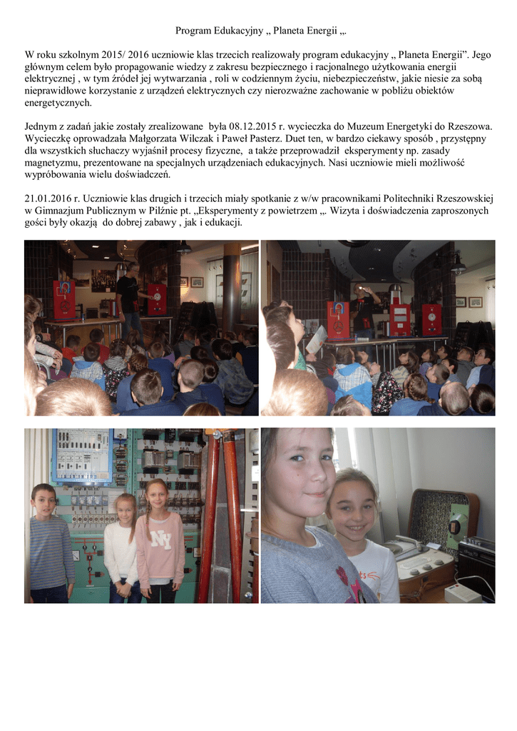 Program Edukacyjny „ Planeta Energii „. W roku szkolnym 2015/ 2016 uczniowie klas trzecich realizowały program edukacyjny „ Planeta Energii”. Jego głównym celem było propagowanie wiedzy z zakresu bezpiecznego i racjonalnego użytkowania energii elektrycznej , w tym źródeł jej wytwarzania , roli w codziennym życiu, niebezpieczeństw, jakie niesie za sobą nieprawidłowe korzystanie z urządzeń elektrycznych czy nierozważne zachowanie w pobliżu obiektów energetycznych. Jednym z zadań jakie zostały zrealizowane była 08.12.2015 r. wycieczka do Muzeum Energetyki do Rzeszowa. Wycieczkę oprowadzała Małgorzata Wilczak i Paweł Pasterz. Duet ten, w bardzo ciekawy sposób , przystępny dla wszystkich słuchaczy wyjaśnił procesy fizyczne, a także przeprowadził eksperymenty np. zasady magnetyzmu, prezentowane na specjalnych urządzeniach edukacyjnych. Nasi uczniowie mieli możliwość wypróbowania wielu doświadczeń. 21.01.2016 r. Uczniowie klas drugich i trzecich miały spotkanie z w/w pracownikami Politechniki Rzeszowskiej w Gimnazjum Publicznym w Pilźnie pt. „Eksperymenty z powietrzem „. Wizyta i doświadczenia zaproszonych gości były okazją do dobrej zabawy , jak i edukacji.