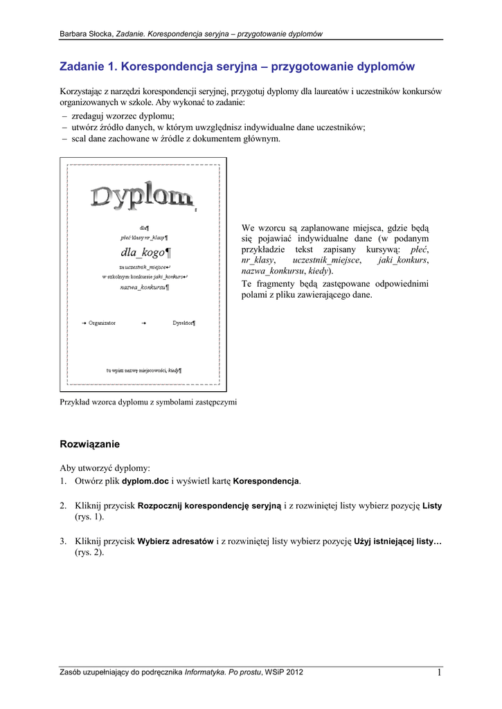 Barbara Słocka, Zadanie. Korespondencja seryjna – przygotowanie dyplomów Zadanie 1. Korespondencja seryjna – przygotowanie dyplomów Korzystając z narzędzi korespondencji seryjnej, przygotuj dyplomy dla laureatów i uczestników konkursów organizowanych w szkole. Aby wykonać to zadanie: zredaguj wzorzec dyplomu; utwórz źródło danych, w którym uwzględnisz indywidualne dane uczestników; scal dane zachowane w źródle z dokumentem głównym. We wzorcu są zaplanowane miejsca, gdzie będą się pojawiać indywidualne dane (w podanym przykładzie tekst zapisany kursywą: płeć, nr_klasy, uczestnik_miejsce, jaki_konkurs, nazwa_konkursu, kiedy). Te fragmenty będą zastępowane odpowiednimi polami z pliku zawierającego dane. Przykład wzorca dyplomu z symbolami zastępczymi Rozwiązanie Aby utworzyć dyplomy: 1. Otwórz plik dyplom.doc i wyświetl kartę Korespondencja. 2. Kliknij przycisk Rozpocznij korespondencję seryjną i z rozwiniętej listy wybierz pozycję Listy (rys. 1). 3. Kliknij przycisk Wybierz adresatów i z rozwiniętej listy wybierz pozycję Użyj istniejącej listy… (rys. 2). Zasób uzupełniający do podręcznika Informatyka. Po prostu, WSiP 2012 1 Barbara Słocka, Zadanie. Korespondencja seryjna – przygotowanie dyplomów Rysunek 1. Wybór typu dokumentu głównego Rysunek 2. Polecenie umożliwiające zlokalizowanie źródła danych 4. W oknie Wybieranie źródła danych zlokalizuj i otwórz plik dane_dyplom.doc zawierający dane do korespondencji seryjnej. 5. W dokumencie głównym kliknij miejsce, w które chcesz wstawić odpowiednie dane i naciśnij przycisk Wstaw pola koresp. ser. (rys. 3). Zastąp fragmenty pochylonego tekstu odpowiednio wybranymi polami (za każdym razem musisz ponownie kliknąć przycisk Wstawianie pól korespondencji seryjnej). Rysunek 3. Lista pól Wstaw pola korespondencji seryjnej Na liście przedstawionej na rys. 3 są widoczne wszystkie pola ze źródła danych, czyli nazwy kolumn z wiersza nagłówkowego tabeli zachowanej w pliku dane_dyplom.doc. 6. Do wprowadzenia słów „zajęcie” i „miejsca” użyj przycisku Reguły z grupy Wpisywanie i wstawianie pól, znajdującego się na karcie narzędzi Korespondencja. Z rozwiniętej listy wybierz pole Jeśli...to...inaczej..., które służy do wykonywania jednej lub dwóch alternatywnych akcji w zależności od spełnionego warunku (rys. 4, 5, 6). Zasób uzupełniający do podręcznika Informatyka. Po prostu, WSiP 2012 2 Barbara Słocka, Zadanie. Korespondencja seryjna – przygotowanie dyplomów Wstawianie do dokumentów odpowiedniego tekstu (dla „laureatów” lub „uczestników”) Rysunek 4. Lista pól Reguły Rysunek 5. Fragment dokumentu głównego prezentujący wstawione pola korespondencji seryjnej oraz tekst wprowadzany polem warunkowym Jeśli…to…inaczej… Tu wstaw spację Tu wstaw spację Rysunek 6. Zawartość okna dialogowego Wstawianie pola programu Word: Jeśli do definiowania dodatkowych pól, których zawartość zależy od kryterium wyboru 7. Przeformatuj wstawione pola. W dokumencie głównym zaznacz pole, łącznie z nawiasami ostrokątnymi (« »). Wprowadź zmiany stosownie do formy dokumentu (za pomocą poleceń Czcionka…, Akapit… w menu Format lub odpowiednich przycisków). 8. Wyniki scalania korespondencji seryjnej możesz przejrzeć przed ich wygenerowaniem. Na etapie podglądu wciąż istnieje możliwość dodawania i usuwania pól, a także zmiany wyglądu dokumentu. W narzędziach Korespondencja znajduje się kilka przycisków, które przydają się przy wyświetlaniu podglądu. Zasób uzupełniający do podręcznika Informatyka. Po prostu, WSiP 2012 3 Barbara Słocka, Zadanie. Korespondencja seryjna – przygotowanie dyplomów Rysunek 7. Grupa przycisków Podgląd wyników Kliknij przycisk Podgląd wyników, aby szybko przejrzeć pierwszy scalony dokument (rys. 7). Jeśli pierwszy dokument wygląda poprawnie, przejrzyj kilka dalszych scalonych dokumentów, używając przycisku Następny rekord . Rysunek 8. Fragment dyplomu – podgląd rekordów 9. Przeprowadź scalanie po wcześniejszym zapisaniu dokumentu głównego. Kliknij przycisk Zakończ i scal. Wybierz polecenie Edytuj poszczególne dokumenty… (rys. 9), który umożliwia utworzenie nowego dokumentu zbiorczego zawierającego wszystkie dokumenty, po jednym na stronę. W otwartym oknie dialogowym (rys. 10) wybierz wszystkie rekordy do scalenia. Rysunek 9. Lista poleceń Zakończ i scal Rysunek 10. Okno dialogowe Scalanie z nowym dokumentem prostego wybierania rekordów do scalenia Zbiór dokumentów wygenerowanych seryjnie zawiera tyle egzemplarzy, ile było wybranych rekordów do scalenia. Tworzony jest więc nowy dokument, który możesz zapisać w pamięci dyskowej. Przechowywanie takiego dokumentu nie jest konieczne, ponieważ do ponownego jego utworzenia potrzebujesz dokumentu głównego i skojarzonego z nim źródła z danymi. Dokumenty główny i źródłowy muszą pozostawać zawsze w tym samym położeniu względem siebie (najlepiej w tym samym folderze). Przeniesienie np. dokumentu źródłowego w inne miejsce na dysku lub zmiana jego nazwy spowoduje zniszczenie powiązań między plikami, psując działanie korespondencji seryjnej. Zasób uzupełniający do podręcznika Informatyka. Po prostu, WSiP 2012 4