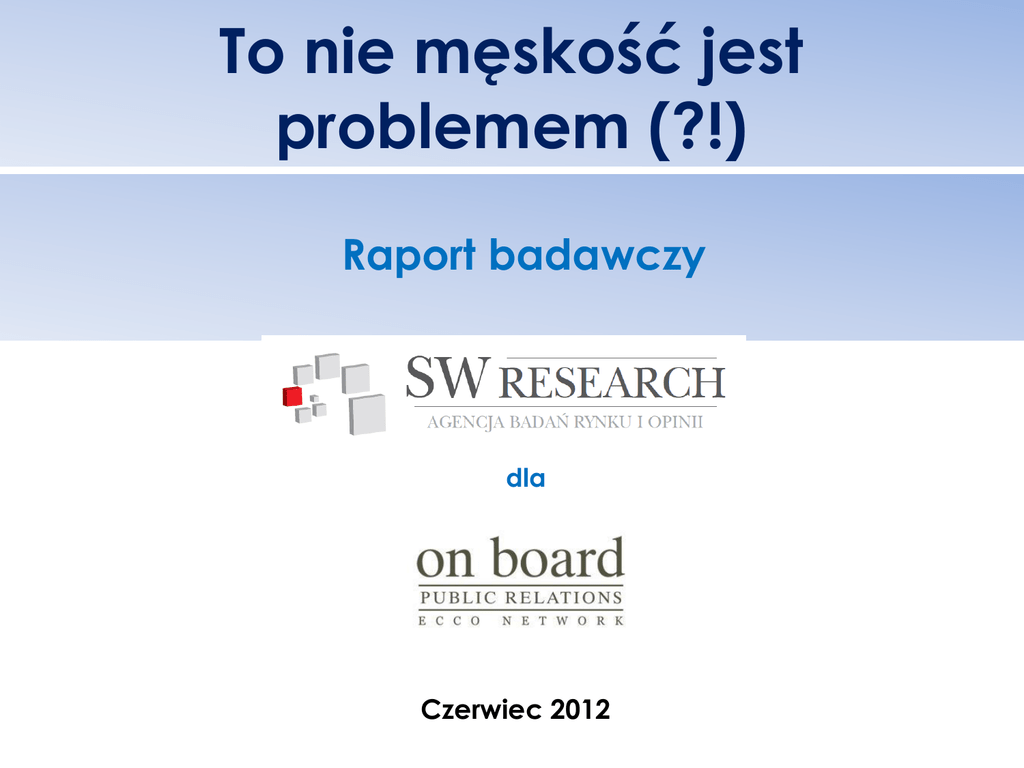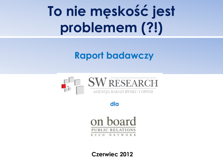 To nie męskość jest problemem (?!) Raport badawczy dla Czerwiec 2012 WPROWADZENIE To nie męskość jest problemem (?!)- raport Cele badania Głównym celem projektu była próba zbadania sfery niezwykle trudnej do badania w sposób tradycyjny (a co powiodło się za pomocą metody on-line) – problemów związanych z zaburzeniami seksualnymi u mężczyzn. Badanie dostarcza odpowiedzi na pytanie o definicję męskości i o różnice w jej formułowaniu przez kobiety i mężczyzn. Projekt jako jeden z pierwszych porusza tematykę reakcji mężczyzn i kobiet na wiadomość o zaburzeniach seksualnych. Zostały zbadane także: sfera oczekiwań i pierwsze kroki podejmowane w celu rozwiązania problemów. 3 To nie męskość jest problemem (?!)- raport Metodologia badania Badanie zostało zrealizowane w dniach 7-15 czerwca 2012 roku, metodą internetowych zestandaryzowanych wywiadów kwestionariuszowych (CAWI) przez agencję SW Research Próba badawcza miała charakter losowy. Badaniem objęto łącznie 1500 Internautów w wieku 16-49 lat. Operatem losowania był panel internetowy StudentsWatch.pl Próba badawcza jest reprezentatywna dla populacji polskich internautów w wieku 16-49 pod względem łącznego rozkładu płci i kategorii wiekowych Dopuszczalny błąd statystyczny w badaniu To nie męskość jest problemem (?!) nie przekracza 2,5 p.procentowego dla całej próby oraz 3,6 p.procentowego osobno dla populacji kobiet i mężczyzn. Kwestionariusz wywiadu składał się z 13 pytań badawczych (z czego 8 pytań zadano zarówno kobietom jak i mężczyznom) i został opracowany wspólnie przez agencje OnBoard PR i SW Research Badanie przeprowadzono na autorskim oprogramowaniu „3S” zintegrowanym z panelem internetowym StudentsWatch.pl 4 To nie męskość jest problemem (?!)- raport KOMENTARZ DO BADANIA Problem męskości jest czymś więcej niż tylko problemem związanym z zaburzeniami seksualnymi. To przede wszystkim problem komunikacji obu płci i często rozbieżnych oczekiwań. Ciekawe jednak, że problem nie istnieje na poziomie definicyjnym – kobiety uważają za męskie to, co zdaniem mężczyzn pobudza ich poczucie męskości. Problem polega jednak na tym, że albo deklaracje mężczyzn są jedynie deklaracjami zgodnymi z „poprawnością polityczną”, albo kobiety dostrzegają starania mężczyzn w sferach najbardziej powierzchownych. Albo zachodzi jedno i drugie. Inną kwestią jest problem zaburzeń seksualnych. Dla zdecydowanej większości mężczyzn ich wystąpienie powoduje drastyczny spadek poczucia własnej wartości. Co więcej, problem ten jest coraz trudniejszy do ukrycia – partnerki nie dają się zwieść ani fikcyjnym nadmiarem pracy ani zmęczeniem. A może jednak dają? W końcu częściej o zaistniałe problemy obwiniają siebie i swoją seksualność. Mężczyźni deklarują otwartość na rozmowę o swoich problemach ze swoimi partnerkami równie często jak ze specjalistami (urologami, seksuologami). Problem w tym, że kobiety o tym nie wiedzą lub sądzą, że mężczyźni nie mają wobec nich takich oczekiwań. Myślą, że mężczyźni woleliby ten temat przemilczeń lub przeczekać. Warto podkreślić tu istotną rolę społeczności internetowych – anonimowa konsultacja często poprzedza bezpośrednią rozmowę z partnerką lub lekarzem Rozwiązywanie problemów z zaburzeniami również budzi szereg pytań. Z jednej strony połowa mężczyzn deklaruje metodyczne podejście do problemu (konsultacje na forum internetowych, z lekarzem, z partnerką), z drugiej zaś podobny odsetek przypisuje pozostałym mężczyznom sięganie po specyfiki, afrodyzjaki lub materiały erotyczne i pornograficzne. 5 To nie męskość jest problemem (?!)- raport Struktura demograficzna próby Płeć 50,5 49,5 Kobieta Mężczyzna Grupa wiekowa 26,8 16-25 lat 43,6 29,6 26-35 lat 36-49 lat N = 1500 Dane w % 6 DEFINICJA MĘSKOŚCI To nie męskość jest problemem (?!)- raport DEFINICJA MĘSKOŚCI - WNIOSKI Zarówno mężczyźni, jak i kobiety są przekonani, że o „męskości” mężczyzn decyduje przede wszystkim sprawność seksualna (kobiety: 83,5 proc, mężczyźni 72,3 proc.). W parze z nią idzie sprawność fizyczna (71,4 proc. wśród mężczyzn i 66,3 proc. wśród kobiet). Kobiety zdecydowanie częściej są przekonane, że mężczyźni opierają poczucie męskości na wysokim statusie materialnym – uważa tak 66,0 proc. kobiet, wśród mężczyzn odsetek ten wynosi zaledwie 39,1 proc. Wartości materialne są jednak dla nich nie bez znaczenia, jeśli służą zapewnieniu stabilności materialnej i bezpieczeństwa. Te cechy sprzyjają poczuciu męskości dla 63,5 proc. mężczyzn. Z kolei mężczyźni są znacznie bardziej przekonani, że poczucie męskości jest wzmagane przez bycie opiekuńczym wobec kobiety i odnoszenie się do niej z szacunkiem. Co ciekawe, to właśnie: opiekuńczość, szacunek, stabilność materialna i bezpieczeństwo stanowią dla kobiet filary definicji męskości. Problem może polegać jednak na tym, że kobiety są przekonane, że mężczyźni budując swoje poczucie męskości „inwestują” bardziej w sferę seksualności, atrakcyjności fizycznej i budowania dobrej pozycji materialnej. 8 To nie męskość jest problemem (?!)- raport DEFINICJA MĘSKOŚCI (1) Co Pani(Pana) zdaniem sprawia, że mężczyźni czują się bardziej „męscy”? 83,5 72,3 77,9 66,3 71,4 68,9 Sprawność seksualna Sprawność fizyczna, wysportowanie Zapewnienie rodzinie stabilności materialnej i bezpieczeństwa 57,8 63,5 60,7 66,0 39,1 52,4 53,0 48,8 50,9 Wysoki status materialny (dobry samochód, mieszkanie) Spełnienie w sferze zawodowej 23,7 Opiekuńczość wobec kobiety 37,9 Odnoszenie się z szacunkiem do kobiet, bycie dżentelmenem 19,3 33,2 35,0 25,4 30,1 20,1 32,0 26,1 30,7 18,1 24,3 Dominacja w związku Realizacja zainteresowań/hobby Posiadanie wielu partnerek seksualnych w swoim życiu Coś innego Żadne z wymienionych 1,4 1,3 1,3 