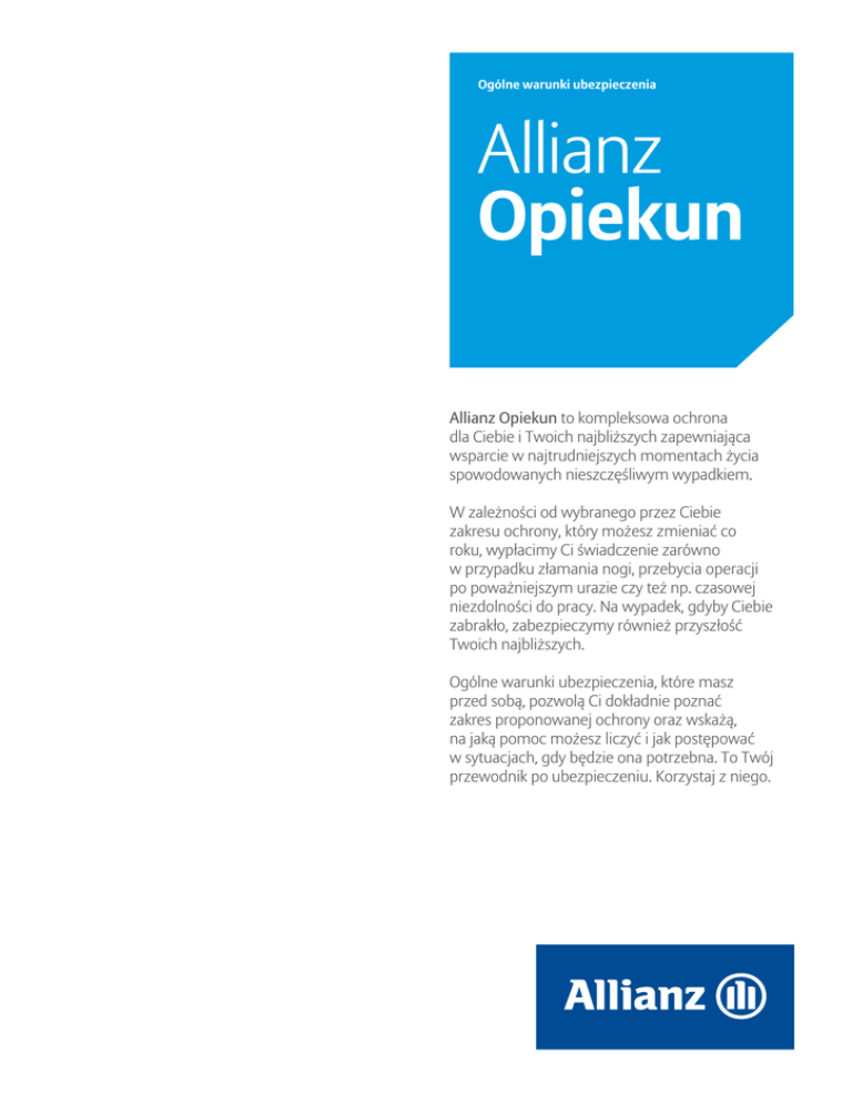 Ogólne warunki ubezpieczenia Allianz Opiekun Allianz Opiekun to kompleksowa ochrona dla Ciebie i Twoich najbliższych zapewniająca wsparcie w najtrudniejszych momentach życia spowodowanych nieszczęśliwym wypadkiem. W zależności od wybranego przez Ciebie zakresu ochrony, który możesz zmieniać co roku, wypłacimy Ci świadczenie zarówno w przypadku złamania nogi, przebycia operacji po poważniejszym urazie czy też np. czasowej niezdolności do pracy. Na wypadek, gdyby Ciebie zabrakło, zabezpieczymy również przyszłość Twoich najbliższych. Ogólne warunki ubezpieczenia, które masz przed sobą, pozwolą Ci dokładnie poznać zakres proponowanej ochrony oraz wskażą, na jaką pomoc możesz liczyć i jak postępować w sytuacjach, gdy będzie ona potrzebna. To Twój przewodnik po ubezpieczeniu. Korzystaj z niego. Spis treści Ogólne warunki ubezpieczenia Allianz Opiekun Część I. Podstawowe informacje o ubezpieczeniu, czyli kto i od czego może być ubezpieczony . . . . . . . . . . . . . . . . . . . . . . . . . . . . . . . 1 §1 Gdzie uregulowane są warunki umowy? . . . . . . . . . . . . . . . . . . . . . . . . . . . . . . . . . . . . . . . . . . . . . . . . . . . . . . . . . . . . . . . . . . . . . . . . . . . . . . . . . 1 §2 W jakim zakresie chroni ubezpieczenie Allianz Opiekun? . . . . . . . . . . . . . . . . . . . . . . . . . . . . . . . . . . . . . . . . . . . . . . . . . . . . . . . . . . . . . . . . . . 1 §3 Kiedy i jaką kwotę Allianz wypłaci w razie śmierci? . . . . . . . . . . . . . . . . . . . . . . . . . . . . . . . . . . . . . . . . . . . . . . . . . . . . . . . . . . . . . . . . . . . . . . . . 2 §4Kiedy i jaką kwotę Allianz wypłaci w razie trwałego i całkowitego inwalidztwa wskutek nieszczęśliwego wypadku oraz na jakiej podstawie stwierdzi jego wystąpienie? . . . . . . . . . . . . . . . . . . . . . . . . . . . . . . . . . . . . . . . . . . . . . . . . . . . . . . . . . . . . . . . . . . . . . . . . . . 2 §5Kiedy i jaką kwotę Allianz wypłaci w razie pobytu w szpitalu w następstwie nieszczęśliwego wypadku oraz od czego zależy wysokość tej kwoty? . . . . . . . . . . . . . . . . . . . . . . . . . . . . . . . . . . . . . . . . . . . . . . . . . . . . . . . . . . . . . . . . . . . . . . . . . . . . . . . . . . . . . . . . . . . . . . . . . . . 2 §6Kiedy i jaką kwotę Allianz wypłaci w razie trwałego uszczerbku na zdrowiu wskutek nieszczęśliwego wypadku oraz na jakiej podstawie stwierdzi jego wystąpienie? . . . . . . . . . . . . . . . . . . . . . . . . . . . . . . . . . . . . . . . . . . . . . . . . . . . . . . . . . . . . . . . . . . . . . . . . . . 3 § 7 Kiedy i jaką kwotę Allianz wypłaci w razie czasowej niezdolności do pracy wskutek nieszczęśliwego wypadku? . . . . . . . . . . . . . . . . . 3 § 8Kiedy i jaką kwotę Allianz wypłaci w razie leczenia operacyjnego wskutek nieszczęśliwego wypadku oraz od czego zależy wysokość tej kwoty? . . . . . . . . . . . . . . . . . . . . . . . . . . . . . . . . . . . . . . . . . . . . . . . . . . . . . . . . . . . . . . . . . . . . . . . . . . . . . . . . . . . . . . . . . . . . . . . . . . . 4 § 9Kiedy i jaką kwotę Allianz wypłaci w razie uszczerbku na zdrowiu Dziecka wskutek nieszczęśliwego wypadku lub operacji Dziecka wskutek nieszczęśliwego wypadku? . . . . . . . . . . . . . . . . . . . . . . . . . . . . . . . . . . . . . . . . . . . . . . . . . . . . . . . . . . . . . . . . . . . . . . . . . . . . . 4 § 10 W jakich przypadkach Allianz może odmówić wypłaty? . . . . . . . . . . . . . . . . . . . . . . . . . . . . . . . . . . . . . . . . . . . . . . . . . . . . . . . . . . . . . . . . . . . 4 Część II. Umowa ubezpieczenia, jak ją zawrzeć i rozwiązać . . . . . . . . . . . . . . . . . . . . . . . . . . . . . . . . . . . . . . . . . . . . . . . . . . . . . . . . . . . . . . . 5 § 11 Jak zawrzeć umowę? . . . . . . . . . . . . . . . . . . . . . . . . . . . . . . . . . . . . . . . . . . . . . . . . . . . . . . . . . . . . . . . . . . . . . . . . . . . . . . . . . . . . . . . . . . . . . . . . . . . 5 § 12 Kto może zostać objęty ubezpieczeniem? . . . . . . . . . . . . . . . . . . . . . . . . . . . . . . . . . . . . . . . . . . . . . . . . . . . . . . . . . . . . . . . . . . . . . . . . . . . . . . . . 6 § 13 Jak długo trwa ochrona? . . . . . . . . . . . . . . . . . . . . . . . . . . . . . . . . . . . . . . . . . . . . . . . . . . . . . . . . . . . . . . . . . . . . . . . . . . . . . . . . . . . . . . . . . . . . . . . . 6 § 14 Jakie są warunki rozwiązania umowy? . . . . . . . . . . . . . . . . . . . . . . . . . . . . . . . . . . . . . . . . . . . . . . . . . . . . . . . . . . . . . . . . . . . . . . . . . . . . . . . . . . . 6 § 15 Jakie są zasady zawarcia kolejnej umowy? . . . . . . . . . . . . . . . . . . . . . . . . . . . . . . . . . . . . . . . . . . . . . . . . . . . . . . . . . . . . . . . . . . . . . . . . . . . . . . . . 7 Część III. Składka i suma ubezpieczenia . . . . . . . . . . . . . . . . . . . . . . . . . . . . . . . . . . . . . . . . . . . . . . . . . . . . . . . . . . . . . . . . . . . . . . . . . . . . . . . . 7 § 16 Jakie są zasady opłacania składki? . . . . . . . . . . . . . . . . . . . . . . . . . . . . . . . . . . . . . . . . . . . . . . . . . . . . . . . . . . . . . . . . . . . . . . . . . . . . . . . . . . . . . . . 7 § 17 Jakie są konsekwencje nieopłacenia składki? . . . . . . . . . . . . . . . . . . . . . . . . . . . . . . . . . . . . . . . . . . . . . . . . . . . . . . . . . . . . . . . . . . . . . . . . . . . . . . 7 § 18 Suma ubezpieczenia . . . . . . . . . . . . . . . . . . . . . . . . . . . . . . . . . . . . . . . . . . . . . . . . . . . . . . . . . . . . . . . . . . . . . . . . . . . . . . . . . . . . . . . . . . . . . . . . . . . 7 Część IV. Postępowanie na wypadek zajścia zdarzenia ubezpieczeniowego . . . . . . . . . . . . . . . . . . . . . . . . . . . . . . . . . . . . . . . . . . . . . . . . 8 § 