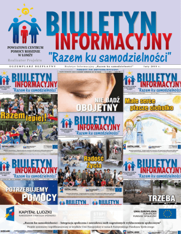 POWIATOWE CENTRUM POMOCY RODZINIE W ŁOMŻY Realizator Projektu BIULETYN INFORMACYJNY "Razem ku samodzielnosci" EGZEMPLARZ BEZPŁATNY KAPITAŁ LUDZKI Biuletyn Informacyjny „Razem ku samodzielności” luty 2015 r. UNIA EUROPEJSKA EUROPEJSKI FUNDUSZ SPOŁECZNY „Razem ku samodzielności – Integracja społeczna i zawodowa osób zagrożonych wykluczeniem społecznym” Projekt systemowy współfinansowany ze środków Unii Europejskiej w ramach Europejskiego Funduszu Społecznego BIULETYN INFORMACYJNY „Razem ku samodzielności” SPIS TREŚCI Słowo wstępne Elżbiety Parzych - Starosty Łomżyńskiego 3 Podsumowanie realizacji projektu „Razem ku samodzielności” 2008-2015 4 Ludzie Projektu - wywiady 17 Odejść czy zostać? / Dla kobiet doświadczających przemocy 19 Motywacje do podjęcia roli rodziny zastępczej 22 Podaruj dziecku serce 23 Łomżyński Park Krajobrazowy Doliny Narwi fot. Katarzyna Modzelewska 2 „Razem ku samodzielności” BIULETYN INFORMACYJNY Szanowni Państwo ! Kończymy już realizację projektu systemowego „Razem ku samodzielności – Integracja społeczna i zawodowa osób zagrożonych wykluczeniem społecznym” w powiecie łomżyńskim. W ramach Programu Operacyjnego Kapitał Ludzki od lipca 2008 roku do końca lutego 2015 roku objęto różnymi formami wsparcia 1151 osób z terenu naszego powiatu. Ogółem kwota wydatkowanych środków na ten cel z Europejskiego Funduszu Społecznego to niemal 6 milionów złotych. Cieszę się, że dzięki realizowanemu przez Powiatowe Centrum Pomocy Rodzinie w Łomży projektowi pn.”Razem ku samodzielności…” tak duża liczba osób znajdujących się w trudnym położeniu mogła skorzystać z wielu możliwości: kursów, szkoleń, staży, zajęć rehabilitacyjnych, poradnictwa specjalistycznego itp. Istotne jest także, że projekt był realizowany w szerokim partnerstwie, uwzględniającym samorządy gminne, placówki wsparcia dziennego prowadzone przez organizacje pozarządowe, Powiatowy Urząd Pracy w Łomży, co ułatwiało przygotowanie oferty umożliwiającej pełną integrację osób zagrożonych wykluczeniem ze społecznością lokalną . Pragnę podziękować wszystkim uczestnikom projektu za aktywność. Szczególnie dziękuję zespołowi pracowników Powiatowego Centrum Pomocy Rodzinie, który był bezpośrednim realizatorem projektu na przestrzeni 7 lat a także Urzędowi Marszałkowskiemu Województwa Podlaskiego bez którego wsparcia realizacja projektu byłaby niemożliwa. Pragnę zaznaczyć, że projekt ten cieszył się dużym zainteresowaniem mieszkańców naszego powiatu. Była to dobra inwestycja w człowieka. Elżbieta Parzych Starosta Łomżyński luty 2015r. Biuletyn Informacyjny 3 BIULETYN INFORMACYJNY „Razem ku samodzielności” Podsumowanie realizacji projektu „Razem ku samodzielności” KAPITAŁ LUDZKI 2008 – 2015 UNIA EUROPEJSKA EUROPEJSKI FUNDUSZ SPOŁECZNY Powiat łomżyński to obszar wiejski, mało uprzemysłowiony, gdzie jest niewiele możliwości podjęcia pracy przez osoby bezrobotne. Bezrobocie to wielka bieda. Godzi ona zwłaszcza w rodzinę. Godzi w godność człowieka. Powoduje frustrację , szczególnie u młodych. Walka z ubóstwem nie może być prowadzona bez udziału samych zainteresowanych. Pomoc im niesiona winna się opierać na zasadzie pomocniczości, a więc powinna to być pomoc dla samopomocy, tak by nie wyręczać, by nie odbierać inicjatywy, samodzielności, nie utrwalać bezradności i bierności, lecz aktywizować i wspomagać. Dlatego też w 2008 roku korzystając z możliwości jaką dały nam projekty systemowe zaczęliśmy realizować projekt „Razem ku samodzielności – Integracja społeczna i zawodowa osób zagrożonych wykluczeniem społecznym” współfinansowany ze środków Unii Europejskiej w ramach Europejskiego Funduszu Społecznego. Łącznie na przestrzenia lat 2008 – 2015 objęliśmy wsparciem 1151 osób Uczestnicy projektu „Razem ku samodzielności...” z podziałem na kategorie, wg których zakwalifikowani do projektu w latach 2008 - 2015 Dużo wysiłku włożyliśmy we wspieranie i dodawanie pewności siebie uczestnikom, którzy przychodzili do nas z wieloma problemami związanymi z sytuacją rodzinną, zawodową, różnymi obciążeniami. Projekt był dla nas wielkim wyzwaniem, gdyż nie mieliśmy wcześniej praktyki w pozyskiwaniu funduszy EFS. Dziś, po niemal ośmiu latach, widzimy, że nasze wysiłki mają sens. Prowadząc ewaluację z osobami, które zakończyły już udział w projekcie, mamy powody do zadowolenia. Spora grupa znalazła zatrudnienie, niektórzy założyli działalność gospodarczą. 1.1. CHARAKTERYSTYKA SPOŁECZNO-DEMOGRAFICZNA UCZESTNIKÓW PROJEKTU Grupę docelową projektu systemowego ”Razem ku samodzielności - integracja społeczna i zawodowa osób zagrożonych wykluczeniem społecznym” realizowanego przez PCPR w Łomży stanowiły osoby, które łącznie spełniły 3 warunki i były one: - mieszkańcami powiatu łomżyńskiego, - w wieku aktywności zawodowej, - korzystały ze środków pomocy społecznej. 6 W latach 2008 - 2015 zostało pozyskane ok. milionów zł. Dzięki temu z udziału w projekcie skorzystało 1151 uczestników projektu, którzy zostali zakwalifikowani do następujących kategorii: Po prawej rysunek 1: Struktura uczestników wg kategorii 4 luty 2015r. Wychowankowie rodzin zastępczych lub placówek opiekuńczo-wychowawczych Uczestnicy Warsztatów Terapii Zajęciowej w Marianowie i w Łomży Uczestnicy „Grupy Wsparcia” (opiekunowie dzieci niepełnosprawnych) Osoby niepełnosprawne Uczestnicy Ośrodka Wsparcia w Kownatach Osoby bezrobotne Osoby zagrożone wykluczeniem społecznym ze względu na wielodzietność / problemy wychowawcze Biuletyn Informacyjny „Razem ku samodzielności” BIULETYN INFORMACYJNY FOTO wspomnienia z realizacji projektu „Razem ku samodzielności” 2008-2015 [2009] Grupa Wsparcia w Balikach 11-13.09.2009 [2009] Konferencja 15.12.2