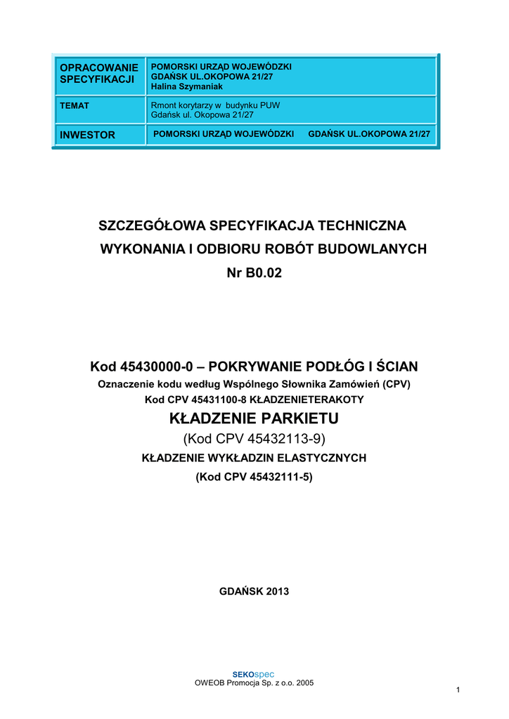 OPRACOWANIE SPECYFIKACJI POMORSKI URZĄD WOJEWÓDZKI GDAŃSK UL.OKOPOWA 21/27 Halina Szymaniak TEMAT Rmont korytarzy w budynku PUW Gdańsk ul. Okopowa 21/27 INWESTOR POMORSKI URZĄD WOJEWÓDZKI GDAŃSK UL.OKOPOWA 21/27 SZCZEGÓŁOWA SPECYFIKACJA TECHNICZNA WYKONANIA I ODBIORU ROBÓT BUDOWLANYCH Nr B0.02 Kod 45430000-0 – POKRYWANIE PODŁÓG I ŚCIAN Oznaczenie kodu według Wspólnego Słownika Zamówień (CPV) Kod CPV 45431100-8 KŁADZENIETERAKOTY KŁADZENIE PARKIETU (Kod CPV 45432113-9) KŁADZENIE WYKŁADZIN ELASTYCZNYCH (Kod CPV 45432111-5) GDAŃSK 2013 SEKOspec OWEOB Promocja Sp. z o.o. 2005 1 1. CZĘŚĆ OGÓLNA Przedmiotem niniejszej Szczególowej specyfikacji technicznej (SST) są wymagania dotyczące wykonania i odbioru robót posadzkowych z plytek;wykładziny elastycznej,parkietu przy użyciu kompozycji klejowych z mieszanek przygotowanych fabrycznie w budynku PUW na korytarzach I i IV p. oraz w pokojach biurowych przy ul .Okopowej 27 1.1. Zakres stosowania ST Szczególowa specyfikacja techniczna (SST) stosowana jest jako dokument przetargowy i kontraktowy przy zlecaniu i realizacji robót wymienionych w pkt. 1.1. Odstępstwa od wymagań podanych w niniejszej specyfikacji mogą mieć miejsce tylko w przypadkach prostych robót o niewielkim znaczeniu, dla których istnieje pewność, że podstawowe wymagania będą spelnione przy zastosowaniu metod wykonania wynikających z doświadczenia oraz uznanych regul i zasad sztuki budowlanej oraz przy uwzględnieniu przepisów bhp. 1.2. Przedmiot i zakres robót objętych ST Roboty, których dotyczy specyfikacja, obejmują wszystkie czynności mające na celu wykonanie: – pokrycie podlóg plytkami;wykładziną termozgrzewalną,ułożenie parkietu (posadzki), które stanowią wierzchni element warstw odlogowych, – wykonanie warstw wyrównujących − wykonanie cokolików − wykonanie pochwytów klatki schodowej Specyfikacja obejmuje wykonanie posadzek i okladzin przy użyciu kompozycji klejowych z mieszanek przygotowanych fabrycznie. Zakres opracowania obejmuje określenie wymagań odnośnie wlasności materialów, wymagań i sposobów oceny podloży, wykonanie posadzek i okladzin wewnętrznych i zewnętrznych z plytek, oraz ich odbiory. Specyfikacja nie obejmuje wykladzin i okladzin chemoodpornych oraz wykonywanych wedlug metod opatentowanych lub innych zaprojektowanych indywidualnie dla konkretnego obiektu. 1.3. Określenia podstawowe, definicje Określenia podane w niniejszej Specyfikacji są zgodne z odpowiednimi normami oraz określeniami podanymi w ST „Wymagania ogólne” Kod CPV 45000000-7, pkt 1.4, a także podanymi poniżej: Podloże – element budynku, na powierzchni którego wykonane będą roboty posadzkowe i okladzinowe z plytek. Warstwa wyrównawcza – warstwa wykonana w celu wyeliminowania nierówności lub różnic poziomów powierzchni podloża. Warstwa wygladzająca – cienka warstwa wykonana dla uzyskania gladkiej powierzchni podloża. Warstwa gruntująca – powloka wzmacniająca i uszczelniająca podloże oraz zwiększająca przyczepność powloki ochronnej. Faseta – wyoblenie wykonane na polączeniu powierzchni poziomych i pionowych. 1.4. Ogólne wymagania dotyczące robót posadzkowych i okladzinowych Wykonawca robót jest odpowiedzialny za jakość ich wykonania oraz za zgodność z dokumentacją projektową, specyfikacjami technicznymi i poleceniami Inspektora nadzoru. Ogólne powszechnie stosowane wymagania dotyczące robót podano w ST „Wymagania ogólne” Kod CPV 45000000-7, pkt. 1.5. 2. WYMAGANIA DOTYCZĄCE WLAŚCIWOŚCI MATERIALÓW 2.1. Ogólne wymagania dotyczące wlaściwości materialów, ich pozyskiwania i skladowania podano w ST „Wymagania ogólne” Kod CPV 45000000-7, pkt 2 Wykonawca obowiązany jest posiadać na budowie pelną dokumentację dotyczącą skladanych na budowie materialów przeznaczonych do wykonania robót posadzkowych i okladzinowych. 2.2. Rodzaje materialów Wszystkie materialy do wykonania robót posadzkowych i okladzinowych z plytek powinny odpowiadać wymaganiom zawartym w dokumentach odniesienia (normach, aprobatach technicznych). 2.2.1.Plyty i plytki Plytki powinny odpowiadać następującej normie: – PN-EN 14411:2005 – Plytki i plyty ceramiczne – Definicja, klasyfikacja, charakterystyki i SEKOspec OWEOB Promocja Sp. z o.o. 2005 2 znakowanie. wymagania do plytek gresowych na korytarzach - kolor do uzgodnienia z Inwestorem - klasa ścieralności 5 - klasa antypoślizgowości R10-11 na pochyłe uzupełnienia pięter plytki z rowkami antypoślizgowymi - nasiąkliwość wodna % EŁ 0,5 -wytrzymalośc mna zginanie MPa min 35 - odporność na pęknięcia wloskowate -odporność na dzialanie środków czyszczących min. GB -odporność na plamienie min.klasa 3 2.2.2.Kompozycje klejące i zaprawy Kompozycje klejące do mocowania plytek muszą spelniać wymagania normy PN-EN 12004:2002 lub odpowiednich aprobat technicznych. Zaprawy do spoinowania muszą spelniać wymagania odpowiednich aprobat technicznych lub norm. 2.2.3.Materialy pomocnicze Materialy pomocnicze do wykonywania posadzek i okladzin z plytek to: – listwy dylatacyjne i wykończeniowe, – środki ochrony plytek i spoin, – środki do usuwania zanieczyszczeń, – środki do konserwacji posadzek i okladzin. Wszystkie ww. materialy muszą mieć wlasności techniczne określone przez producenta lub odpowiednie aprobaty techniczne. 2.2.3.Woda Do przygotowania kompozycji klejących zapraw klejowych i mas do spoinowania stosować należy wodę odpowiadającą wymaganiom normy PN-EN 1008:2004 „Woda zarobowa do betonu. Specyfikacja pobierania próbek, badania i ocena przydatności wody zarobowej, do betonu, w tym wody odzyskanej z procesów produkcji betonu”. Bez badań laboratoryjnych może być stosowana wodociągowa woda pitna. 2.2.4. Wykładziny elastyczne Wykładziny elastyczne powinny spełniać normę EN 649;685 Grubość warstwy użytkowej EN429- 2,0 m, grubość całkowita EN 428- 2mm,ognioodpo