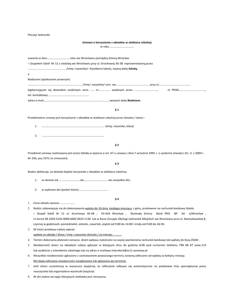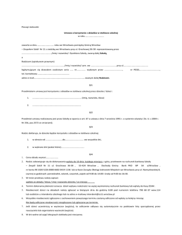 Pieczęć Jednostki Umowa o korzystanie z obiadów w stołówce szkolnej w roku …………………………… zawarta w dniu ……………………….. roku we Wrocławiu pomiędzy Gminą Wrocław – Zespołem Szkół Nr 11 z siedzibą we Wrocławiu przy ul. Grochowej 36-38 reprezentowaną przez ……………………………………………../imię i nazwisko/- Dyrektora Szkoły, zwaną dalej Szkołą, a Rodzicem (opiekunem prawnym) …………………………………………………………………./imię i nazwisko/ zam. we ……………………………………….przy ul…………………………………….. legitymującym się dowodem osobistym seria …… nr……………. wydanym przez ………………………….., nr PESEL………………………………, tel. kontaktowy ……………………………………………….. adres e-mail……………………………………………………………………………… zwanym dalej Rodzicem. §1 Przedmiotem umowy jest korzystanie z obiadów w stołówce szkolnej przez dziecko / dzieci : 1. …………………………………………………………………………… (imię, nazwisko, klasa) 2. ………………………………………………………………………….. §2 Przedmiot umowy realizowany jest przez Szkołę w oparciu o art. 67 a ustawy z dnia 7 września 1991 r. o systemie oświaty ( Dz. U. z 2004 r. Nr 256, poz.2572 ze zmianami). §3 Rodzic deklaruje, że dziecko będzie korzystało z obiadów w stołówce szkolnej: 1. w okresie od …………………………do…………………………… we wszystkie dni, 2. w wybrane dni (podać które)………………………………….. §4 1. Cena obiadu wynosi…………………. 2. Rodzic zobowiązuje się do dokonywania wpłaty do 10 dnia każdego miesiąca, z góry, przelewem na rachunek bankowy Szkoły – Zespół Szkół Nr 11 ul. Grochowa 36-38 , 53-424 Wrocław , Dochody Gminy Bank PKO BP SA o/Wrocław , nr konta 98 1020 5226 0000 6602 0419 1136 lub w Kasie Zarządu Obsługi Jednostek Miejskich we Wrocławiu przy ul. Namysłowskiej 8, czynnej w godzinach: poniedziałek, wtorek, czwartek, piątek od 9:00 do 14:00 i środy od 9:00 do 16:30. 3. W treści przelewu należy wpisać: wpłata za obiady / klasa / imię i nazwisko dziecka / za miesiąc…………. 4. 5. Termin dokonania płatności oznacza dzień wpływu należności na wyżej wymieniony rachunek bankowy lub wpłaty do Kasy ZOJM . Nieobecność dzieci na obiadach należy zgłaszać w bieżącym dniu do godziny 8.00 pod numerem telefonu 798 68 87 wew.114 lub osobiście u intendenta szkolnego lub na adres e-mailowy [email protected] 6. Wszystkie nieobecności zgłoszone z zachowaniem powyższego terminu zostaną odliczone od wpłaty za kolejny miesiąc. Nie będą odliczane nieobecności niezgłoszone lub zgłoszone po terminie. 7. Jeśli dzieci uczestniczą w wycieczce (wyjściu), to odliczenie odbywa się automatycznie na podstawie listy sporządzonej przez nauczyciela lub organizatora wycieczki (wyjścia). 8. W dni wolne od zajęć lekcyjnych stołówka jest nieczynna. 9. Comiesięczna informacja o wysokości należnej opłaty będzie zamieszczana na stronie internetowej szkoły w zakładce –stołówka, w punktach informacyjnych w szkole: w holu i przy stołówce. Informację można uzyskać również pod numerem telefonu 798 68 87 wew. 114. Rodzice dzieci, które mają w danym miesiącu odpisy finansowe z powodu odwołanych obiadów, będą indywidualnie informowani o wysokości opłaty za posiłki . Rodzice otrzymają informację za pośrednictwem poczty elektronicznej, na adres e-mail podany przez Rodzica w terminie do 5 dnia następnego miesiąca lub telefonicznie. 10. Po zakończeniu umowy o korzystanie z obiadów w stołówce szkolnej, ewentualne nadpłaty Szkoła przekaże na poniżej podany rachunek bankowy Rodzica ……………………………………………………………………………………………………………………………………………………….. §5 1. W razie zwłoki w uregulowaniu comiesięcznej opłaty Szkoła może rozwiązać umowę bez zachowania terminu wypowiedzenia, po uprzednim pisemnym wezwaniu Rodzica do zapłaty, z określeniem siedmiodniowego terminu płatności zaległej należności. 2. Brak wpłaty należności o której mowa w ust. 1 spowoduje wszczęcie postępowania windykacyjnego. §6 Rodzic zobowiązuje się zapoznać z Regulaminem korzystania z usług stołówki szkolnej. §7 Rodzic wyraża zgodę na przetwarzanie danych osobowych w niniejszej umowie przez Zarząd Obsługi Jednostek Miejskich w zakresie niezbędnym do realizacji niniejszej umowy. zawartych §8 1. Strony mogą rozwiązać umowę w każdym czasie, w trybie porozumienia stron. 2. Rezygnacja z obiadów lub zmiana terminów korzystania z obiadów wymaga formy pisemnej. Informację o poniższej treści należy zgłosić u Intendentki szkolnej lub w sekretariacie szkoły do 25 dnia miesiąca, w którym uczeń korzysta z obiadów: REZYGNACJA Ja, ……………………………………………. oświadczam, że moje dziecko………………………………………………. uczeń klasy……………………. nie będzie korzystało z obiadów w Szkole………………………… od miesiąca……………………. Podpis Rodzica §9 Wszelkie zmiany niniejszej umowy dla swej ważności wymagają formy pisemnego aneksu. § 10 W sprawach nieuregulowanych niniejszą umową mają zastosowanie przepisy Kodeksu cywilnego. § 11 Umowę sporządzono w dwóch jednobrzmiących egzemplarzach, po jednym dla każdej ze stron. podpis Rodzica podpis Dyrektora Szkoły