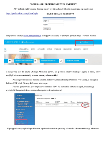 POBIERANIE ELEKTRONICZNEJ FAKTURY Aby pobrać elektroniczną fakturę należy wejść na Panel Klienta znajdujący się na stronie: https://perfecteline.com.pl/boa/login lub poprzez stronę: www.perfecteline.pl klikając w zakładkę w prawym górnym rogu → Panel Klienta i zalogować się do Biura Obsługi Abonenta (BOA) za pomocą indywidulanego loginu i hasła, które znajdą Państwo na ostatniej stronie umowy abonenckiej. Po zalogowaniu się do Panelu Klienta, należy wybrać zakładkę: Płatności >>Faktury, a następnie Pobierz PDF obok faktury, która nas interesuje. Faktura generowana jest do pliku w formacie PDF. Po zapisaniu faktury na dysk, możemy ją wyświetlić bezpośrednio na naszym komputerze i wydrukować. W przypadku wystąpienia problemów z pobraniem faktur prosimy o kontakt z Biurem Obsługi Abonenta.