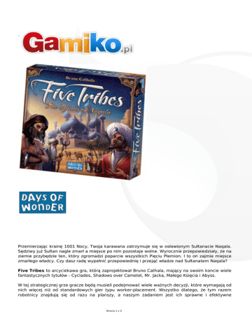 Przemierzając krainę 1001 Nocy, Twoja karawana zatrzymuje się w osławionym Sułtanacie Naqala. Sędziwy już Sułtan nagle zmarł a miejsce po nim pozostaje wolne. Wyrocznie przepowiedziały, że na ziemie przybędzie ten, który zgromadzi poparcie wszystkich Pięciu Plemion. I to on zajmie miejsce zmarłego władcy. Czy dasz radę wypełnić przepowiednię i przejąć władze nad Sułtanatem Naqala? Five Tribes to arcyciekawa gra, którą zaprojektował Bruno Cathala, mający na swoim koncie wiele fantastycznych tytułów - Cyclades, Shadows over Camelot, Mr. Jacka, Małego Księcia i Abyss. W tej strategicznej grze gracze będą musieli podejmować wiele ważnych decyzji, które wymagają od nich więcej niż od standardowych gier typu worker-placement. Wszystko dlatego, że tym razem robotnicy znajdują się od razu na planszy, a naszym zadaniem jest ich sprawne i efektywne Strona 1 z 3 przemieszczanie. Oazy, wioski, targowiska i wiele, wiele różnorodnych miejsc tylko czeka, aż przybędą do nich nowi pracownicy. A to jak, kiedy i gdzie ich przeniesiesz wpływa bezpośrednio na to, czy wygrasz czy raczej poniesiesz klęskę. W swojej zwycięskiej strategii powinny znaleźć się też potężne magiczne istoty - Dżiny. Jeżeli ich nie wykorzystasz, to przeciwnicy mogą użyć ich potężnych mocy i doprowadzić do Twojej zguby. Zawsze miej ich na oku, jeżeli rzeczywiście liczysz na przejęcie Sułtanatu. Five Tribes została wyprodukowana przez wydawnictwo Days of Wonder, stąd też możemy być pewni wysokiej jakości komponentów, jasnej i przejrzystej instrukcji oraz gry, która daje wiele możliwości zwycięstwa. Przemieszczanie pionków nie tylko wpływa na to, czy Ty otrzymasz punkty, ale także zmienia ustawienie planszy dla przeciwników. Często trzeba zastanowić się nad tym, czy warto zrobić coś dla siebie, czy tym razem zrobić coś przeciw innym. Zawartość pudełka: Worek drewnianych pionków (16 żółtych, 18 czerwonych, 18 niebieskich, 18 zielonych i 20 białych) 96 monet zwycięstwa 54 karty surowców 30 kafelków Sultanatu Naqala 22 karty Dżina 12 palm 10 pałaców 5 kart kolejności w turze 2 zestawy znaczników (11 wielbłądów i 2 znaczniki tur) 2 zestawy zniaczników (8 wielbłądów i 1 znacznik tury) 1 instrukcja 1 tor punktacji 1 znacznik licytacji 1 znacznik kolejności w turze Wiek od 13 lat Liczba graczy 2-4 Czas gry ok. 40 - 80 minut Strona 2 z 3 Instrukcja polska Wydanie angielskie Producent Days of Wonder Projektant Bruno Cathala Strona 3 z 3