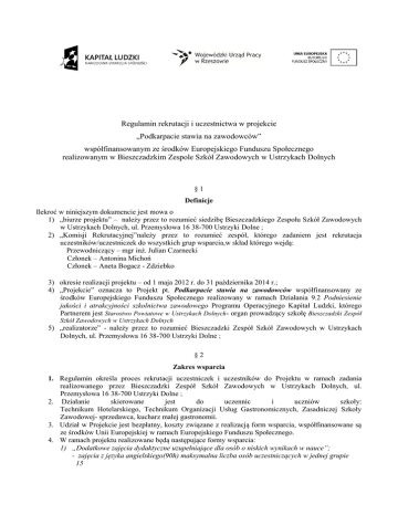 Regulamin rekrutacji i uczestnictwa w projekcie „Podkarpacie stawia na zawodowców” współfinansowanym ze środków Europejskiego Funduszu Społecznego realizowanym w Bieszczadzkim Zespole Szkół Zawodowych w Ustrzykach Dolnych §1 Definicje Ilekroć w niniejszym dokumencie jest mowa o 1) „biurze projektu” – należy przez to rozumieć siedzibę Bieszczadzkiego Zespołu Szkół Zawodowych w Ustrzykach Dolnych, ul. Przemysłowa 16 38-700 Ustrzyki Dolne ; 2) „Komisji Rekrutacyjnej”należy przez to rozumieć zespół, którego zadaniem jest rekrutacja uczestników/uczestniczek do wszystkich grup wsparcia,w skład którego wejdą: Przewodniczący – mgr inż. Julian Czarnecki Członek – Antonina Michoń Członek – Aneta Bogacz - Zdziebko 3) okresie realizacji projektu – od 1 maja 2012 r. do 31 października 2014 r.; 4) „Projekcie” oznacza to Projekt pt. Podkarpacie stawia na zawodowców współfinansowany ze środków Europejskiego Funduszu Społecznego realizowany w ramach Działania 9.2 Podniesienie jakości i atrakcyjności szkolnictwa zawodowego Programu Operacyjnego Kapitał Ludzki, którego Partnerem jest Starostwo Powiatowe w Ustrzykach Dolnych- organ prowadzący szkołę Bieszczadzki Zespół Szkół Zawodowych w Ustrzykach Dolnych 5) „realizatorze” - należy przez to rozumieć Bieszczadzki Zespół Szkół Zawodowych w Ustrzykach Dolnych, ul. Przemysłowa 16 38-700 Ustrzyki Dolne ; §2 Zakres wsparcia 1. Regulamin określa proces rekrutacji uczestniczek i uczestników do Projektu w ramach zadania realizowanego przez Bieszczadzki Zespół Szkół Zawodowych w Ustrzykach Dolnych, ul. Przemysłowa 16 38-700 Ustrzyki Dolne ; 2. Działanie skierowane jest do uczennic i uczniów szkoły: Technikum Hotelarskiego, Technikum Organizacji Usług Gastronomicznych, Zasadniczej Szkoły Zawodowej- sprzedawca, kucharz małej gastronomii. 3. Udział w Projekcie jest bezpłatny, koszty związane z realizacją form wsparcia, współfinansowane są ze środków Unii Europejskiej w ramach Europejskiego Funduszu Społecznego. 4. W ramach projektu realizowane będą następujące formy wsparcia: 1) „Dodatkowe zajęcia dydaktyczne uzupełniające dla osób o niskich wynikach w nauce”; - zajęcia z języka angielskiego(90h) maksymalna liczba osób uczestniczących w jednej grupie 15 2) „Zajęcia pozalekcyjne dydaktyczno-doskonalące: a) zajęcia z języka angielskiego(80h) maksymalna liczba osób uczestniczących w jednej grupie: 15 b) zajęcia z języka niemieckiego(90h) maksymalna liczba osób uczestniczących w jednej grupie: 15 c) zajęcia z języka niemieckiego(90h) maksymalna liczba osób uczestniczących w jednej grupie: 15 d) zajęcia z organizacji pracy w hotelarstwie (68h) maksymalna liczba osób uczestniczących w jednej grupie: 15 e) zajęcia z obsługi informatycznej w hotelarstwie i podstaw psychologii (30h) maksymalna liczba osób uczestniczących w jednej grupie: 15 f) zajęcia z przedsiębiorczości (10h) maksymalna liczba osób uczestniczących w jednej grupie:15 g) zajęcia z gastronomii (100h) maksymalna liczba osób uczestniczących w jednej grupie:15 3) „Staże i praktyki u pracodawców” 4) ,,Szkolenia dla nauczycieli” 5) ,,Warsztaty dla rodziców” 5. Formy wsparcia, o których mowa w ust. 4 będą się odbywać na podstawie szczegółowego harmonogramu umieszczonego na tablicy ogłoszeń oraz na stronie internetowej szkoły. 6. Realizator zastrzega sobie w uzasadnionych przypadkach prawo do zmiany ustalonego harmonogramu. §3 Uczestniczki i uczestnicy projektu 1. W projekcie uczestniczyć mogą uczennice i uczniowie Bieszczadzkiego Zespołu Szkół Zawodowych w Ustrzykach Dolnych prowadzonego przez Starostwo Powiatowe w Ustrzykach Dolnych, którzy złożyli formularz zgłoszeniowy wraz z wymaganymi załącznikami i zostaną zakwalifikowani do udziału w projekcie przez Komisję Rekrutacyjną. 2. Uczestniczki i uczestnicy projektu zostaną wybrane/-ni na podstawie złożonych formularzy zgłoszeniowych. 3. Przy wyborze uczestniczek i uczestników projektu Komisja Rekrutacyjna kierować będzie się, oprócz wymogów określonych w ust.1, następującymi preferencjami dla poszczególnych działań: I. zajęcia uzupełniające dla osób o niskich wynikach w nauce: 1) uczniowie i uczennice uzyskujące słabe wyniki z języka angielskiego zajęcia pozalekcyjne ukierunkowane na rozwijanie kompetencji kluczowych 1) osoby wykazujące zainteresowanie przedmiotami zawodowymi 2) osoby, które zadeklarowały chęć przystąpienia do egzaminu zawodowego 3) osoby, które aktywnie uczestniczyły w praktykach i stażach w ramach projektu III. zajęcia grupowe i/lub konsultacje indywidualne z doradcą zawodowym 1) wszystkie uczennice i uczniowie szkoły; 2) pierwszeństwo mają uczniowie/uczennice klas maturalnych / ostatnich klas Zasadniczej Szkoły Zawodowej IV. praktyki 1) wszyscy chętni uczniowie V. Staże 1) osoby, które uzyskały promocję do klasy programowo wyższej kryterium dodatkowe: osoby, które zadeklarowały chęć przystąpienia do egzaminu zawodowego 2) osoby, które mają maksymalnie jeden egzamin poprawkowy II. Uczennice i uczniowie mają prawo do udziału w więcej niż trzech rodzajach zajęć (z zastrzeżeniem braku możliwości dwukrotnego udziału w takich samych zajęciach, dopuszcza się mozliwość udziału w stażu i praktykach u pracodawcy w kolejnych latach trwania wyżej wymienionego projektu pod warunkiem iż program stażu/praktyki będzie inny niż w poprzedniej edycji). Ponadto każda osoba bierze udział w minimum trzech rodzajach zajęć. VI. Szkolenia i warsztaty 1. wszyscy chętni 4. Osoby, które z powodu braku miejsc nie zostały zakwalifikowane do udziału w zajęciach, zostają umieszczone na liście rezerwowej. W razie skreślenia uczestnika / uczestniczki z listy, na jego miejsce zostaje zakwalifikowany/-na kolejny/-na w rankingu uczeń/ uczennica z listy rezerwowej. 5. O kolejności na liście rankingowej rozst