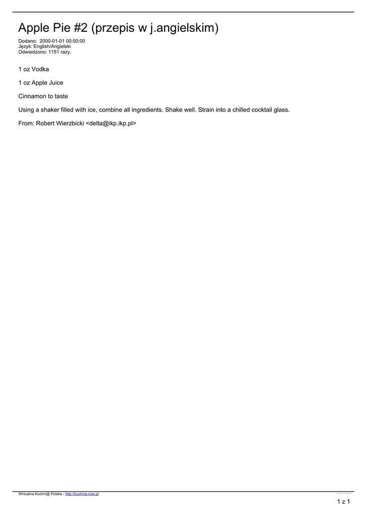 Apple Pie #2 (przepis w j.angielskim) Dodano: 2000-01-01 00:00:00 Język: English/Angielski Odwiedzono: 1151 razy. 1 oz Vodka 1 oz Apple Juice Cinnamon to taste Using a shaker filled with ice, combine all ingredients. Shake well. Strain into a chilled cocktail glass. From: Robert Wierzbicki <[email protected]> Wirtualna Kuchni@ Polska - http://kuchnia.now.pl przepis nr 3710, plik wygenerowano 2017.03.04 00:37 1z1