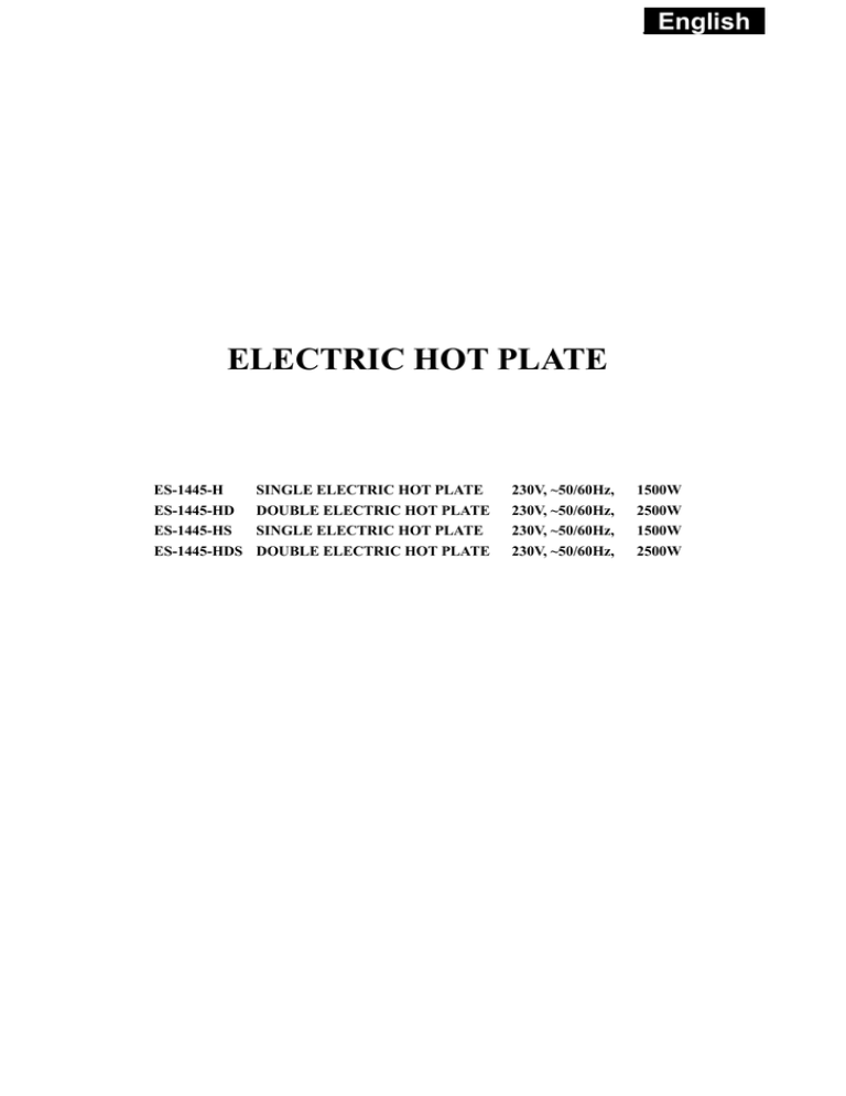 _English_ ELECTRIC HOT PLATE ES-1445-H ES-1445-HD ES-1445-HS ES-1445-HDS SINGLE ELECTRIC HOT PLATE DOUBLE ELECTRIC HOT PLATE SINGLE ELECTRIC HOT PLATE DOUBLE ELECTRIC HOT PLATE 230V, ~50/60Hz, 230V, ~50/60Hz, 230V, ~50/60Hz, 230V, ~50/60Hz, 1500W 2500W 1500W 2500W _English_ DO READ THESE INSTRUCTIONS BEFORE USING YOUR COOKING PLATE AND KEEP THEM FOR FUTURE REFERENCE, ALWAYS FOLLOW THEM CAREFULLY. 1. PREPARATION FOR USE First check that the voltage marked on the product corresponds with your supply voltage. 2. HOW TO USE • Select a suitable position close to an electric socket. • Having suitably positioned the appliance, ensure that the controls are in the 0 position. • When using the cooking plate for the first time, the invisible protective coating may still not be removed. It may or may not emit some smoke, but it is normal reaction. • Ensure that there are no foreign articles such as water, food on the heating element before turning on the appliance. • The cooking plates are now ready for use. 3. HINTS AND TIPS • Always use flat-bottomed saucepans/containers which make good contact with the cooking plates. • The cooking plate(s) have a range of temperatures. Use the lower heat settings (0 to 3) for simmering and gentle heating and the high settings (4) to MAX for boiling. • Due to the cooking plate(s) construction, a certain amount of residual heat will remain after switching off. This may be used to keep some foods warm for a short period. 4. SAFETY IN USE • Choose a position convenient to an electrical socket but away from sources of water. • The work surface must be heat resistant, dry and approximately 75cm high. • A gap of at least 5cm must be left around the sides of the appliance, since the sides of the appliance may become hot during use. • The mains cable must not touch any part of the appliance and must be kept out of the reach of children. • Do ensure this appliance is positioned away from the edge of work surfaces and out of the reach of children and people insensitive to heat. • This appliance must not be positioned beneath cupboards. • Do not attempt to move cooking plate until completely cooled down nor whilst pan(s) are stood on them. • Ensure pans are situated centrally on the cooking plate(s) and pan handles are safely positioned. • Care must be taken when using oil or fat for cooking. Do ensure overheating does not occur, by maintaining close supervision at all times. • Once the cooking is over, turn the switch to “0” position. • Make sure to unplug the cooking plate from the electrical socket after use. • Do not leave the appliance unattended in the presence of children. • Do not place the unit near textile material such as curtains or hanging clothes in order to pervert fire. • If the supply cord is damaged, it must be replaced by the manufacturer, its service agent or _English_ • • • • similarly qualified persons in order to avoid a hazard. The temperature of accessible surfaces may be high when the appliance is operating. This appliance is not intended for use by persons (including children) with reduced physical, sensory or mental capabilities, or lack of experience and knowledge, unless they have been given supervision or instruction concerning use of the appliance by a person responsible for their safety. Children should be supervised to ensure that they do not play with the appliance. The temperature of the accessible surfaces may be very high when the appliance is in use. Never touch those surfaces during use, and only handle the buttons. Should the symbol • be indicated on a certain surface, you need to be careful when handling the product. This symbol means CAUTION, this surface may get very hot during use. The appliance is not intended to be operated by means of an external timer or separate remote-control system. 5. MAINTENANCE & CARE BEFORE ATTEMPTING ANY CLEANING-FIRST ENSURE THAT THE PLUG IS REMOVED FORM THE MAINS SOCKET. DO NOT IMMERSE THIS APPLIANCE IN WATER. All the surfaces may be cleaned simply by wiping over with a soft, damp cloth. For hard stains, we recommend using a non-scratch cream cleanser. DO NOT USE HARSH ABRASIVE CLEANSERS. The steel surround to the cooking plate may be cleaned using a metal cleaning agent. For ease of cleaning it is recommended that food spillage be removed with a damp cloth while the cooking plate is still warm, but not hot, TAKE CARE NOT TO BURN YOURSELF WHEN CLEANING. The cooking plate should have a cleaner/protector applied ever month. 6. CAUTION SWTTCHING ON THE COOKING PLATE WITHOUT CONTAINER ON TOP, WILL DAMAGE THE PRODUCT. PROTECTION OF THE ENVIRONMENT– DIRECTIVE 2002/96/EC In order to preserve our environment and protect human health, the waste electrical and electronic equipment should be disposed of in accordance with specific rules with the implication of both suppliers and users. For this reason, as indicated by the symbol on the rating label or on the packaging, your appliance should not be disposed of as unsorted municipal waste. The user has the right to bring it to a municipal collection point performing waste recovery by means of reuse, recycling or use for other applications in accordance with the directive. _Polish_ ELEKTRYCZNA PŁYTA GRZEJNA ES-1445-H POJEDYŃCZA ELEKTRYCZNA PŁYTA GRZEJNA 230V, ~50/60Hz, 1500W ES-1445-HD PODWÓJNA ELEKTRYCZNA PŁYTA GRZEJNA 230V, ~50/60Hz, 2500W ES-1445-HS POJEDYŃCZA ELEKTRYCZNA PŁYTA GRZEJNA 230V, ~50/60Hz, 1500W ES-1445-HDS PODWÓJNA ELEKTRYCZNA PŁYTA GRZEJNA 230V, ~50/60Hz, 2500W _Polish_ PRZECZYTAJ INSTRUKCJĘ PRZED ROZPOCZĘCIEM UŻYTKOWANIA TWOJEJ ELEKTRYCZNEJ PŁYTY GRZEJNEJ ORAZ PRZECHOWAJ JĄ NA PRZYSZŁOŚĆ, ZAWSZE POSTĘPUJ UWAŻNIE. 1. PRZYGOTOWANIE DO UŻYCIA Najpierw sprawdź, czy napięcie podane na tabliczce znamionowej odpowiada napięciu zasilania Twojej sieci. 2. JAK UŻYWAĆ • Wybierz odpowiednie położenie w pobliżu gniazdka elektrycznego. • Mając odpowiednio ustawione ur